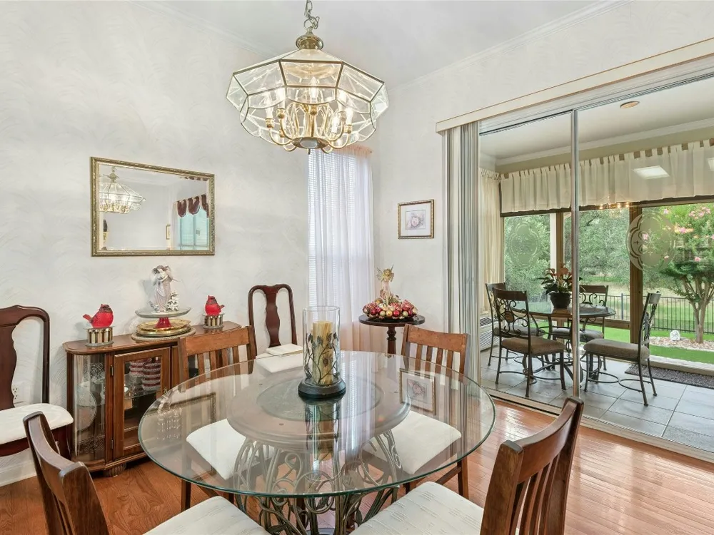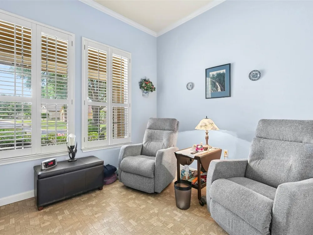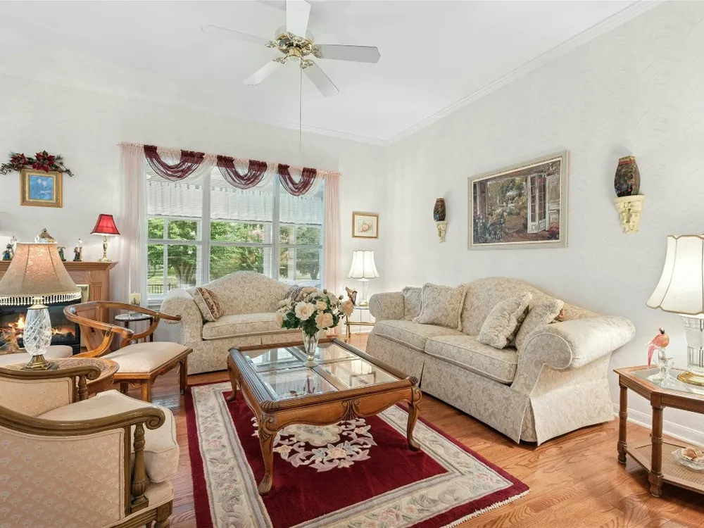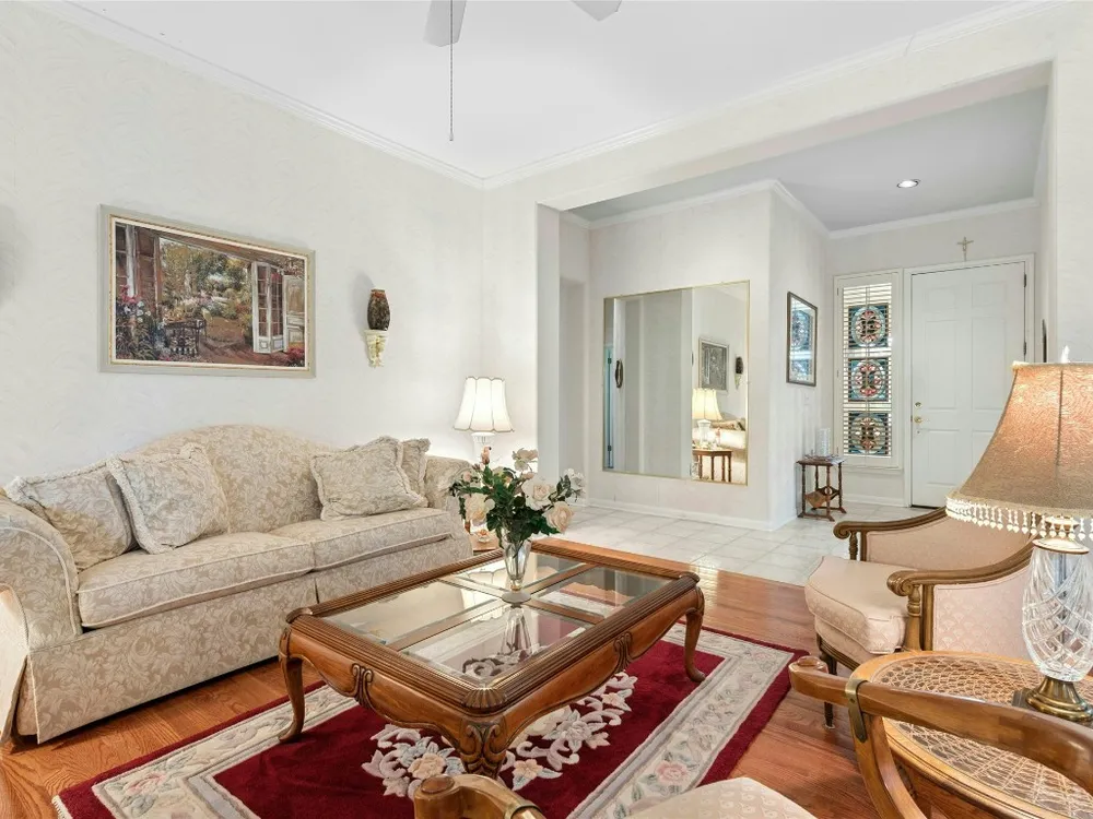 This popular 3-bedroom "Trinity" floor plan by Del Webb is full of natural light! 10' ceilings, crown molding, and hardwood floors in the living room and two bedrooms. The kitchen features white cabinets, quartz countertops, a composite sink, gas cooktop, and built-in stainless oven and microwave. Enjoy your morning coffee in the sunny bay window breakfast nook with plantation shutters and front yard views. The spacious main bedroom offers a retreat with its own bay window, peaceful greenbelt views, and a private bath featuring granite dual vanities, a stand-up shower and a jetted tub. The laundry room has a built-in desk and extra room ideal for hobby space or an additonal office. A 10' x 30' sunroom is heated and cooled for year-round comfort and it looks out onto the fully fenced backyard that backs to a quiet Sun City greenbelt. Extras include a decked attic with fan and a no-step extended garage with a side yard access door. 2024 Water Heater. 2016 Carrier HVAC. 2014 Replaced Roof.