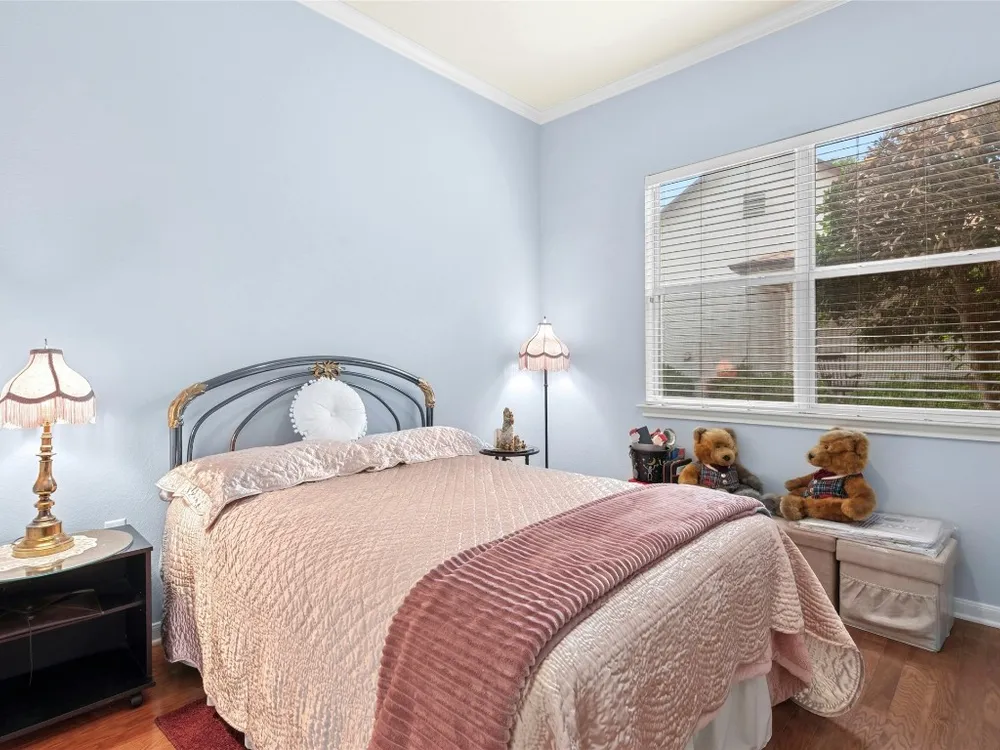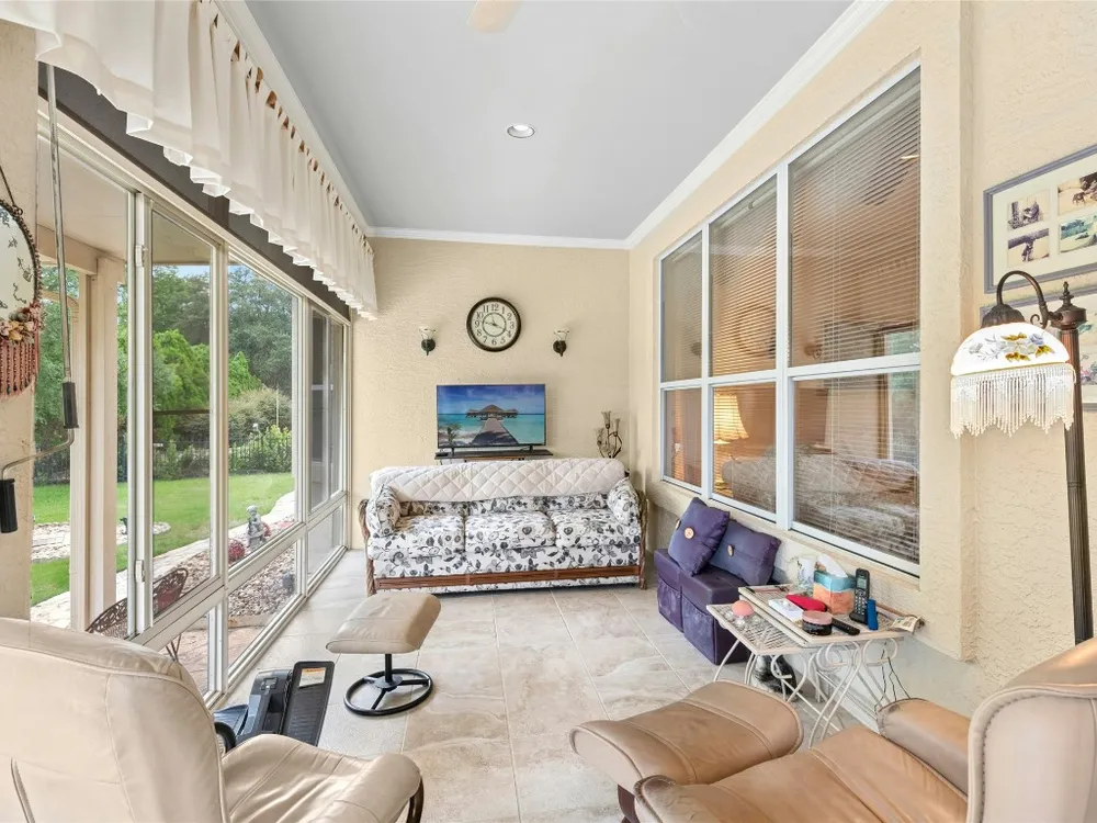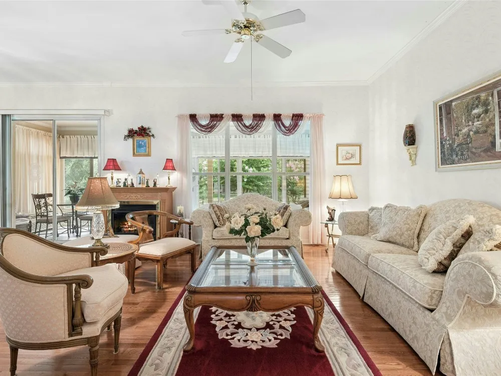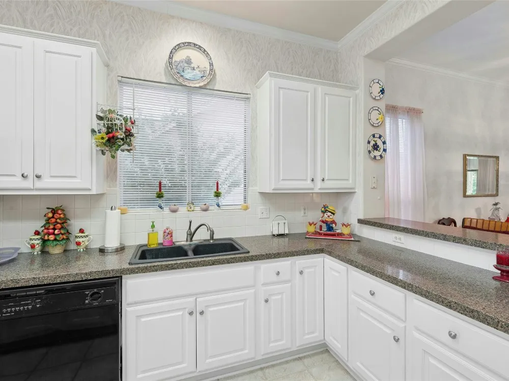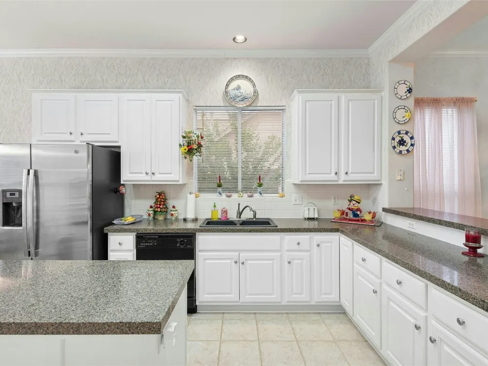 This popular 3-bedroom "Trinity" floor plan by Del Webb is full of natural light! 10' ceilings, crown molding, and hardwood floors in the living room and two bedrooms. The kitchen features white cabinets, quartz countertops, a composite sink, gas cooktop, and built-in stainless oven and microwave. Enjoy your morning coffee in the sunny bay window breakfast nook with plantation shutters and front yard views. The spacious main bedroom offers a retreat with its own bay window, peaceful greenbelt views, and a private bath featuring granite dual vanities, a stand-up shower and a jetted tub. The laundry room has a built-in desk and extra room ideal for hobby space or an additonal office. A 10' x 30' sunroom is heated and cooled for year-round comfort and it looks out onto the fully fenced backyard that backs to a quiet Sun City greenbelt. Extras include a decked attic with fan and a no-step extended garage with a side yard access door. 2024 Water Heater. 2016 Carrier HVAC. 2014 Replaced Roof.