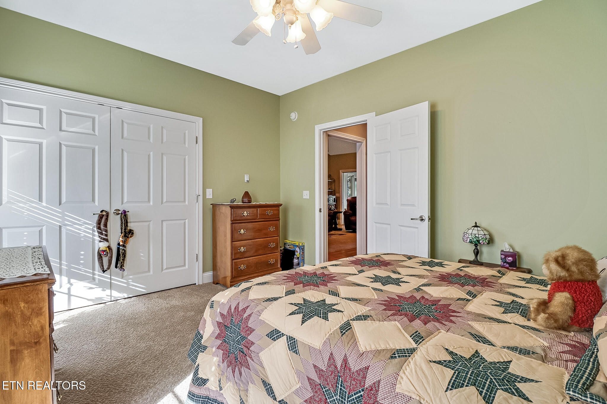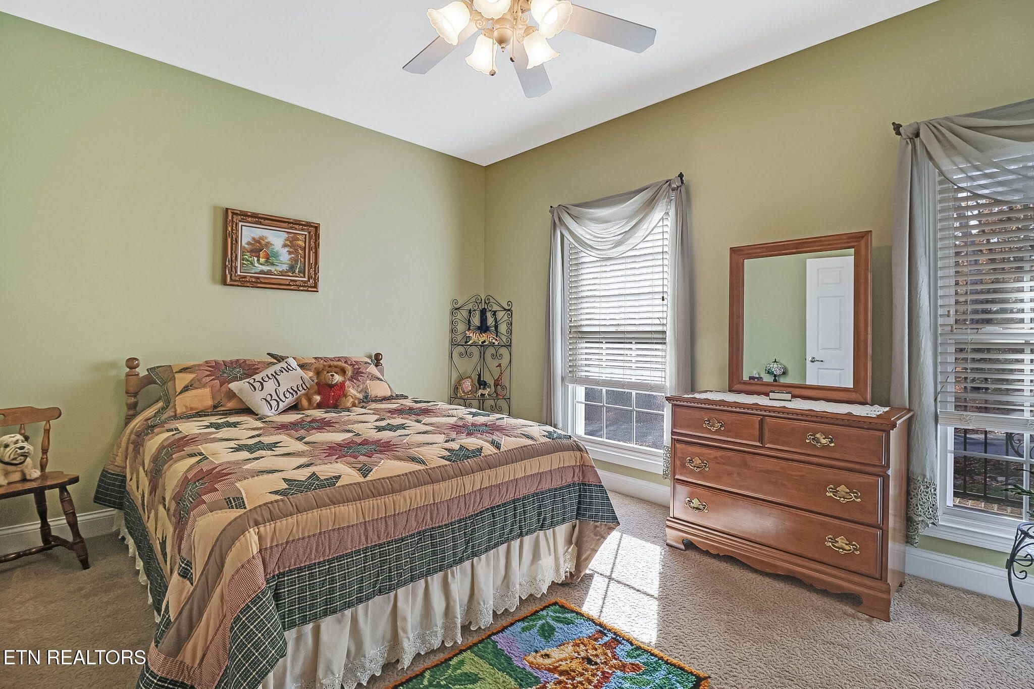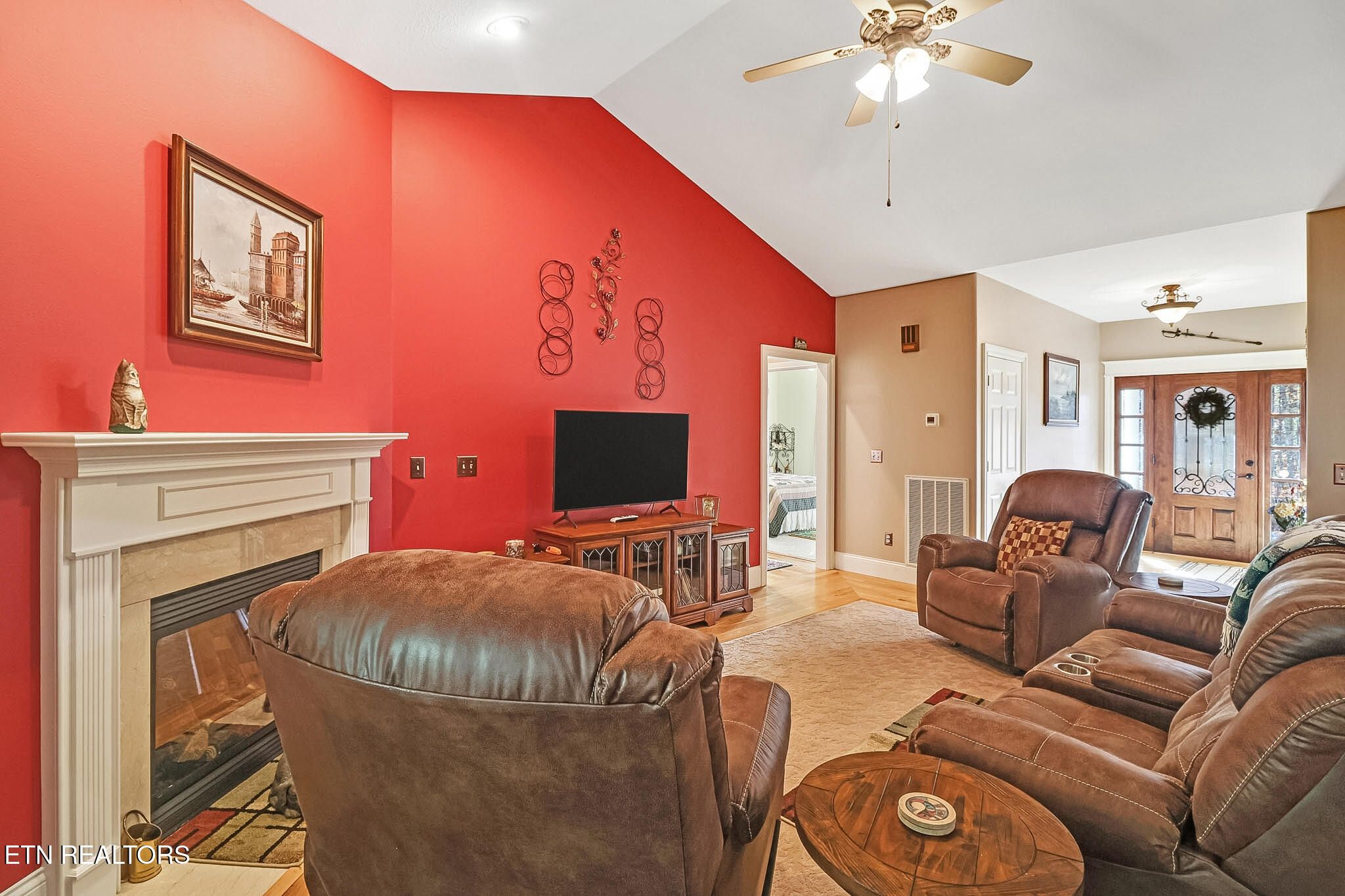 WOW FACTOR - CUSTOM FROM TOP TO BOTTOM - CONTRACTOR BUILT FOR HIMSELF WITH PROFESSIONAL DESIGNER ON THE JOB FROM START TO FINISH! Inside & out, attention to detail is evidence of the loving care & thought put into this three bedroom, two bath, 2,512 sf home. As you enter the spacious foyer French doors lead to dining or walk on straight into the family room where you gather in comfort & style thoughtfully designed for both relaxation & entertaining. A cozy gas log fireplace serves as the focal point, creating warmth & ambiance year-round. Elegant inlaid designer carpeting adds texture & sophistication, perfectly complementing the room's layout. Rich hardwood flooring provides timeless appeal & durability, balancing beauty with practicality. The inviting family room blends upscale finishes with everyday functionality. The gourmet kitchen is the heart of the residence, featuring a sunlit breakfast nook that offers a cozy retreat for morning coffee or casual family meals. A stylish kitchen bar provides the perfect space for entertaining guests, serving cocktails, or enjoying quick bites. With custom cabinetry, expansive countertops, state-of-the-art appliances, this kitchen blends functionality with elegance, making it ideal for both everyday living and special occasions. Imagine starting your day in a cheerful breakfast nook, bathed in natural light, then transitioning to the sleek kitchen bar, where friends gather as you prepare dinner. Together, these spaces create a warm balance of intimacy and lively interaction—perfect for both quiet mornings and vibrant evenings. Spacious pantry will be a fav for any chef! Refrigerator with 4 French doors & drawers, microwave w/convection oven, stove and Bosch dishwasher all convey to buyers. Step into elegance in the formal dining room ideal for hosting intimate dinners or festive gatherings, offering a stylish backdrop for every occasion where timeless architectural details meet modern comfort. Crown molding frames the ceiling with sophistication, adding a refined finish to the space. Wainscoting enhances the walls with classic character, creating a warm and inviting atmosphere. Gleaming hardwood floors provide both durability and beauty, perfectly complementing the room's design. Enjoy year-round comfort in the inviting four-season sunroom, designed to bring the outdoors inside. Expansive windows flood the space with natural light, offering panoramic views in every season. Climate control ensures the room is cozy in winter and cool in summer, making it a true all-weather retreat. Perfect for morning coffee, reading, or entertaining, this versatile space seamlessly connects indoor living with the outdoor beauty of nature. Open deck off of the sunroom is the ultimate blend of relaxation and practicality, adding exceptional value and charm to the home. The master suite has triple trey ceiling with crown molding and walk-in closet. Indulge in spa-like luxury with this beautifully appointed master bath combining comfort and sophistication, creating a private retreat. Relax in the jetted tub, perfect for unwinding after a long day. Refresh in the spacious walk-in tile shower, designed with both style and convenience in mind. Elegant tile floors provide durability and timeless appeal. Dual sinks offer functionality and ease, making mornings effortless for two. Split bedroom floor plan ensures privacy, making it perfect for hosting guests. Separate laundry room adds functionality and ease to daily living. An oversized two-car garage with built in storage shelves. An extra-large stamped concrete driveway & apron, walkways, & welcoming covered front porch, along with a spacious workshop in the partially finished basement, complete this wonderful home. Fairfield offers 5 golf courses, hiking trails, swimming pools, lakes w/two marinas, in & out tennis. Come see this lovely home you will want to stay in a place we call 'The Front Porch of Heaven!'