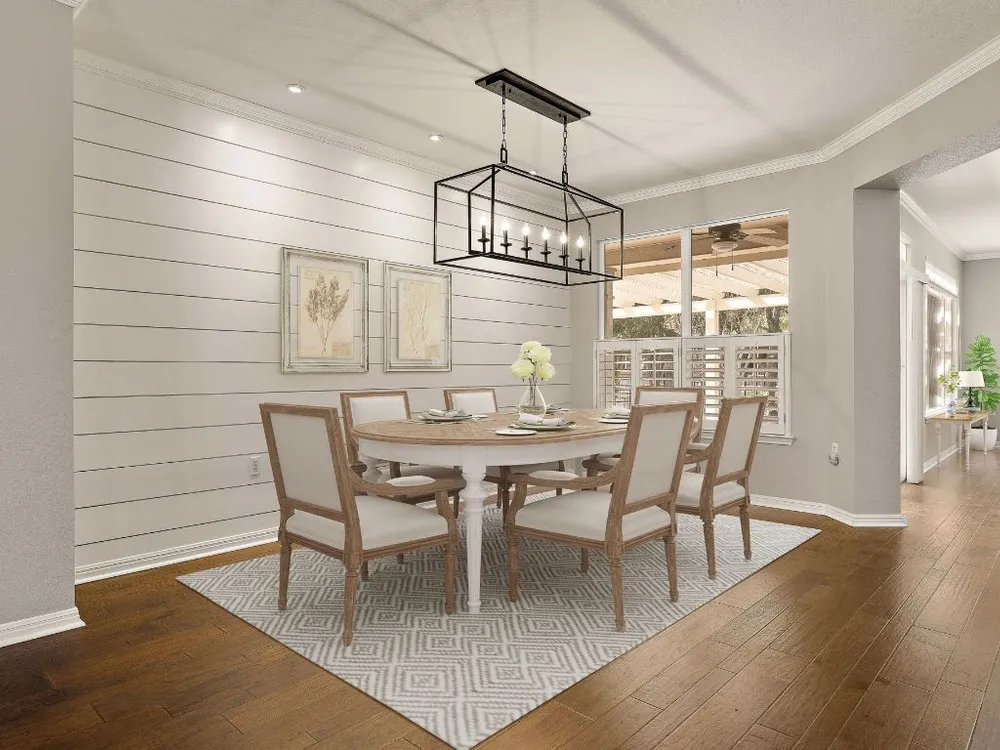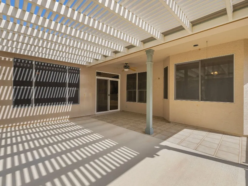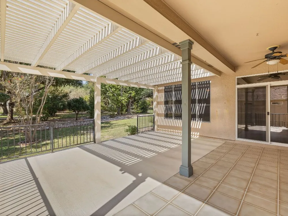 Welcome to this beautifully updated 3-bedroom, 2.5-bath Travis floorplan in the highly desirable Sun City 55+ Active Adult Community. Nestled on a quiet, low-traffic street, this home offers comfort, style, and thoughtful features throughout. Step inside to find rich wood flooring that enhances the spacious, versatile living area. The open-concept design includes a gas log fireplace with built-ins, seamlessly flowing into a well-appointed kitchen , slide-out cabinetry, and refrigerator included. The dining room stands out with its shiplap-style accent wall and updated lighting, creating a warm and inviting gathering space. Enjoy the charm of cafe-style plantation shutters in the front rooms, while expansive back windows fill the home with natural light and tranquil views of the fenced yard. Both the guest bath and powder bath have been beautifully updated, offering a fresh, modern touch. Outdoors, relax on the large covered patio with pergola, perfect for morning coffee or evening gatherings. The deep, tree-dotted backyard provides privacy and space, while the xeriscape front yard keeps maintenance a breeze. With many wonderful updates already completed, this home is move-in ready—leaving you the fun of customizing your dream primary suite. The location is top notch with Williams Drive and Walgreens being a short drive.