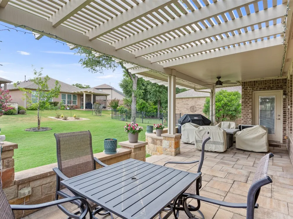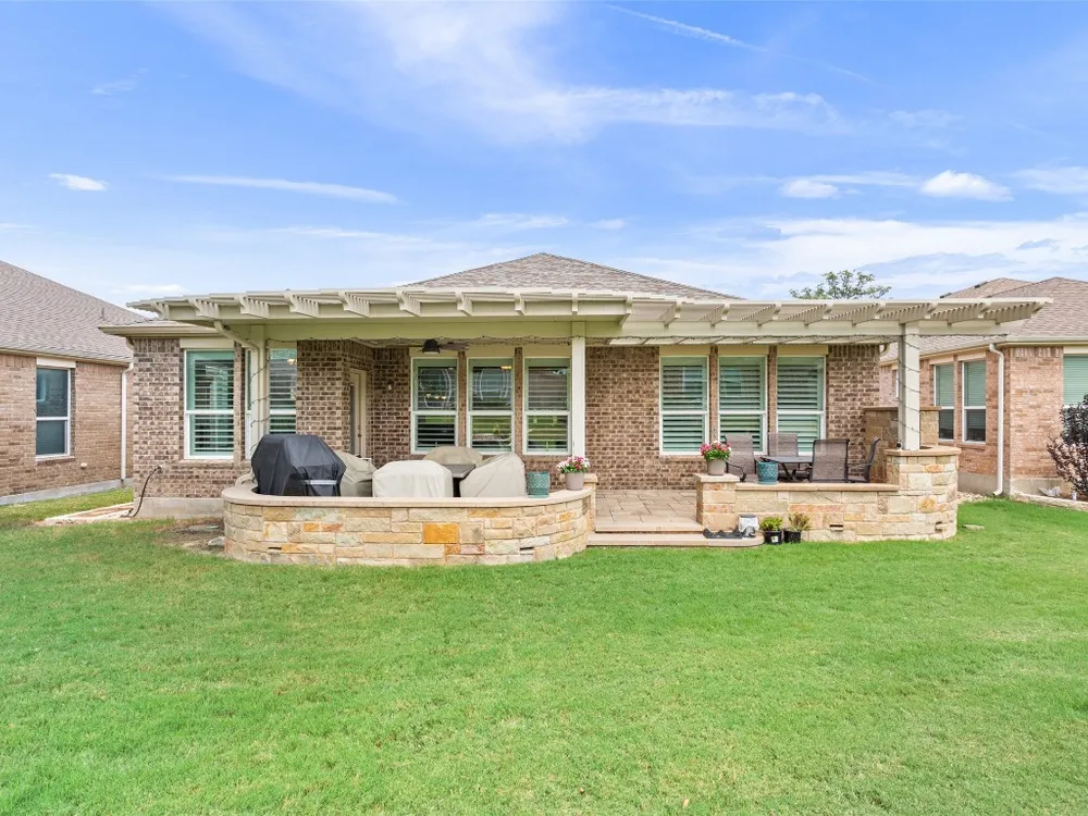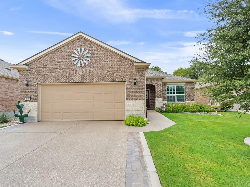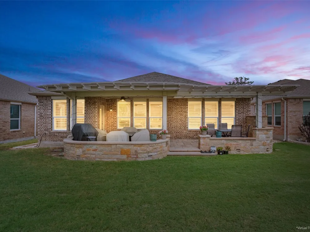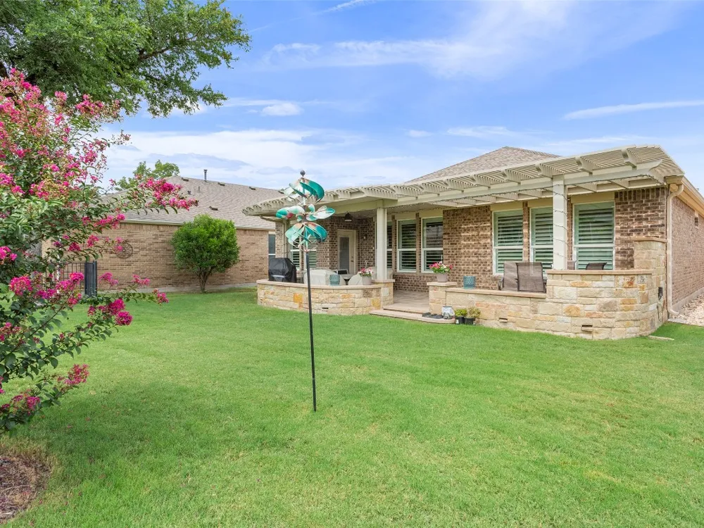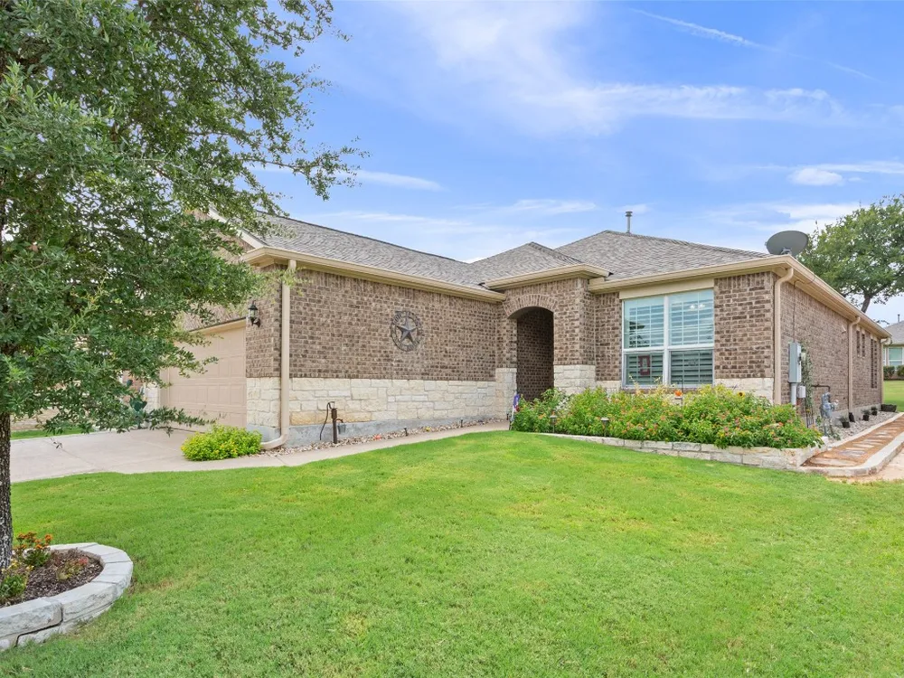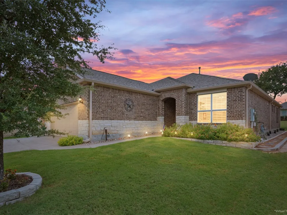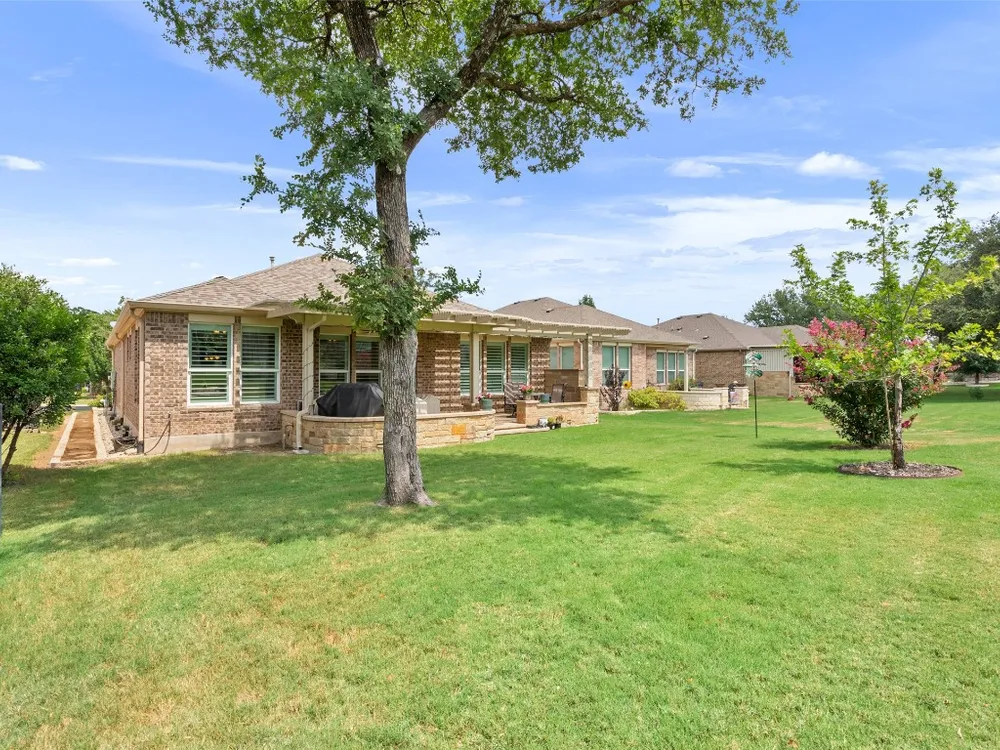 Tucked away on a serene cul-de-sac, this beautifully maintained Castle Rock floor plan blends timeless style with thoughtful upgrades. From the moment you enter, you’ll notice the warmth of engineered wood floors in the living areas and the soft glow of natural light filtered through plantation shutters. The heart of the home is the chef-inspired kitchen, where granite countertops, stainless steel appliances, a walk-in pantry, and pendant lights over the breakfast bar invite gatherings both big and small. The adjoining living room, graced with a tray ceiling, flows easily into a sunroom—an inviting space to enjoy your morning coffee or lose yourself in a good book. Your private primary suite is a true retreat, featuring a tray ceiling, ceiling fan, and Closets by Design custom shelving in the walk-in closet. The primary bath offers dual sinks and an impressive spa shower with three shower heads, creating a luxurious start and end to each day. Work from home or pursue your passions in the designated study, while ceiling fans throughout keep the home comfortable year-round. Step outside to discover a 380 sq. ft. extended covered patio complete with a gas stub and seat wall—ideal for alfresco dining or simply savoring the Texas sunsets. Practical upgrades include an extended garage with built-in Pelican saltless water softener and whole-home filter, storage racks, and a driveway and walkway sealed with Kool Coat. Brick surrounds all sides of the home, and a ribbon of bricks has been added along the driveway for extra width. A 2020 roof ensures peace of mind. Located just minutes from the Cowan Activity Center and The Retreat Activity Center, this home offers not only comfort and convenience but also a sense of community. The kitchen refrigerator conveys. This home is move-in ready, so you can immediately start living the active Sun City retirement lifestyle.