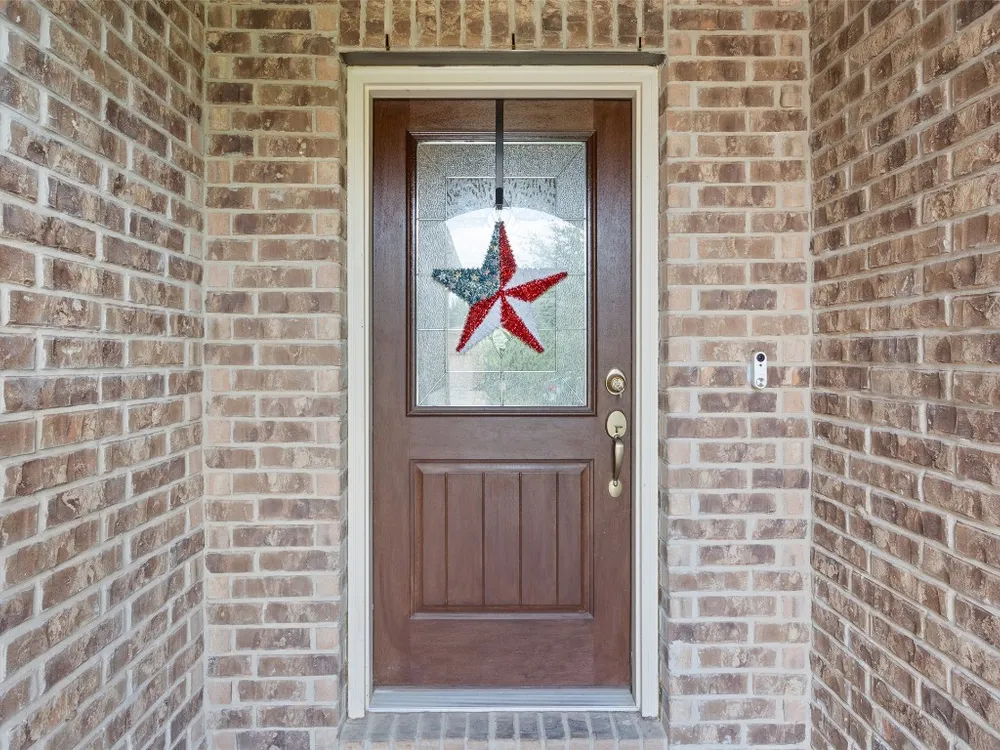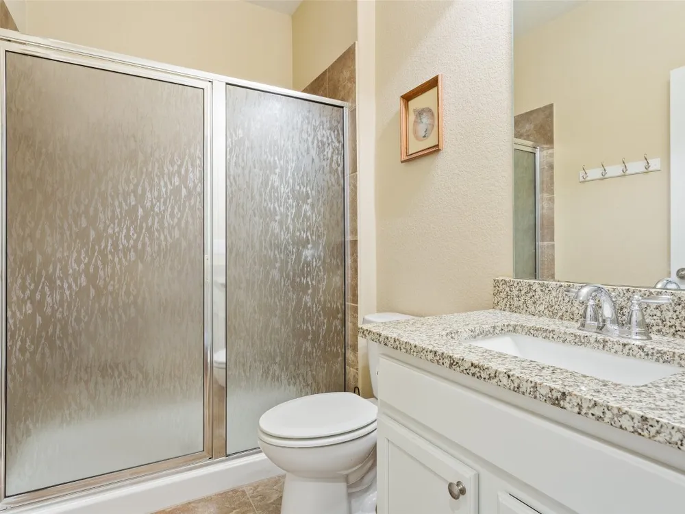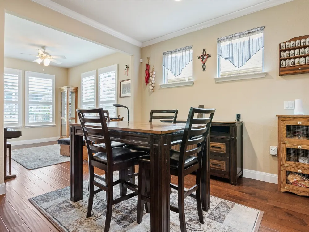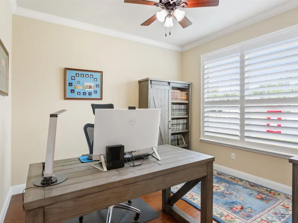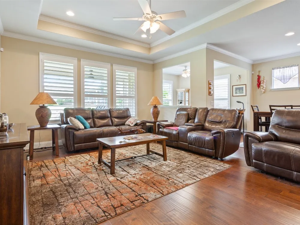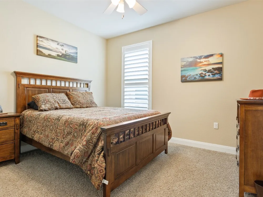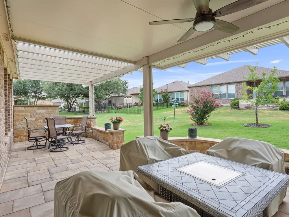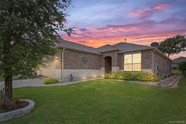 Tucked away on a serene cul-de-sac, this beautifully maintained Castle Rock floor plan blends timeless style with thoughtful upgrades. From the moment you enter, you’ll notice the warmth of engineered wood floors in the living areas and the soft glow of natural light filtered through plantation shutters. The heart of the home is the chef-inspired kitchen, where granite countertops, stainless steel appliances, a walk-in pantry, and pendant lights over the breakfast bar invite gatherings both big and small. The adjoining living room, graced with a tray ceiling, flows easily into a sunroom—an inviting space to enjoy your morning coffee or lose yourself in a good book. Your private primary suite is a true retreat, featuring a tray ceiling, ceiling fan, and Closets by Design custom shelving in the walk-in closet. The primary bath offers dual sinks and an impressive spa shower with three shower heads, creating a luxurious start and end to each day. Work from home or pursue your passions in the designated study, while ceiling fans throughout keep the home comfortable year-round. Step outside to discover a 380 sq. ft. extended covered patio complete with a gas stub and seat wall—ideal for alfresco dining or simply savoring the Texas sunsets. Practical upgrades include an extended garage with built-in Pelican saltless water softener and whole-home filter, storage racks, and a driveway and walkway sealed with Kool Coat. Brick surrounds all sides of the home, and a ribbon of bricks has been added along the driveway for extra width. A 2020 roof ensures peace of mind. Located just minutes from the Cowan Activity Center and The Retreat Activity Center, this home offers not only comfort and convenience but also a sense of community. The kitchen refrigerator conveys. This home is move-in ready, so you can immediately start living the active Sun City retirement lifestyle.
