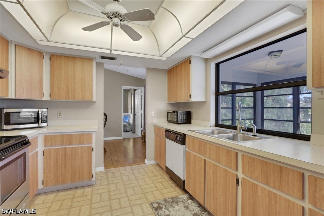 Welcome to 105 Montaubon Ct., nestled in the desirable 55+ community of Riviera Golf Estates in beautiful Naples, Florida. This charming single-story ranch-style home offers 3 bedrooms, 2 bathrooms, plus a spacious family room, all thoughtfully designed with a split floor plan for added privacy and comfort. Step inside to discover a generously sized living room perfect for entertaining with adjacent spacious dining area, along with a large primary suite featuring dual walk-in closets and an ensuite bathroom complete with a convenient walk-in shower. The home boasts upgraded laminate flooring in the living and dining areas, bringing warmth and character to the space, while large living room windows and strategically placed skylights invite in abundant natural light. Additional highlights include a bright and airy Florida room with classic jalousie windows, a two-car garage, and a landscaping irrigation system and well with a brand-new pump for efficient landscape watering and long term savings and just step outside your back door and enjoy your own mature mango tree—perfect for soaking up the Florida lifestyle. Located in a highly active and welcoming community, residents enjoy an impressive array of amenities, including a newer heated saltwater pool with lap lanes, tennis, pickleball, and shuffleboard courts, bocce, a fitness room, billiards, and a large clubhouse that hosts a variety of social events and activities. With an exceptionally low HOA fee of just $144 per month—including basic internet—this property offers incredible value. While the home does need some TLC, it presents a fantastic opportunity to customize and make it your own in one of Naples’ most vibrant 55+ communities. Ideally located, this home is just 5.5 miles from Fifth Avenue South, known for its world-class shopping and dining, and only 6.5 miles from Naples’ stunning Gulf beaches. Plus, everyday conveniences including shopping, galleries, restaurants and more are just minutes away. Don’t miss your chance to enjoy relaxed, resort-style living in sunny Southwest Florida!