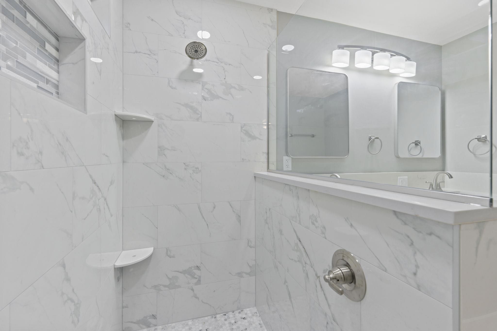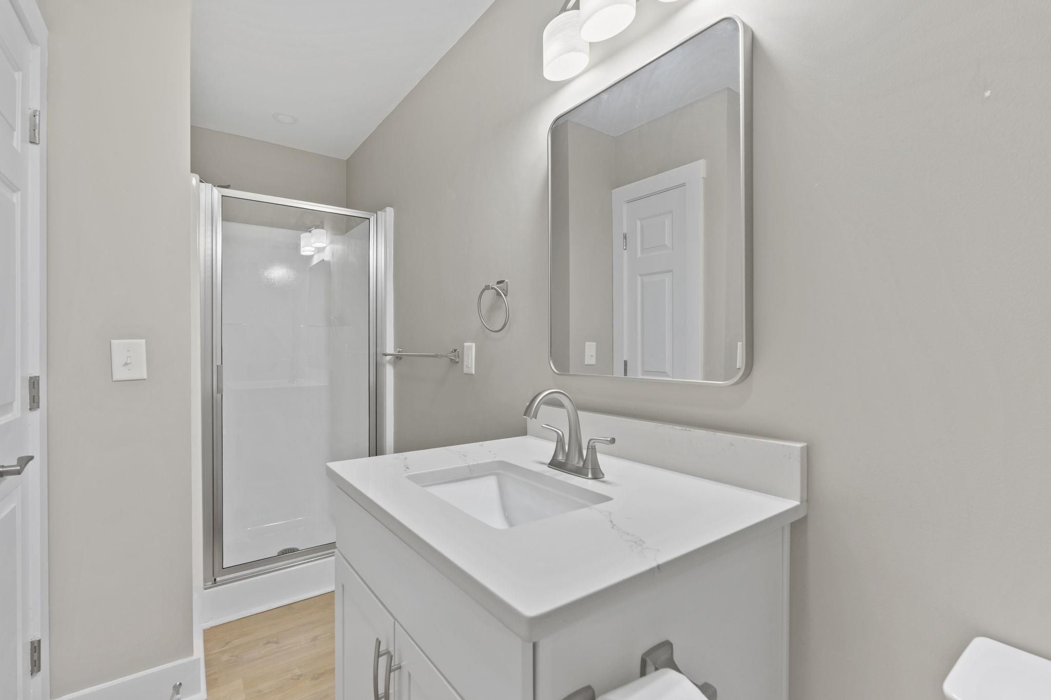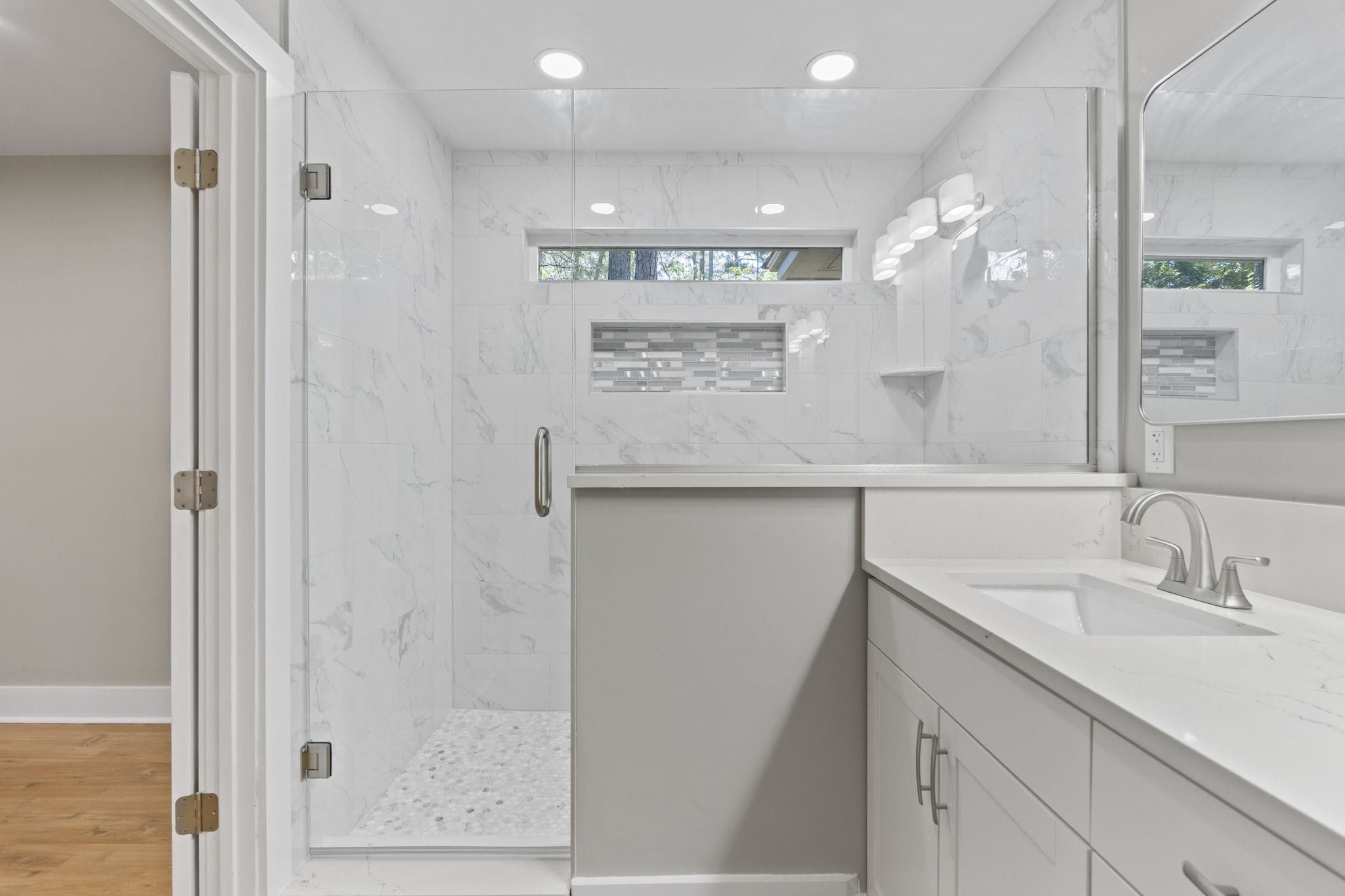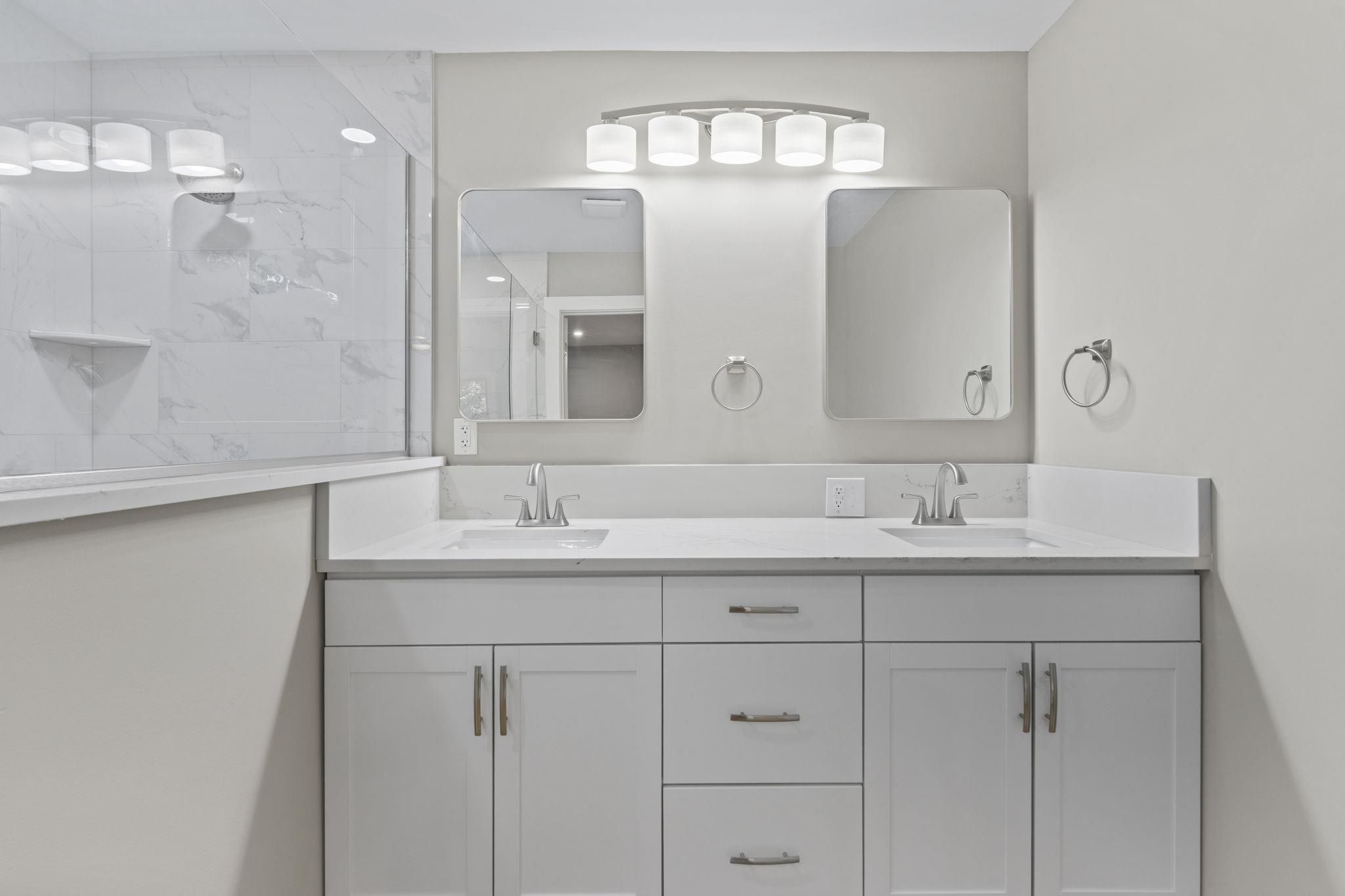 - Dual Sinks, Main Level Primary, Split Bedrooms, Separate Shower, Vanity, Walk-In Closet(s), Bedroom on Main Level, Solid Surface Counters
