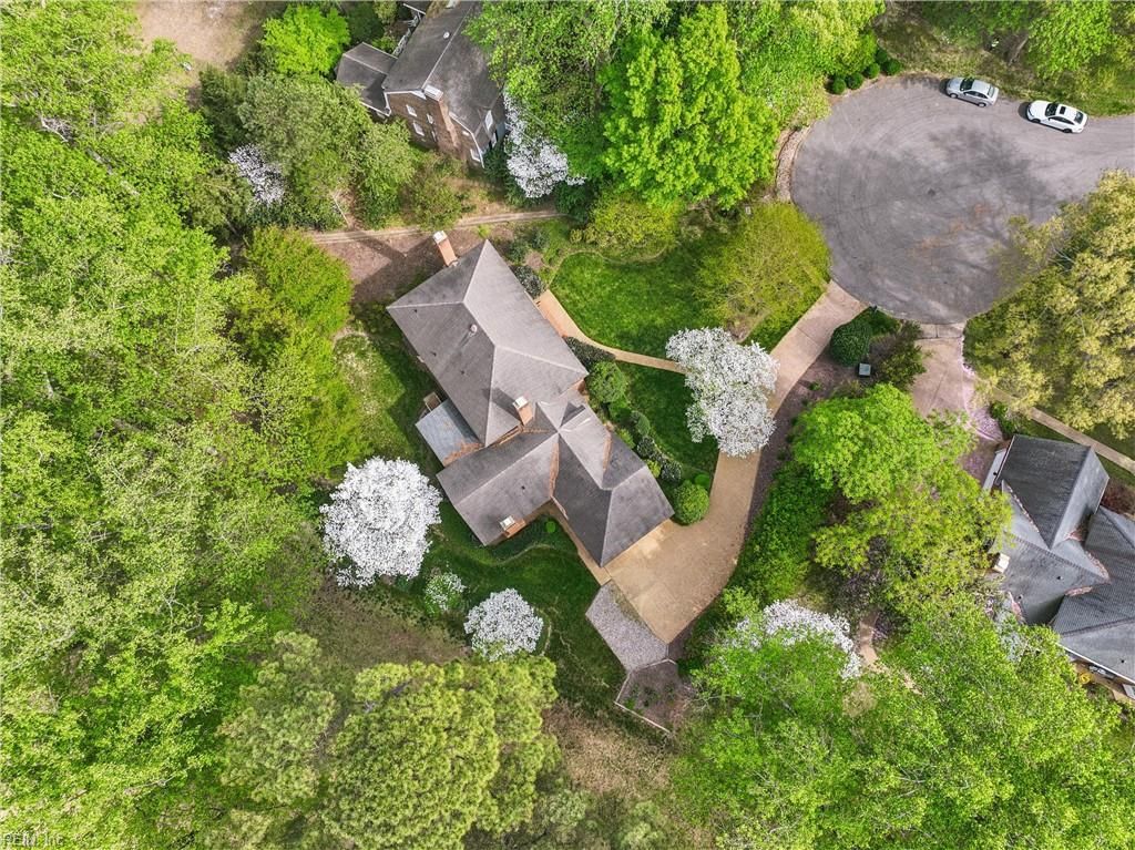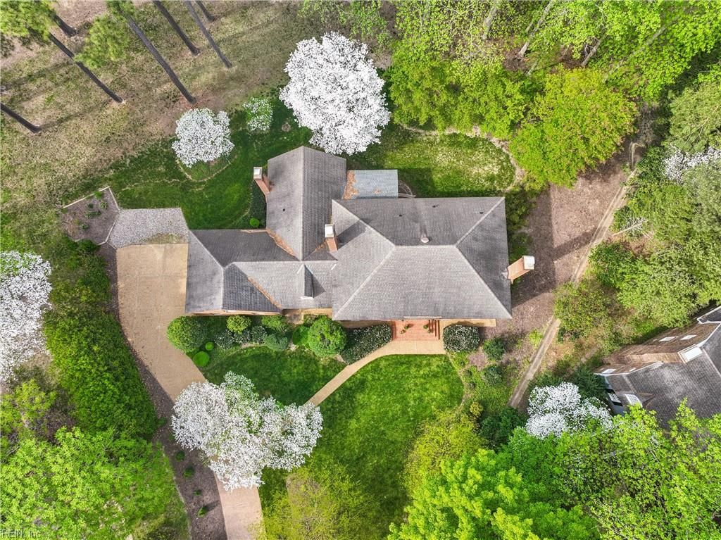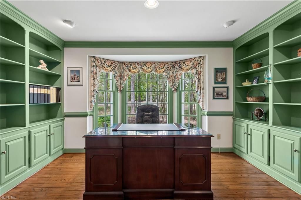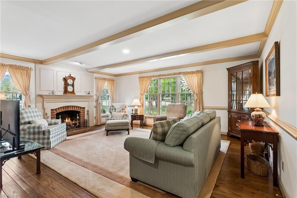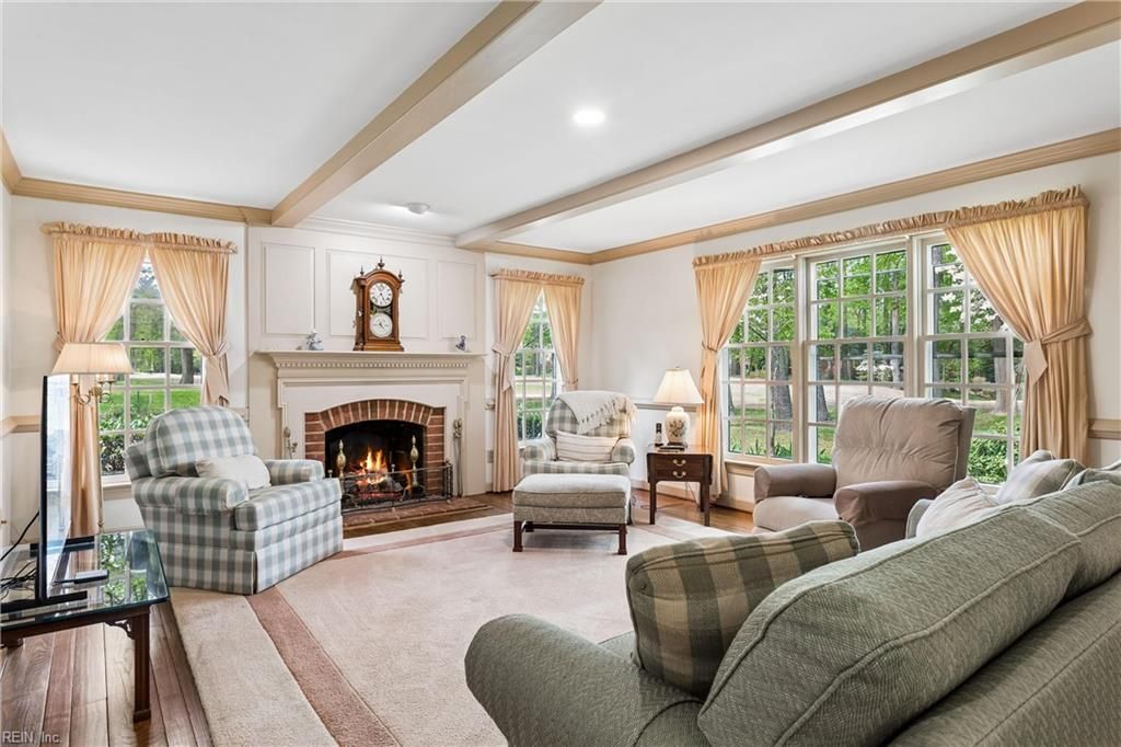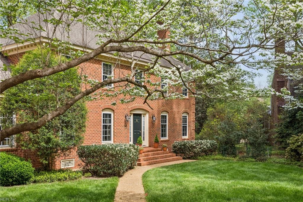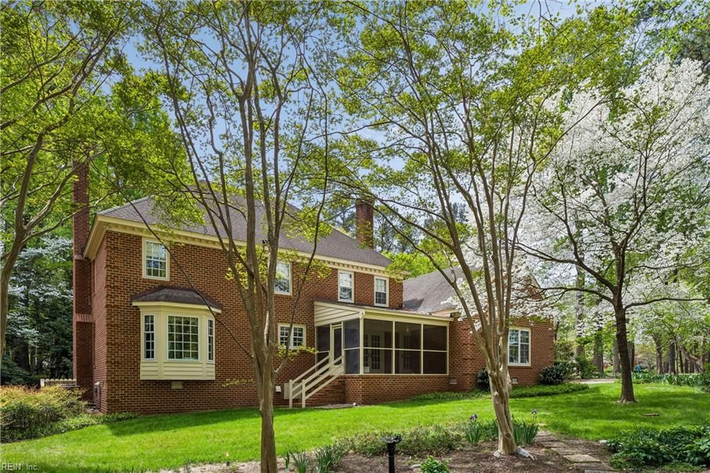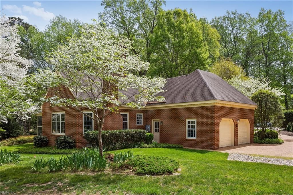 Ronald Curtis custom brick home on a quiet cul-de-sac between the 6th and 7th fairways of the Kingsmill River Course. One-owner residence features random-width hardwoods and custom cherry cabinets from Lancaster County, PA. Kitchen includes a new GE Cafe refrigerator and cabinets with removable stained-glass inserts. The great room offers beamed ceilings and a brick fireplace, plus a formal living room with a second marble fireplace.The floor plan allows a main-level bedroom conversion as the dining room sits adjacent to a full bath and large closet. The study can transition to a dining space; removing built-ins reveals 2ft of extra depth over finished drywall. Upstairs, the primary suite has two walk-in closets. The massive 4th bedroom has dual staircases and attic access for a potential en-suite addition.Garage includes a contained workshop with professional ventilation/exhaust. Updates include a 2024 upstairs HVAC and a 40-year roof.