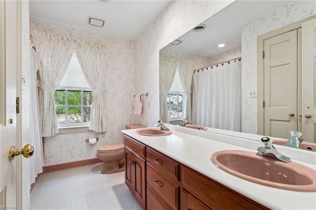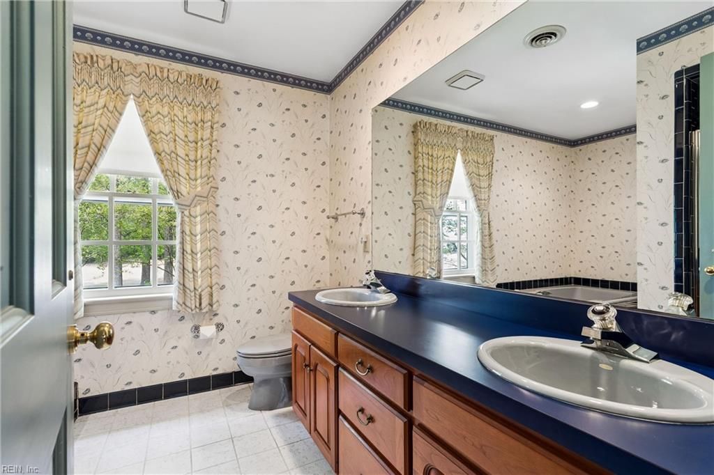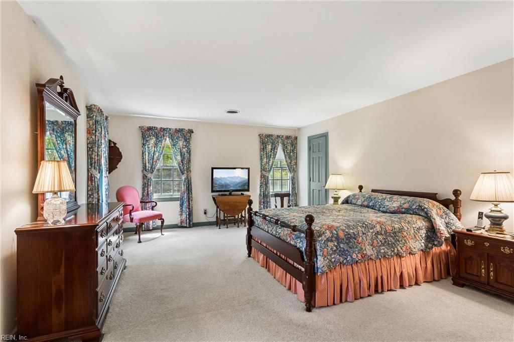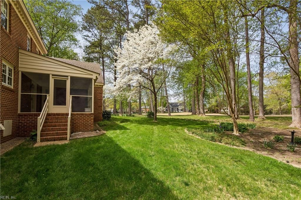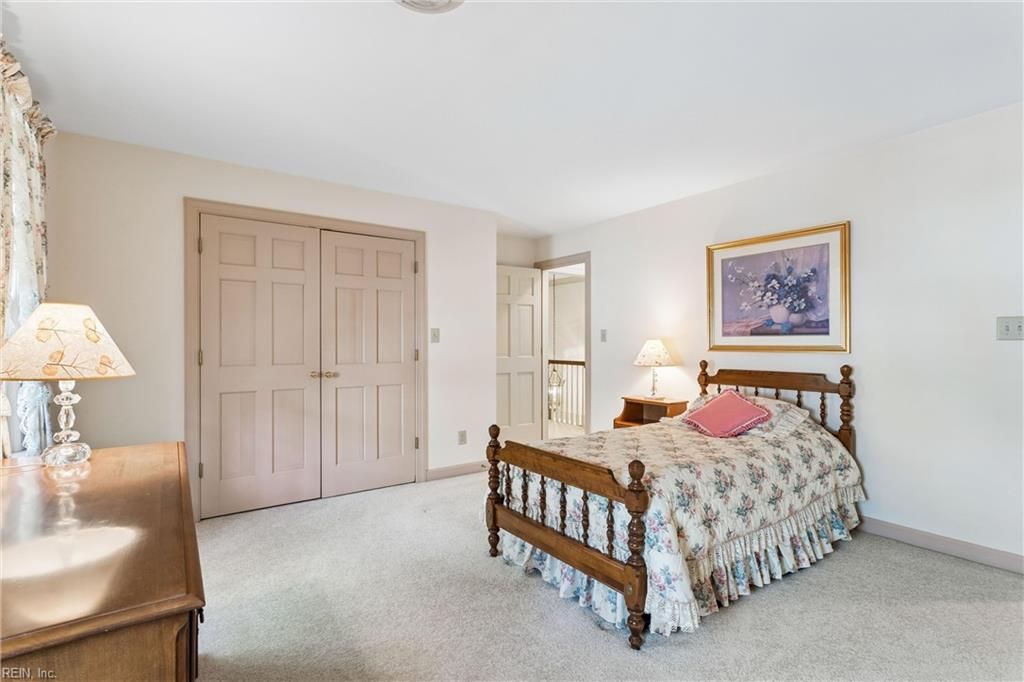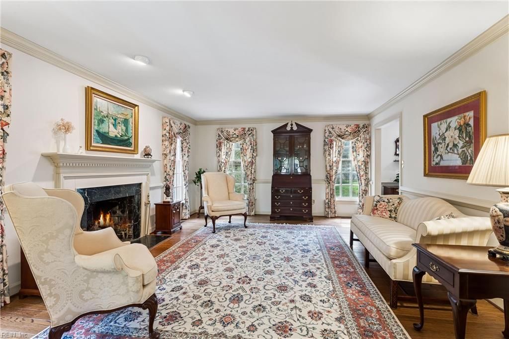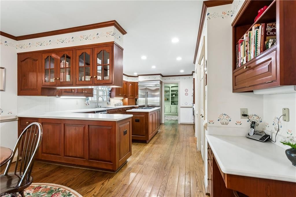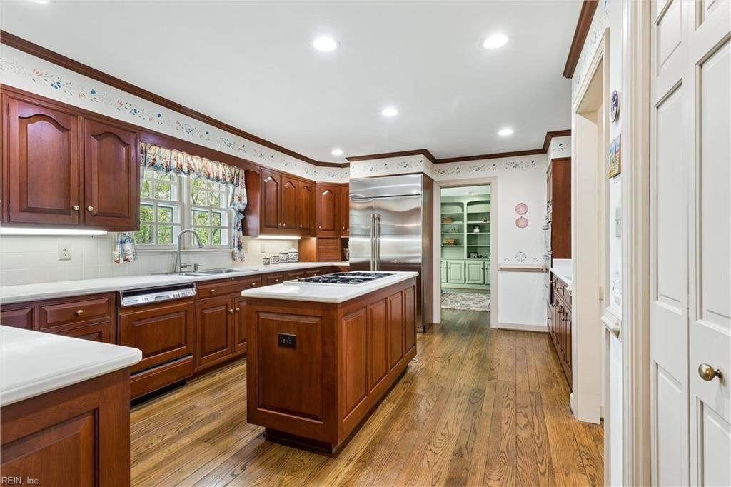 Ronald Curtis custom brick home on a quiet cul-de-sac between the 6th and 7th fairways of the Kingsmill River Course. One-owner residence features random-width hardwoods and custom cherry cabinets from Lancaster County, PA. Kitchen includes a new GE Cafe refrigerator and cabinets with removable stained-glass inserts. The great room offers beamed ceilings and a brick fireplace, plus a formal living room with a second marble fireplace.The floor plan allows a main-level bedroom conversion as the dining room sits adjacent to a full bath and large closet. The study can transition to a dining space; removing built-ins reveals 2ft of extra depth over finished drywall. Upstairs, the primary suite has two walk-in closets. The massive 4th bedroom has dual staircases and attic access for a potential en-suite addition.Garage includes a contained workshop with professional ventilation/exhaust. Updates include a 2024 upstairs HVAC and a 40-year roof.