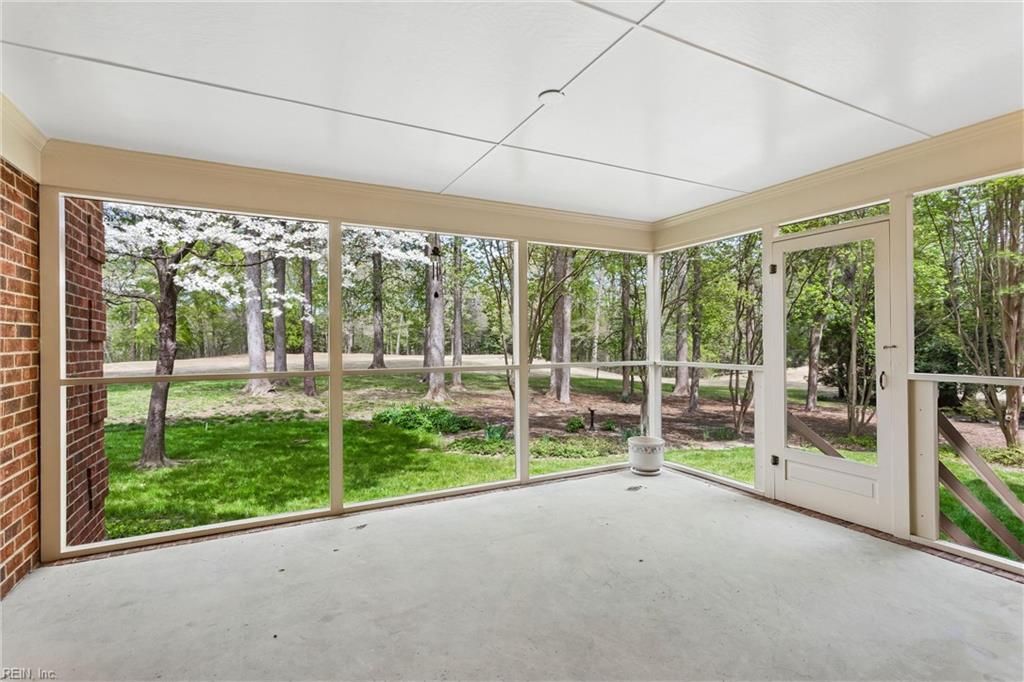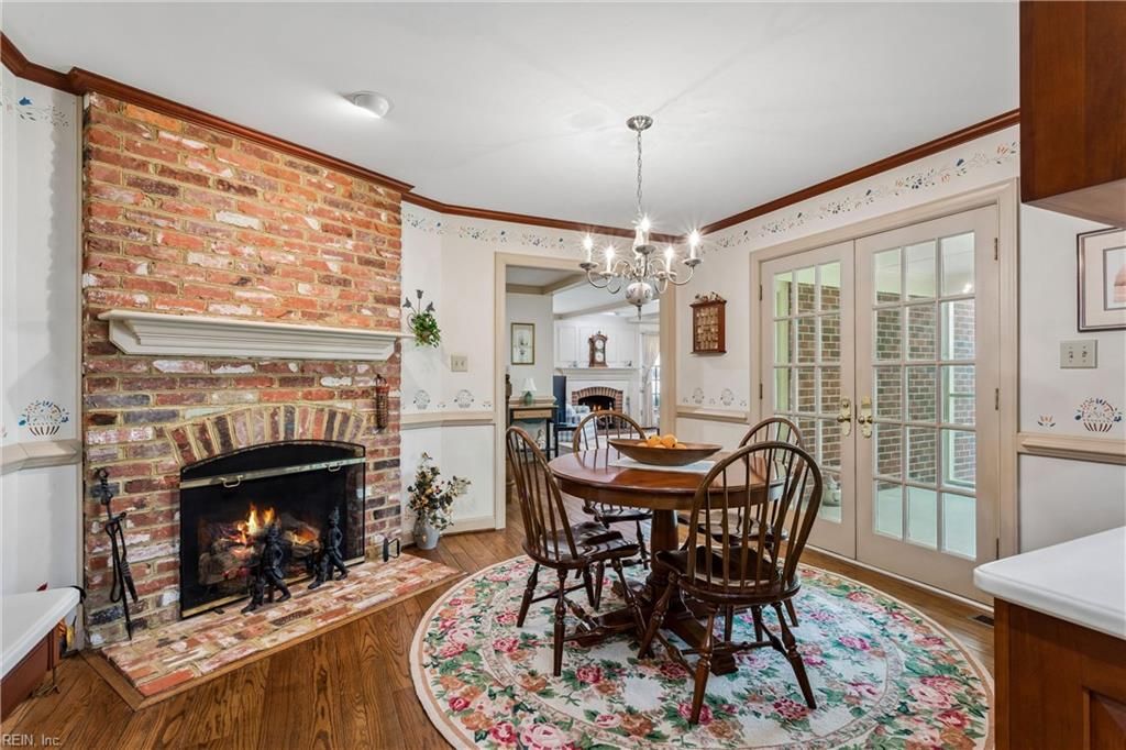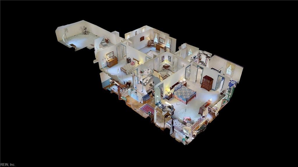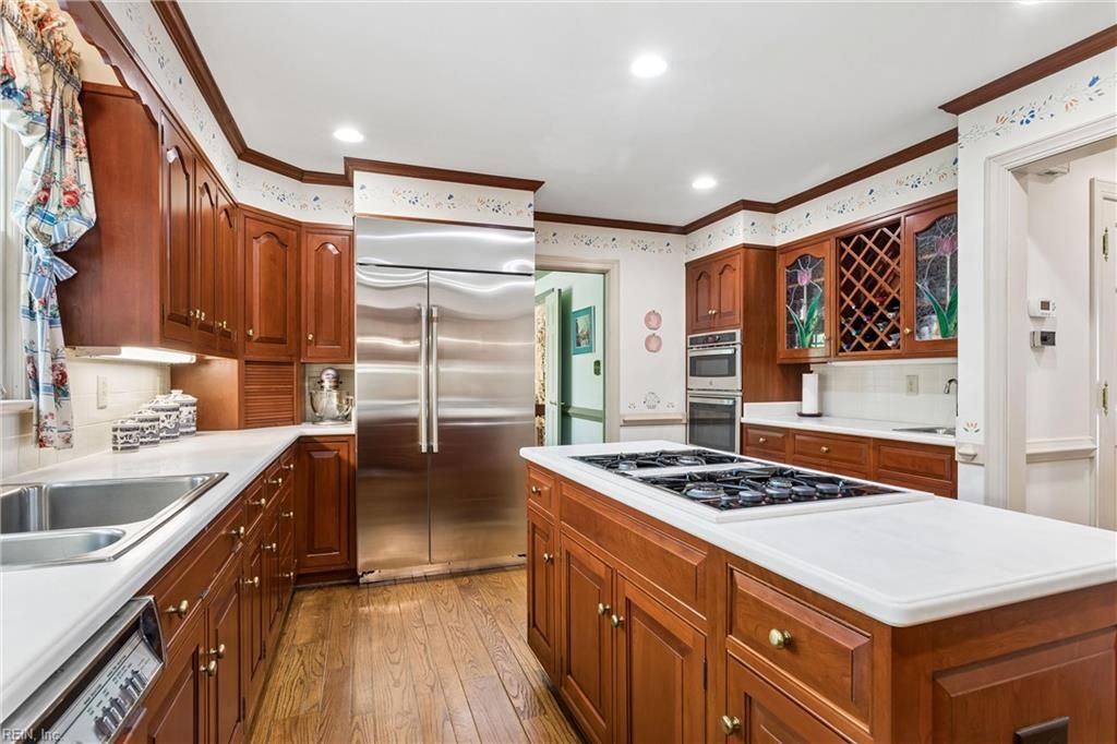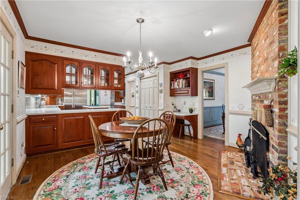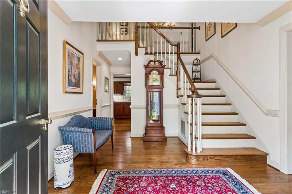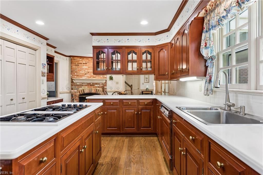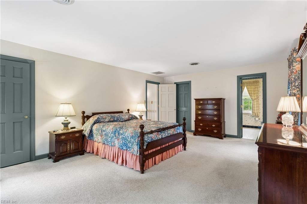 Ronald Curtis custom brick home on a quiet cul-de-sac between the 6th and 7th fairways of the Kingsmill River Course. One-owner residence features random-width hardwoods and custom cherry cabinets from Lancaster County, PA. Kitchen includes a new GE Cafe refrigerator and cabinets with removable stained-glass inserts. The great room offers beamed ceilings and a brick fireplace, plus a formal living room with a second marble fireplace.The floor plan allows a main-level bedroom conversion as the dining room sits adjacent to a full bath and large closet. The study can transition to a dining space; removing built-ins reveals 2ft of extra depth over finished drywall. Upstairs, the primary suite has two walk-in closets. The massive 4th bedroom has dual staircases and attic access for a potential en-suite addition.Garage includes a contained workshop with professional ventilation/exhaust. Updates include a 2024 upstairs HVAC and a 40-year roof.