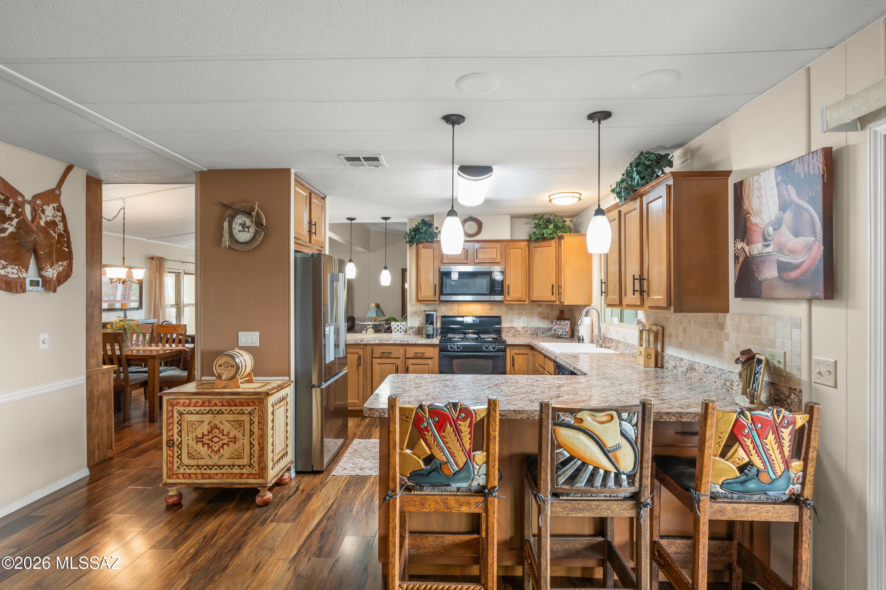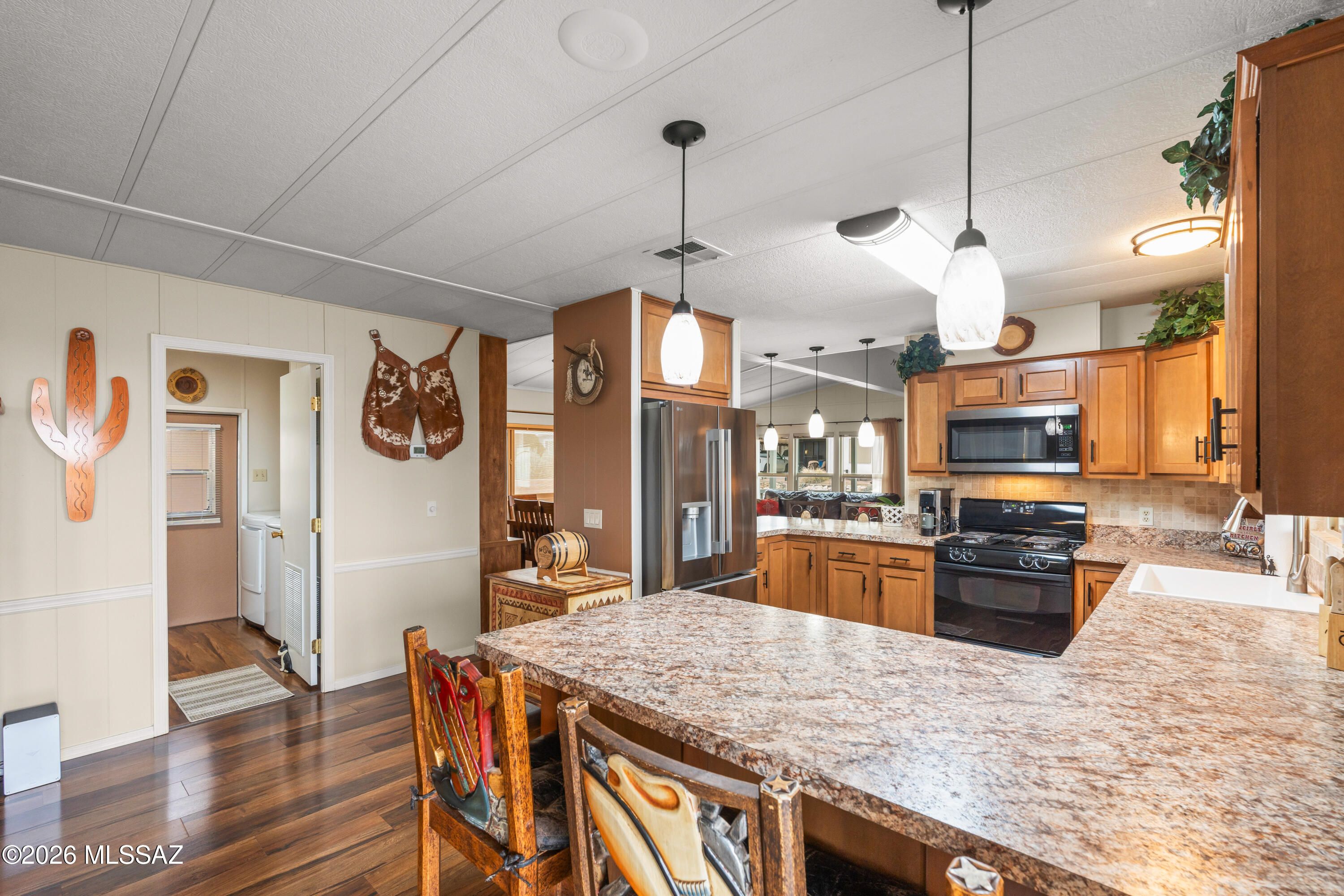 What a pleasant surprise when you step into this remarkably remodeled home-you'll think you're in a fancy AirBnB. The living area and quality laminate flooring throughout greet you. The kitchen with newer stainless appliances and pendant lights set the stage for fun gatherings w/2 seating bars. The separate laundry room w/pantry is a nice added feature. The sparkling primary and guest bathrooms have been upgraded. Step out through the slider to your private patio with the backyard covered with artificial turf for a clean, pleasant area to relax.The workshop (''Man Cave'') with counter & cabinets is at the end of the patio to use as you wish. And the 2-car garage with Kobalt cabinets and storage is a definite luxury in this neighborhood. Ask for the complete and extensive list of upgrades