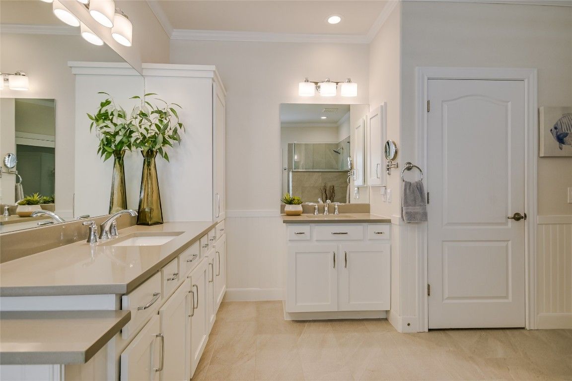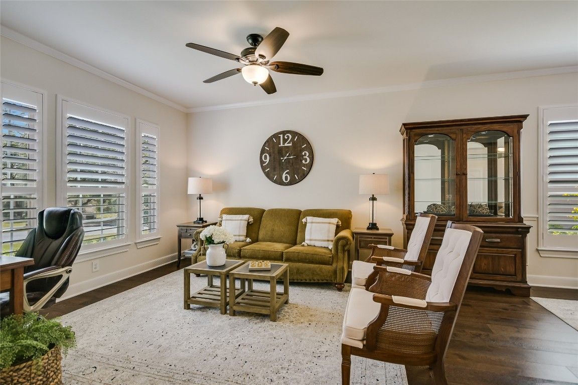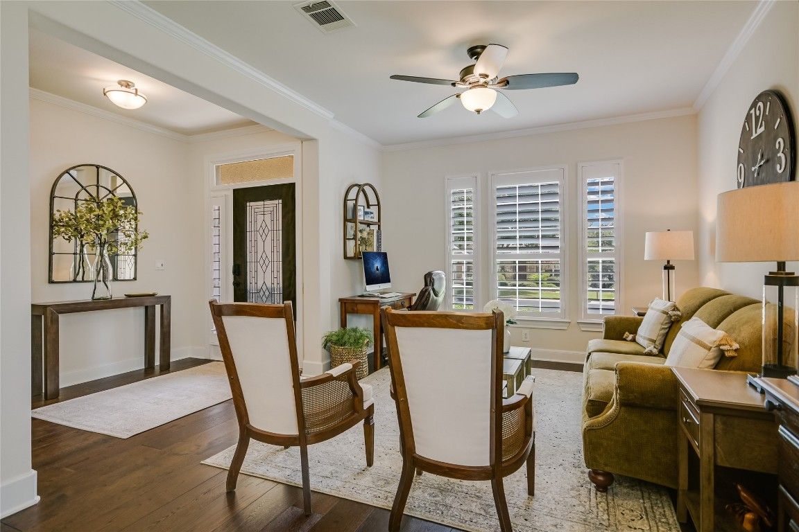 - Ceiling Fan(s), Crown Molding, Main Level Primary, NoInteriorSteps, Quartz Countertops
