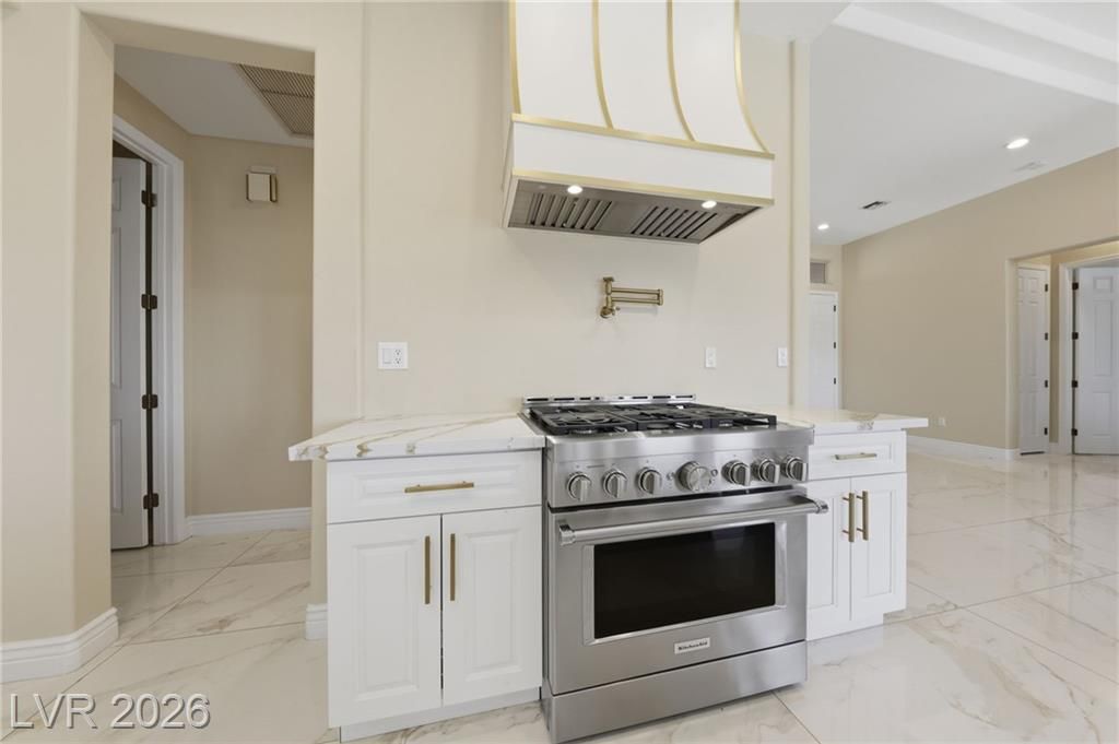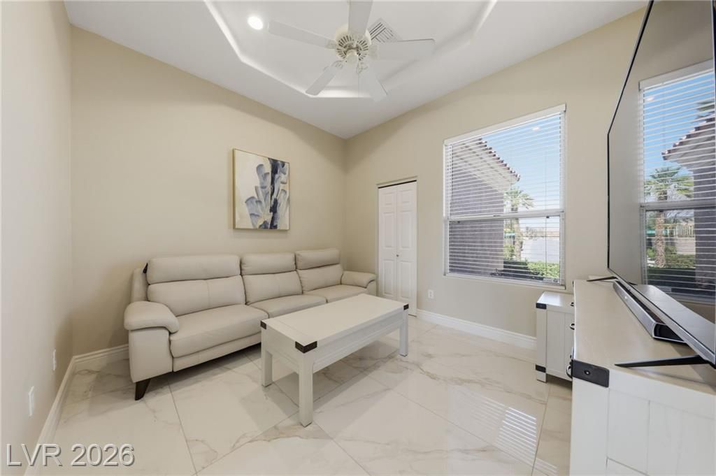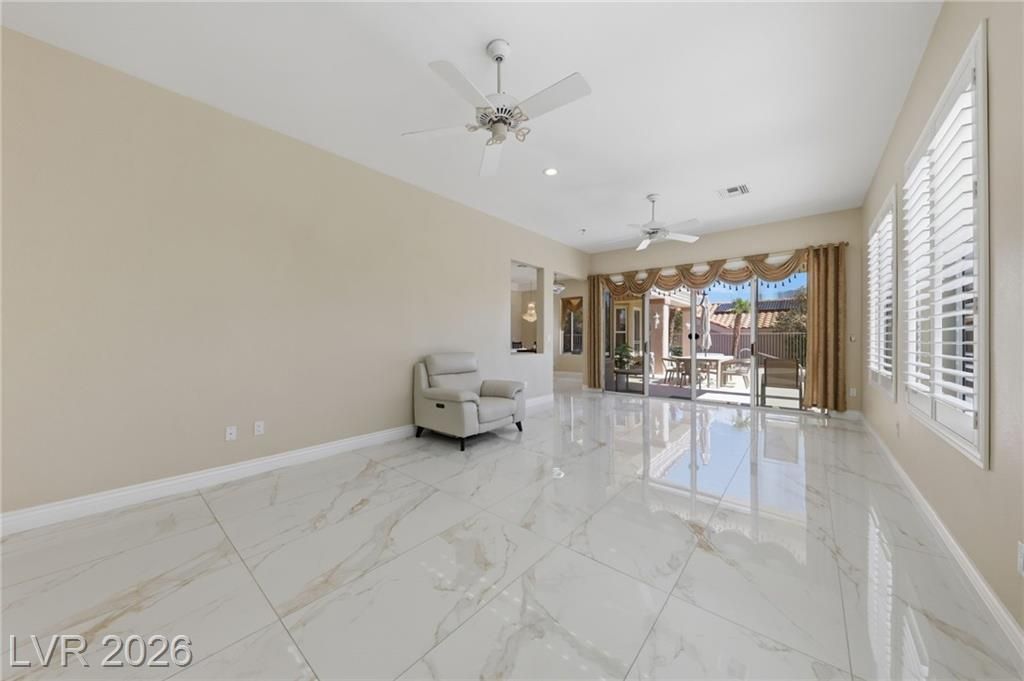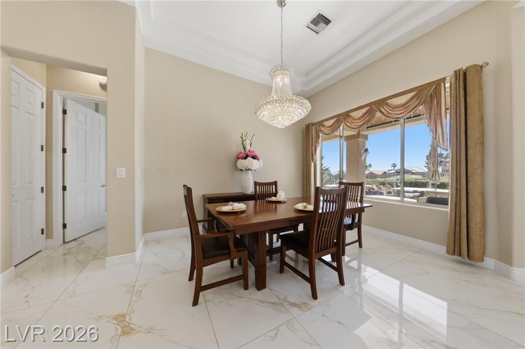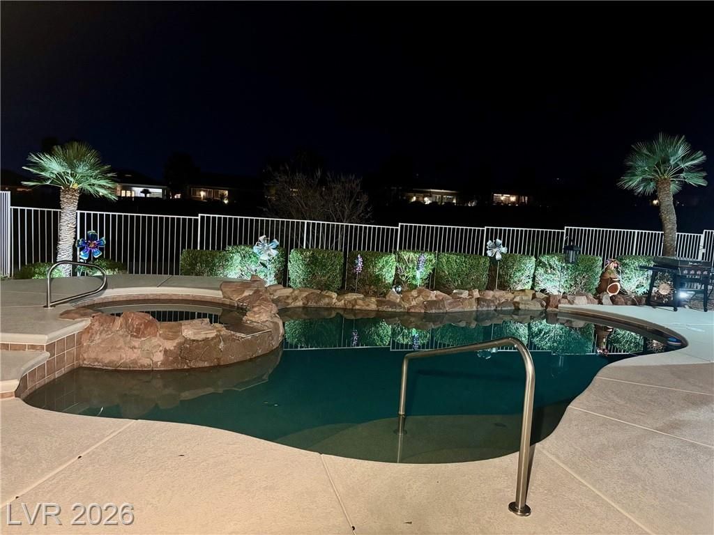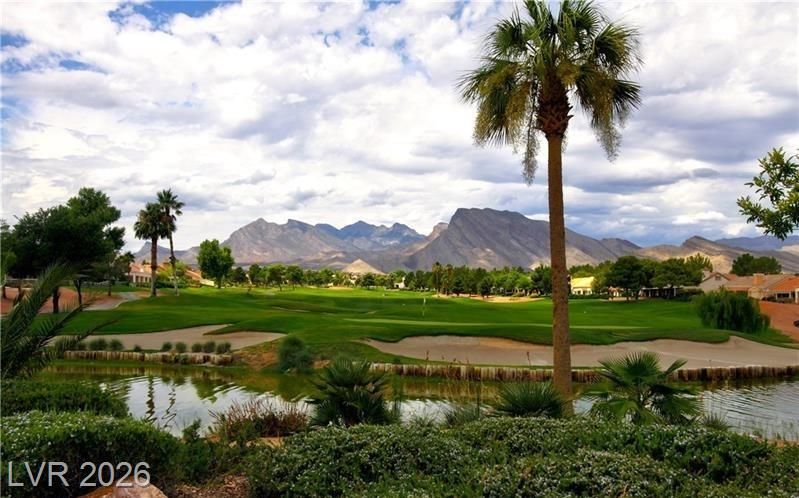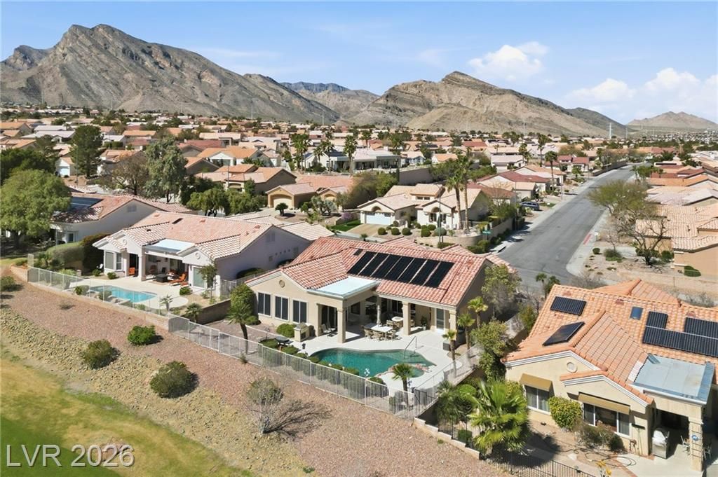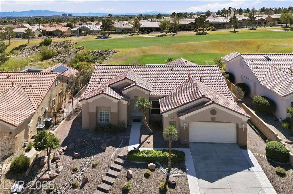 Live Like You Are On Vacation! Beautifully Upgraded Golf Course Home located on the 15th Fairway of Highland Falls Golf Club with partial views of the City & Las Vegas Strip. The Backyard features a PebbleTec Pool and Spa with a Pop-Up Cleaning System, New Solar Heating installed last year, New Cool Decking, and Landscape Night Lighting. Interior ~ 24" x 48" Porcelain Tile Flooring throughout with 5" Baseboards. Remodeled Kitchen includes Custom Cabinets with Dovetail Drawers and Soft-Close Doors, Quartz Countertops, Large Island, Pull-Out storage, Custom Hood Vent, 36" Six Burner Stove with Pot Filler, KitchenAid Appliances including a 5 Door Refrigerator and 3 Rack Dishwasher. Bathrooms feature 24" x 48" Tiled Showers, New Vanities, Mirrors, and Lighting. New LED lighting, switches, and outlets throughout, plus a Dining Room Chandelier. New Den Shutters. Both A/C units were replaced a few years ago. 2 Car Garage with Golf Cart Parking and Newer Opener and Springs.