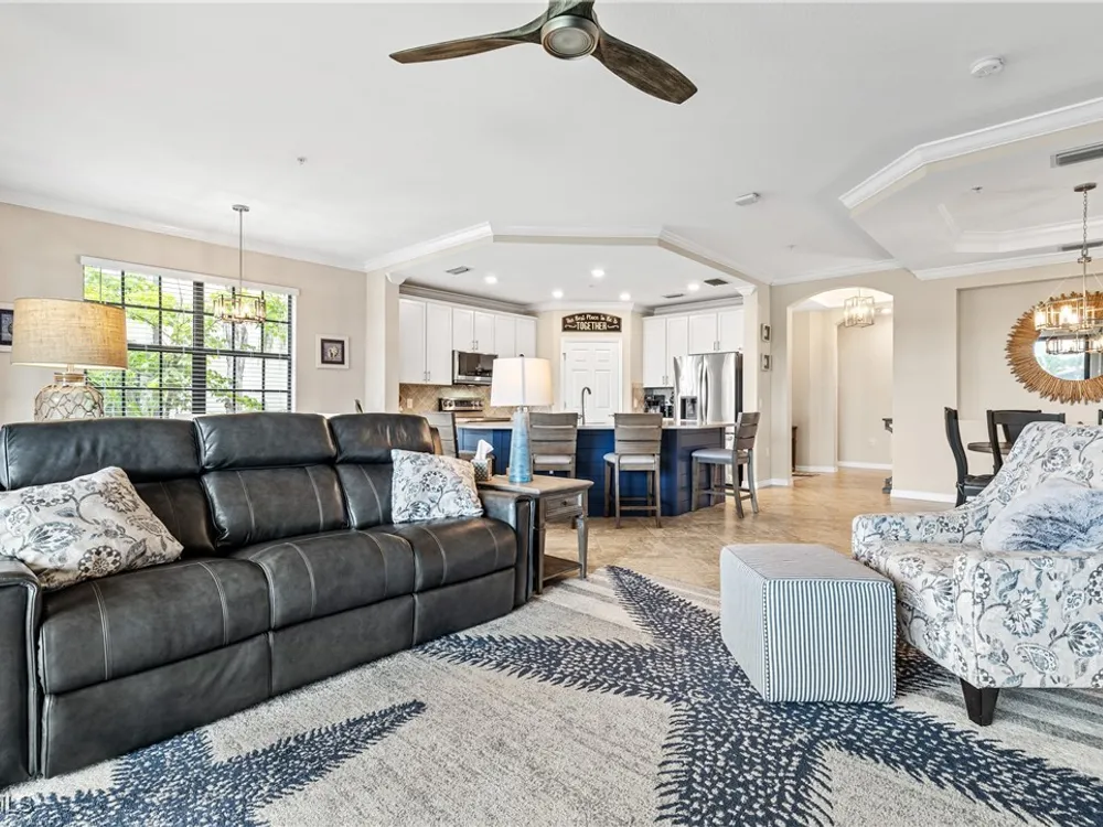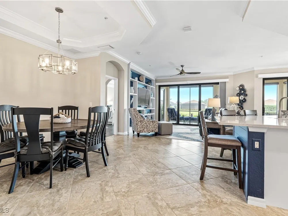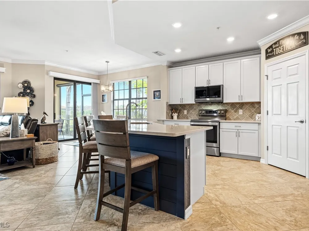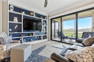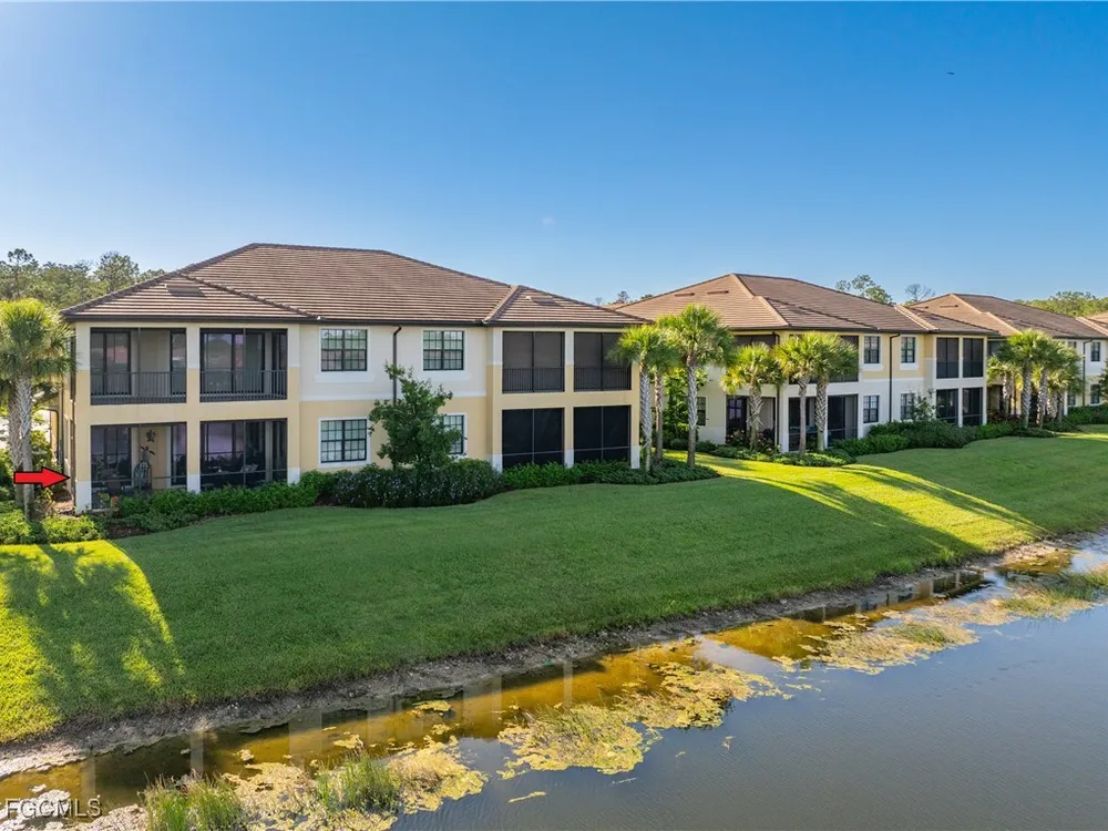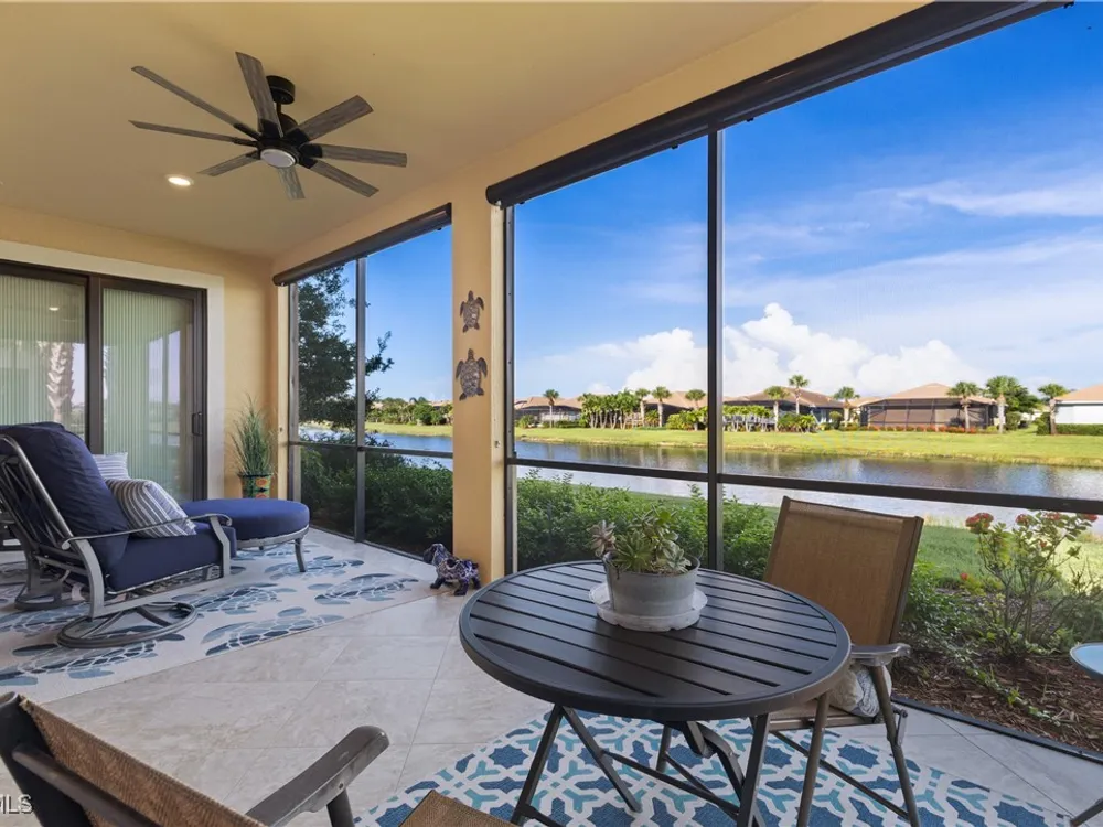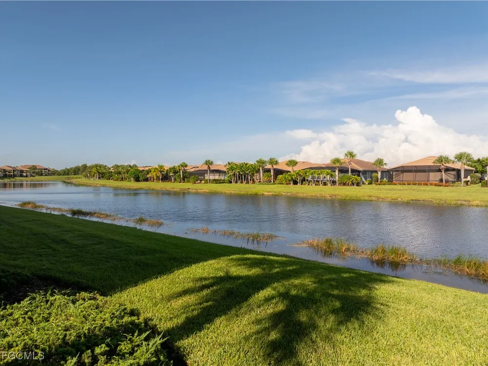 Welcome to this well-maintained 3-bedroom, 2-bath ground-floor condo with a 2-car garage in Casella at Pelican Preserve offering breathtaking water views and stunning sunsets. This home is being offered Furnished with small exclusion list. Built in 2019, this home feels new and shows like a model and provides nearly 1,800 sq. ft. of living space with large tile flooring throughout. The open and spacious floor plan is filled with natural light and enhanced by designer touches such as tray ceilings with crown molding, quartz countertops, upgraded ceiling fans and lighting fixtures, and custom blinds. The open and spacious kitchen features a large island with custom shiplap, perfect for casual dining and entertaining. The oversized lanai overlooks a tranquil lake with lush landscaping, creating a serene space ideal for relaxing or hosting gatherings. The master suite is thoughtfully separated from the guest bedrooms for added privacy and includes a sliding door to the lanai, offering beautiful water views. This home is equipped with impact-resistant windows and doors, providing enhanced comfort and security. Recent updates include exterior tile on the lanai floor, new stainless steel kitchen appliances (2024), custom blinds on the lanai, living room, breakfast nook, master bedroom, and guest bedroom. Additional features include professionally installed Encore garage organizers and cabinets, luxury laminate wood plank flooring replacing all carpets, shiplap detail on the kitchen island, freshly re-grouted and resealed tile, a closet system in the master closet, a custom entertainment wall with shelves in the living room (2022), and a new laundry room utility sink with upper cabinets (2025). Pelican Preserve is a vibrant 55+ community known for its exceptional amenities, including a resort-style pool, tennis courts, pickleball, bocce ball, softball, ping pong, lawn bowling, fitness center and spa, group exercise classes, indoor lap pool, and hair salon. The Town Center offers an outdoor concert pavilion, theater, library, and a variety of activity classes such as sewing and woodworking. Onsite restaurants and coffee bar add to the lifestyle. The community also features a championship 27-hole golf course with an optional membership. This home will not disappoint!