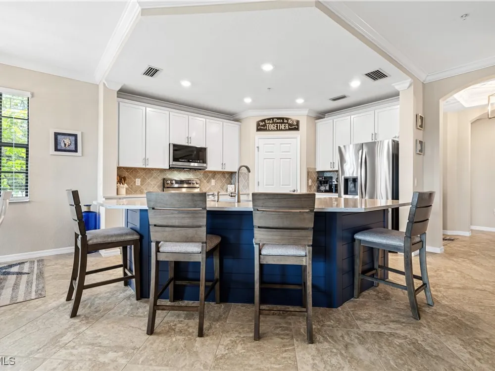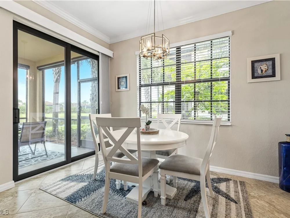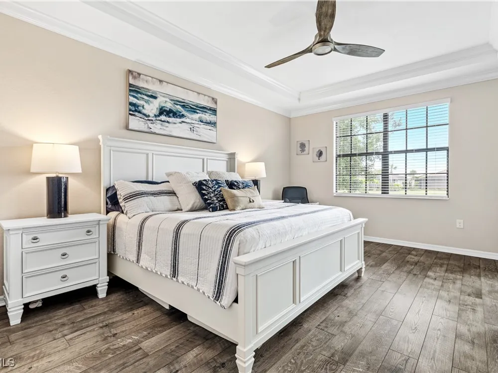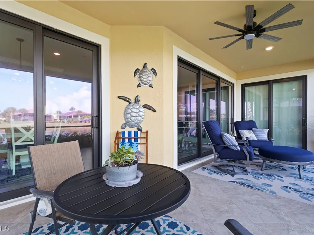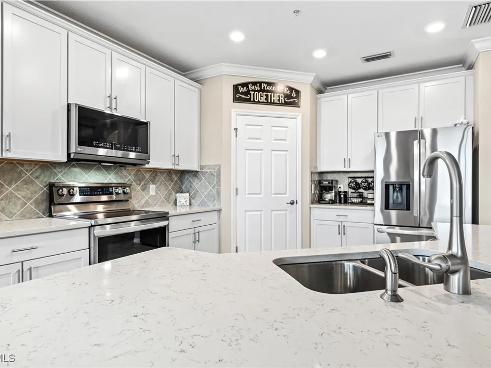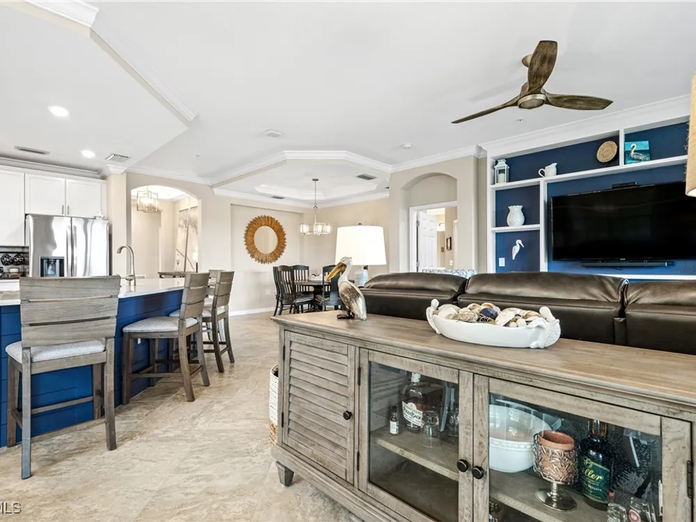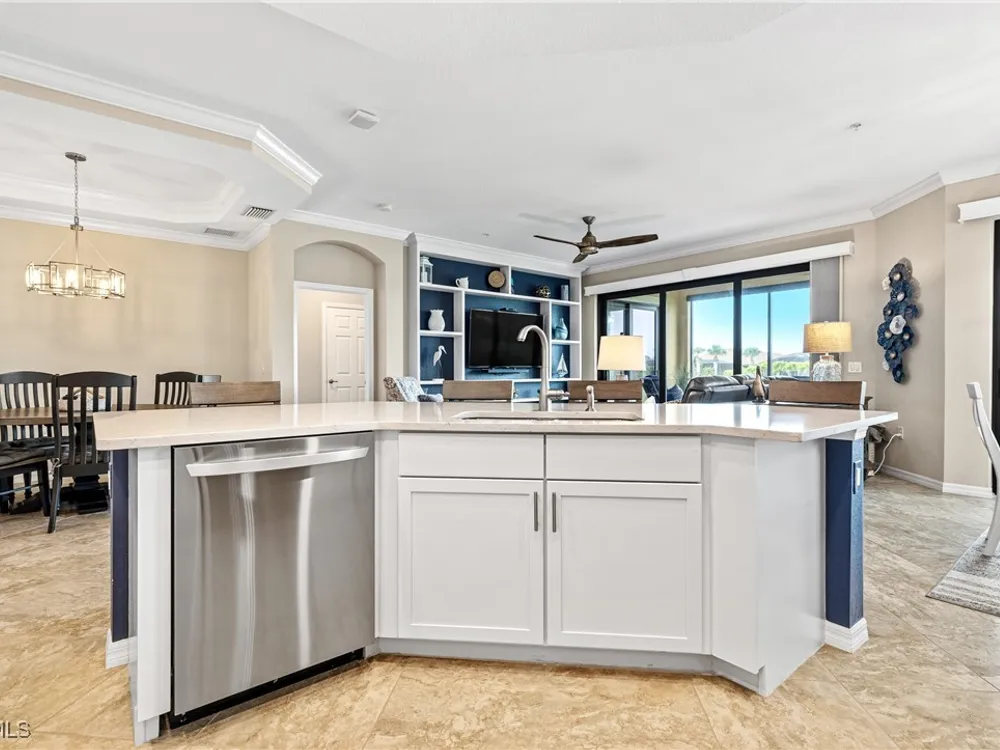 Welcome to this well-maintained 3-bedroom, 2-bath ground-floor condo with a 2-car garage in Casella at Pelican Preserve offering breathtaking water views and stunning sunsets. This home is being offered Furnished with small exclusion list. Built in 2019, this home feels new and shows like a model and provides nearly 1,800 sq. ft. of living space with large tile flooring throughout. The open and spacious floor plan is filled with natural light and enhanced by designer touches such as tray ceilings with crown molding, quartz countertops, upgraded ceiling fans and lighting fixtures, and custom blinds. The open and spacious kitchen features a large island with custom shiplap, perfect for casual dining and entertaining. The oversized lanai overlooks a tranquil lake with lush landscaping, creating a serene space ideal for relaxing or hosting gatherings. The master suite is thoughtfully separated from the guest bedrooms for added privacy and includes a sliding door to the lanai, offering beautiful water views. This home is equipped with impact-resistant windows and doors, providing enhanced comfort and security. Recent updates include exterior tile on the lanai floor, new stainless steel kitchen appliances (2024), custom blinds on the lanai, living room, breakfast nook, master bedroom, and guest bedroom. Additional features include professionally installed Encore garage organizers and cabinets, luxury laminate wood plank flooring replacing all carpets, shiplap detail on the kitchen island, freshly re-grouted and resealed tile, a closet system in the master closet, a custom entertainment wall with shelves in the living room (2022), and a new laundry room utility sink with upper cabinets (2025). Pelican Preserve is a vibrant 55+ community known for its exceptional amenities, including a resort-style pool, tennis courts, pickleball, bocce ball, softball, ping pong, lawn bowling, fitness center and spa, group exercise classes, indoor lap pool, and hair salon. The Town Center offers an outdoor concert pavilion, theater, library, and a variety of activity classes such as sewing and woodworking. Onsite restaurants and coffee bar add to the lifestyle. The community also features a championship 27-hole golf course with an optional membership. This home will not disappoint!