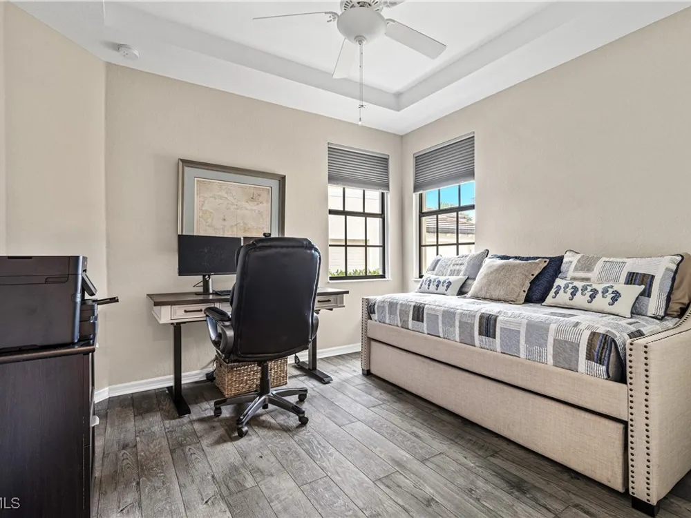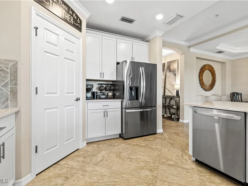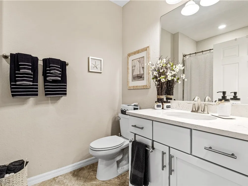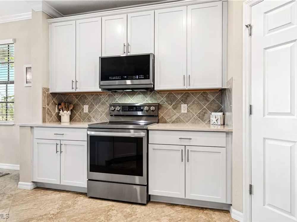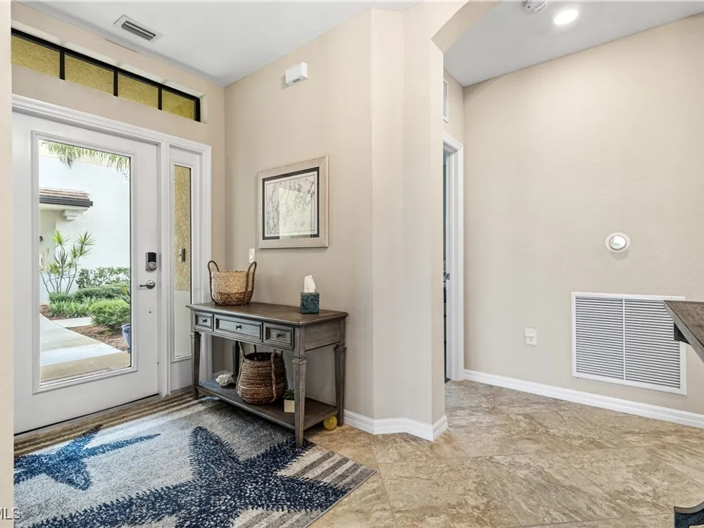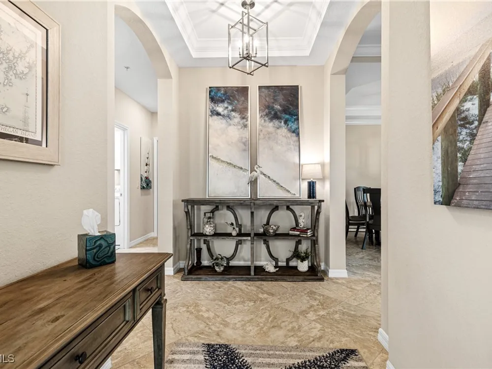 Welcome to this well-maintained 3-bedroom, 2-bath ground-floor condo with a 2-car garage in Casella at Pelican Preserve offering breathtaking water views and stunning sunsets. This home is being offered Furnished with small exclusion list. Built in 2019, this home feels new and shows like a model and provides nearly 1,800 sq. ft. of living space with large tile flooring throughout. The open and spacious floor plan is filled with natural light and enhanced by designer touches such as tray ceilings with crown molding, quartz countertops, upgraded ceiling fans and lighting fixtures, and custom blinds. The open and spacious kitchen features a large island with custom shiplap, perfect for casual dining and entertaining. The oversized lanai overlooks a tranquil lake with lush landscaping, creating a serene space ideal for relaxing or hosting gatherings. The master suite is thoughtfully separated from the guest bedrooms for added privacy and includes a sliding door to the lanai, offering beautiful water views. This home is equipped with impact-resistant windows and doors, providing enhanced comfort and security. Recent updates include exterior tile on the lanai floor, new stainless steel kitchen appliances (2024), custom blinds on the lanai, living room, breakfast nook, master bedroom, and guest bedroom. Additional features include professionally installed Encore garage organizers and cabinets, luxury laminate wood plank flooring replacing all carpets, shiplap detail on the kitchen island, freshly re-grouted and resealed tile, a closet system in the master closet, a custom entertainment wall with shelves in the living room (2022), and a new laundry room utility sink with upper cabinets (2025). Pelican Preserve is a vibrant 55+ community known for its exceptional amenities, including a resort-style pool, tennis courts, pickleball, bocce ball, softball, ping pong, lawn bowling, fitness center and spa, group exercise classes, indoor lap pool, and hair salon. The Town Center offers an outdoor concert pavilion, theater, library, and a variety of activity classes such as sewing and woodworking. Onsite restaurants and coffee bar add to the lifestyle. The community also features a championship 27-hole golf course with an optional membership. This home will not disappoint!