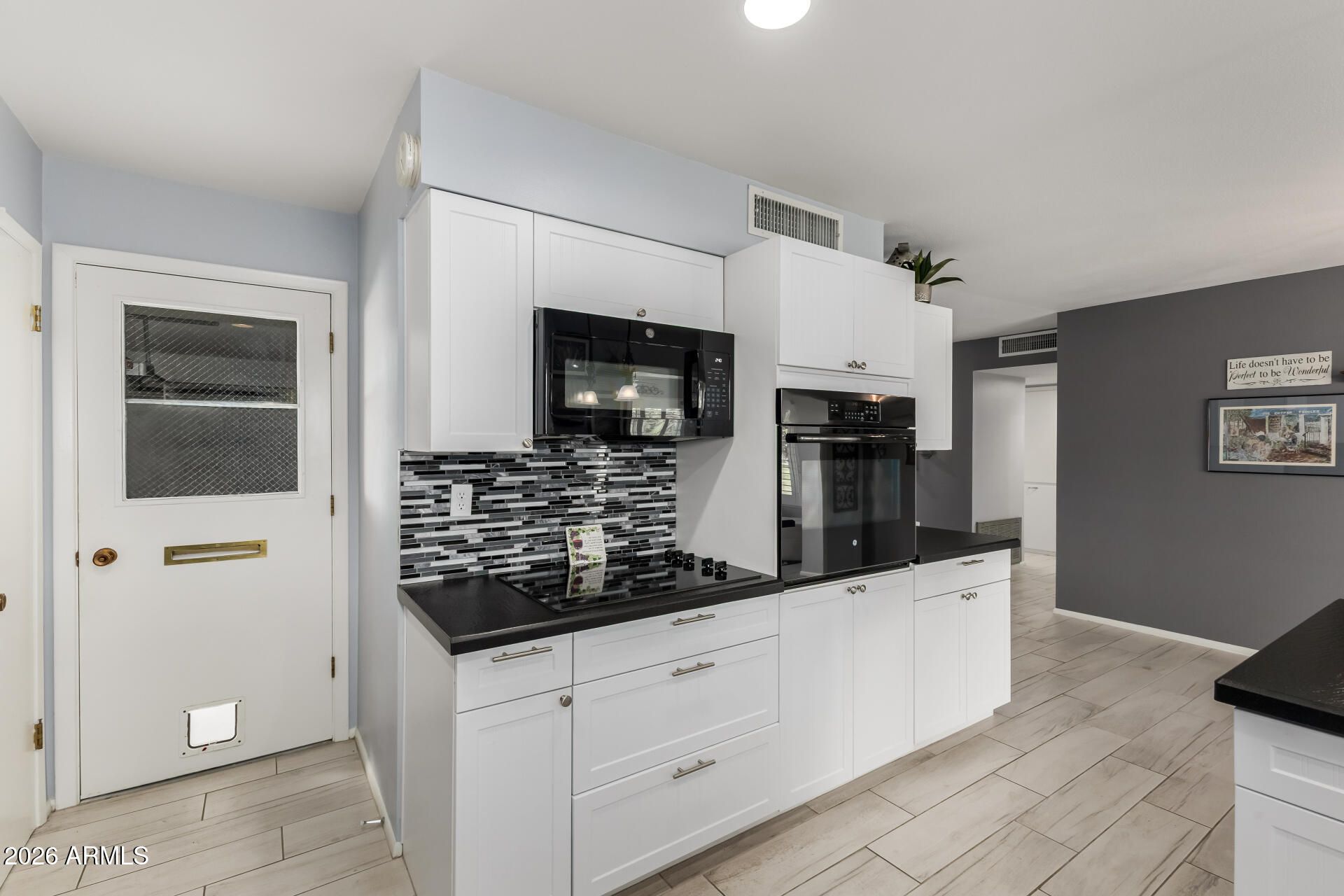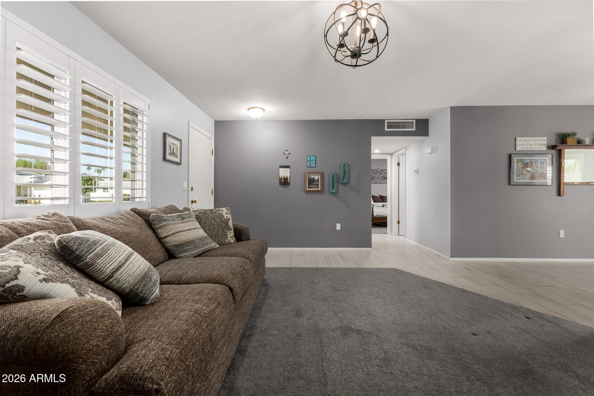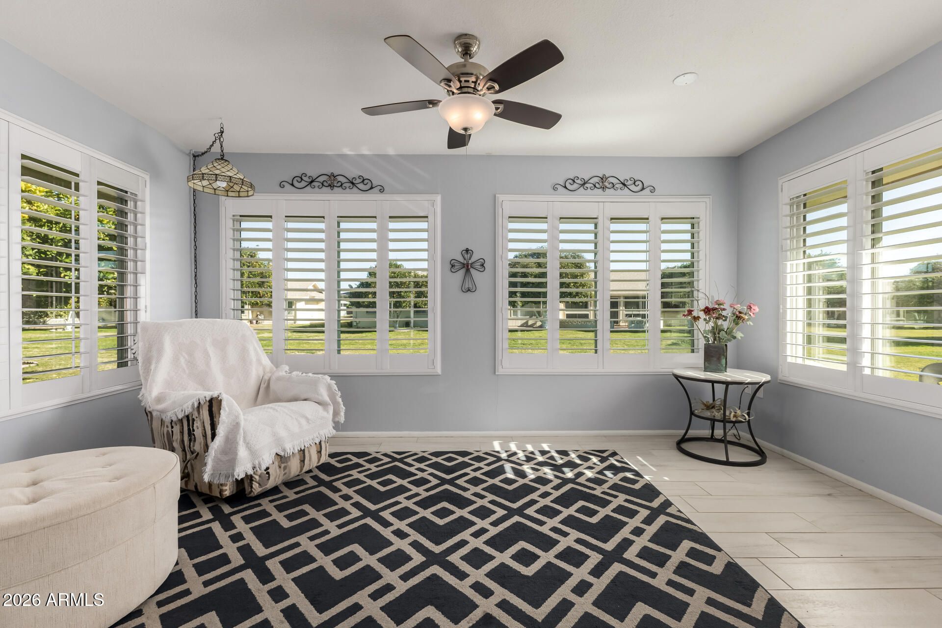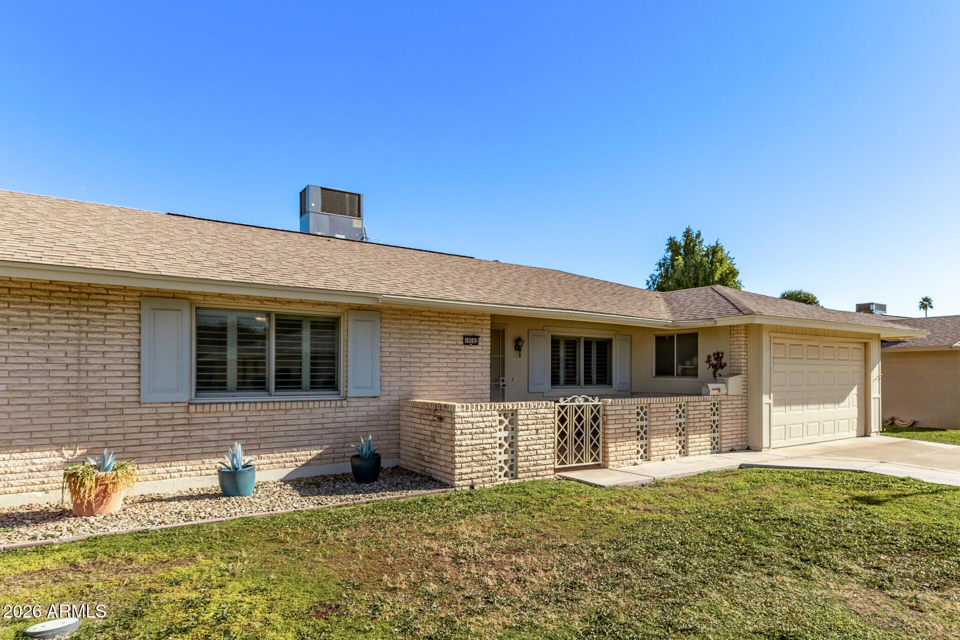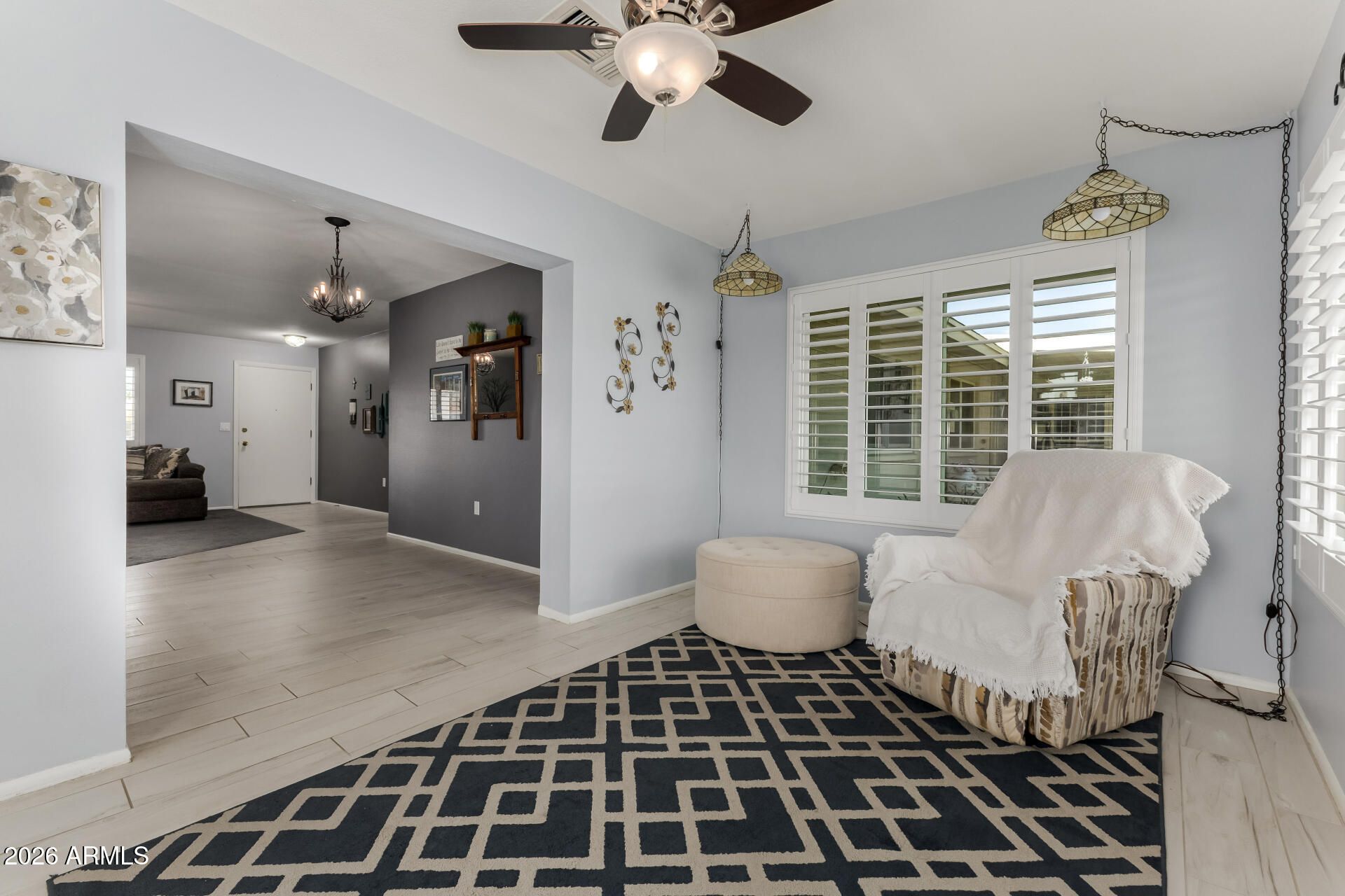 Beautifully Remodeled Sun City Gemini/Twin Home. This move-in ready 2-bedroom, 2-bath home blends modern upgrades with the easy, low-maintenance lifestyle Sun City is famous for. Enjoy Anderson windows, plantation shutters, fresh custom paint, smooth ceilings (no popcorn), and updated flooring throughout. The stunning kitchen features quartz countertops, a farmhouse sink, updated appliances, and convenient pull-out pantry shelving. Both bathrooms have been tastefully remodeled with elegant custom vanities. Major system upgrades include a new HVAC, tankless water heater, and electrical improvements, giving peace of mind along with style. A rare opportunity to own a highly upgraded home in one of Arizona's most sought-after active adult communities.