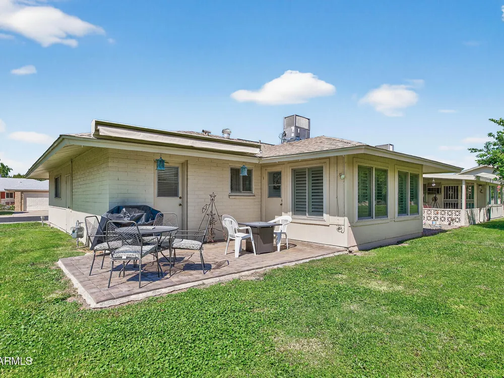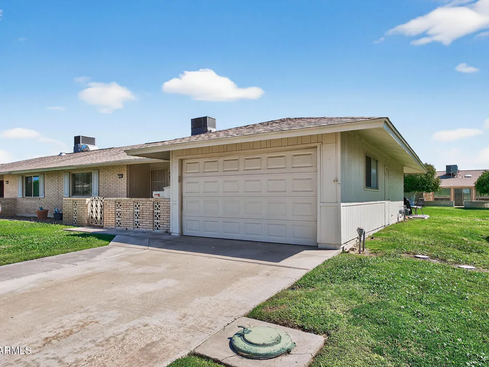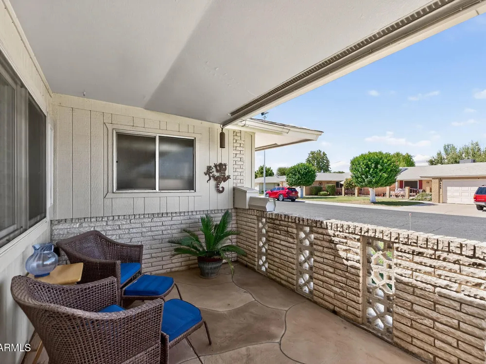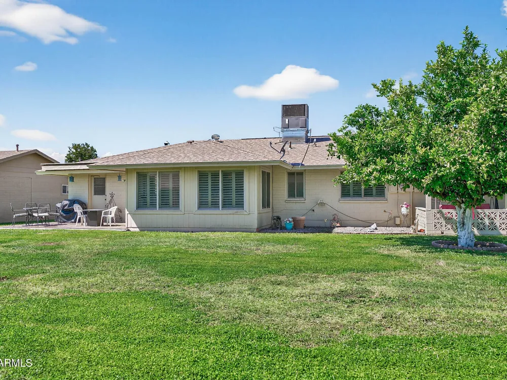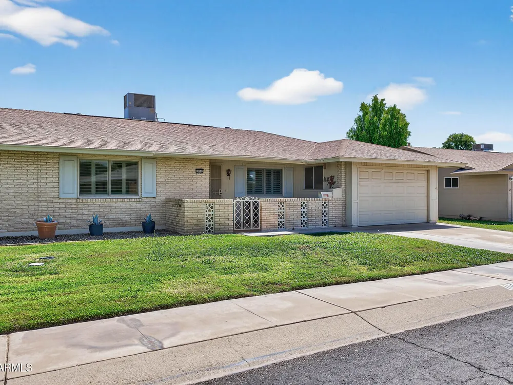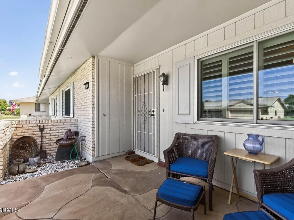 Welcome to the Castle Supreme meets Taj Mahal of Sun City, a completely remodeled, move-in ready retreat showcasing high-end finishes throughout. This 2-bedroom, 2-bath gem features Anderson windows, shutters throughout, custom paint and a seamless blend of ceramic tile & upgraded carpet. The custom kitchen boasts quartz countertops, a farm sink, updated appliances and pull-out pantry shelves, while the bathrooms sparkle with elegant custom vanities. A tankless water heater, single-car garage, and remote-controlled retractable awning add comfort and convenience. Move outside to enjoy your private patio, or head just minutes away to golf, tennis, pickleball, bowling, shopping, dining, hospitals & clinics. Truly a rare opportunity — your Castle Supreme and Taj Mahal combined into one home!