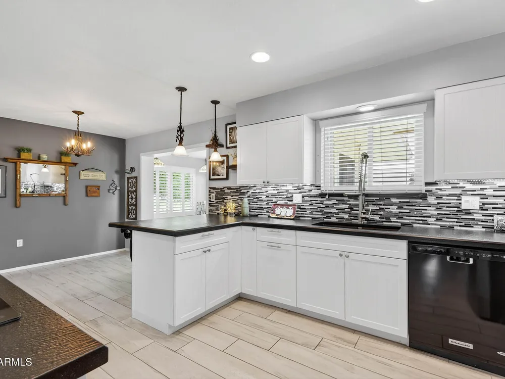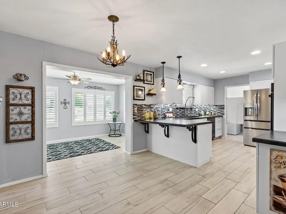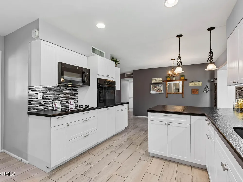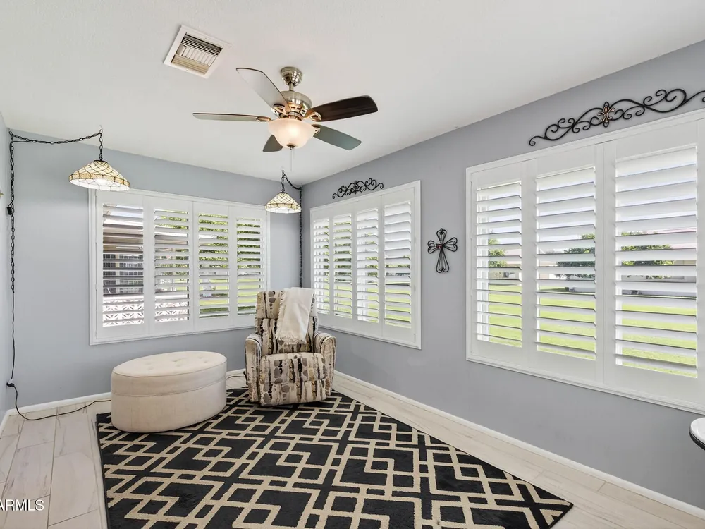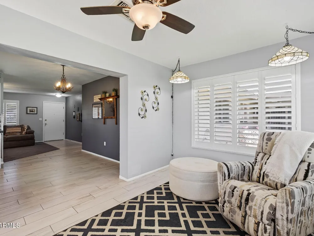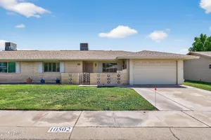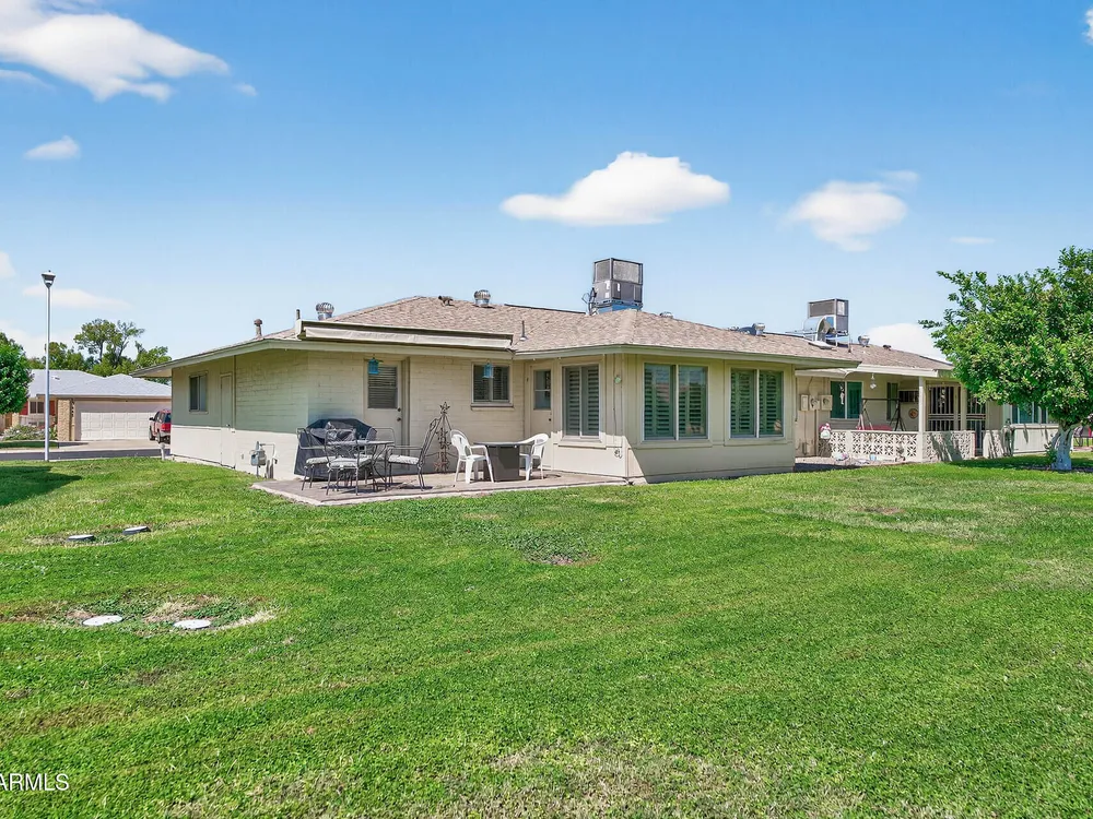 Welcome to the Castle Supreme meets Taj Mahal of Sun City, a completely remodeled, move-in ready retreat showcasing high-end finishes throughout. This 2-bedroom, 2-bath gem features Anderson windows, shutters throughout, custom paint and a seamless blend of ceramic tile & upgraded carpet. The custom kitchen boasts quartz countertops, a farm sink, updated appliances and pull-out pantry shelves, while the bathrooms sparkle with elegant custom vanities. A tankless water heater, single-car garage, and remote-controlled retractable awning add comfort and convenience. Move outside to enjoy your private patio, or head just minutes away to golf, tennis, pickleball, bowling, shopping, dining, hospitals & clinics. Truly a rare opportunity — your Castle Supreme and Taj Mahal combined into one home!