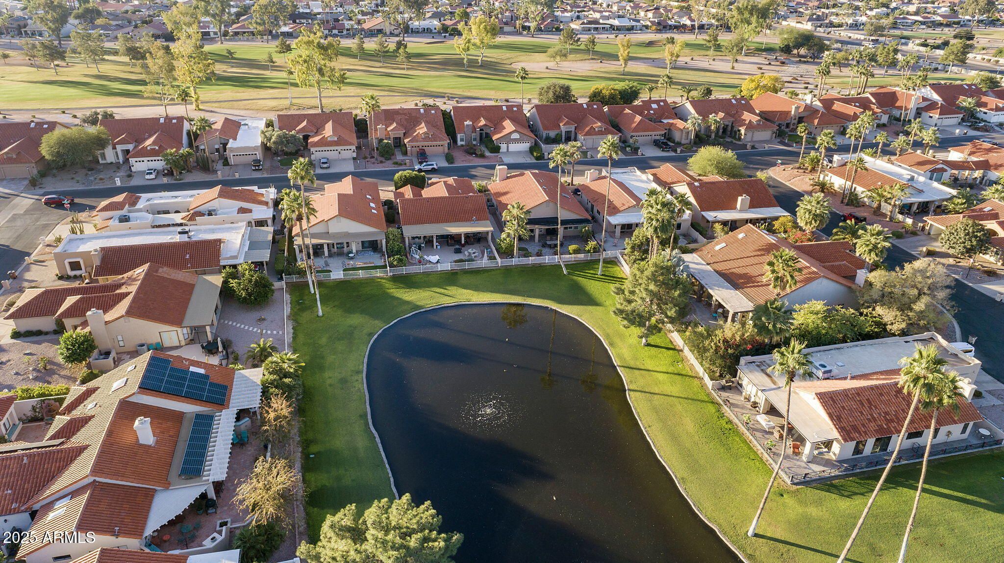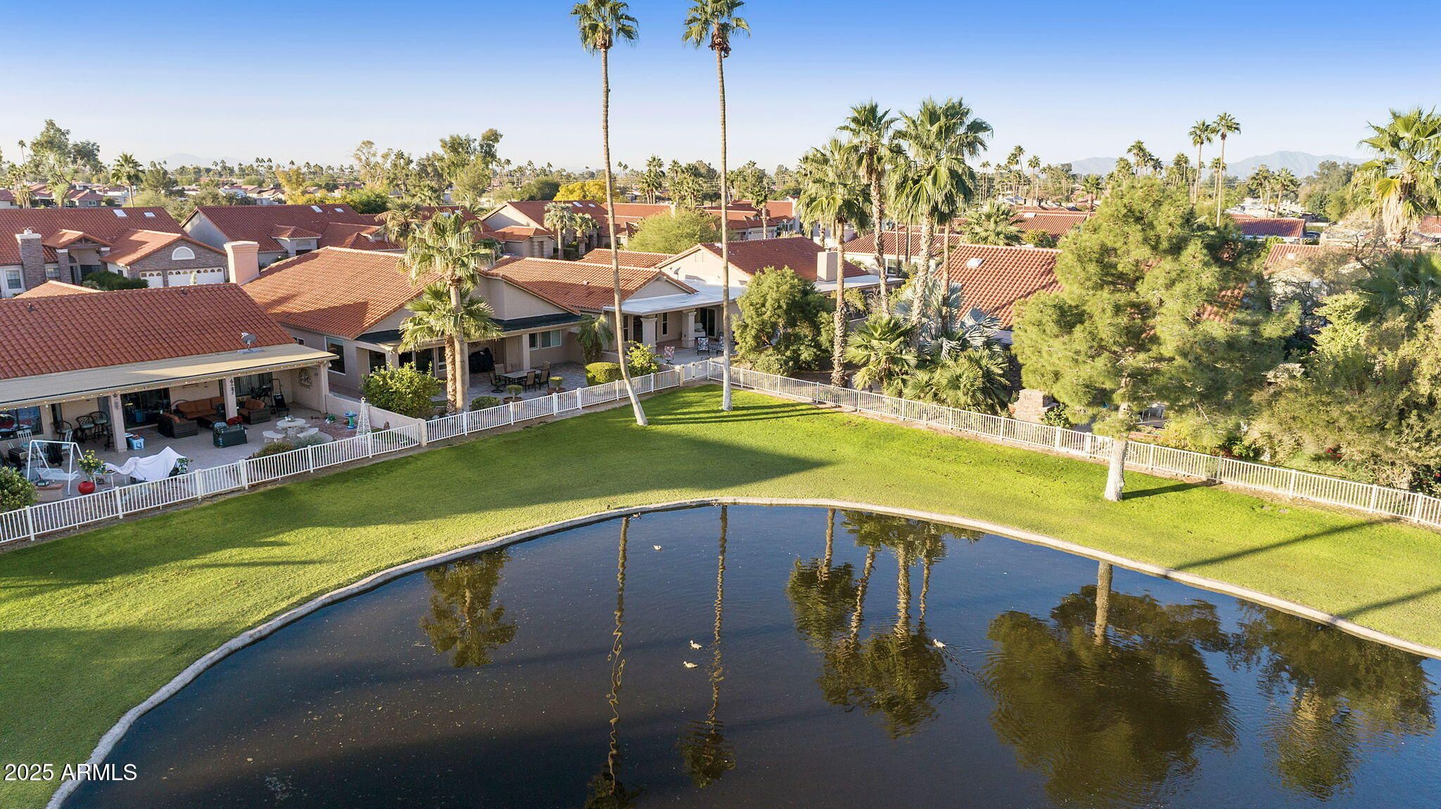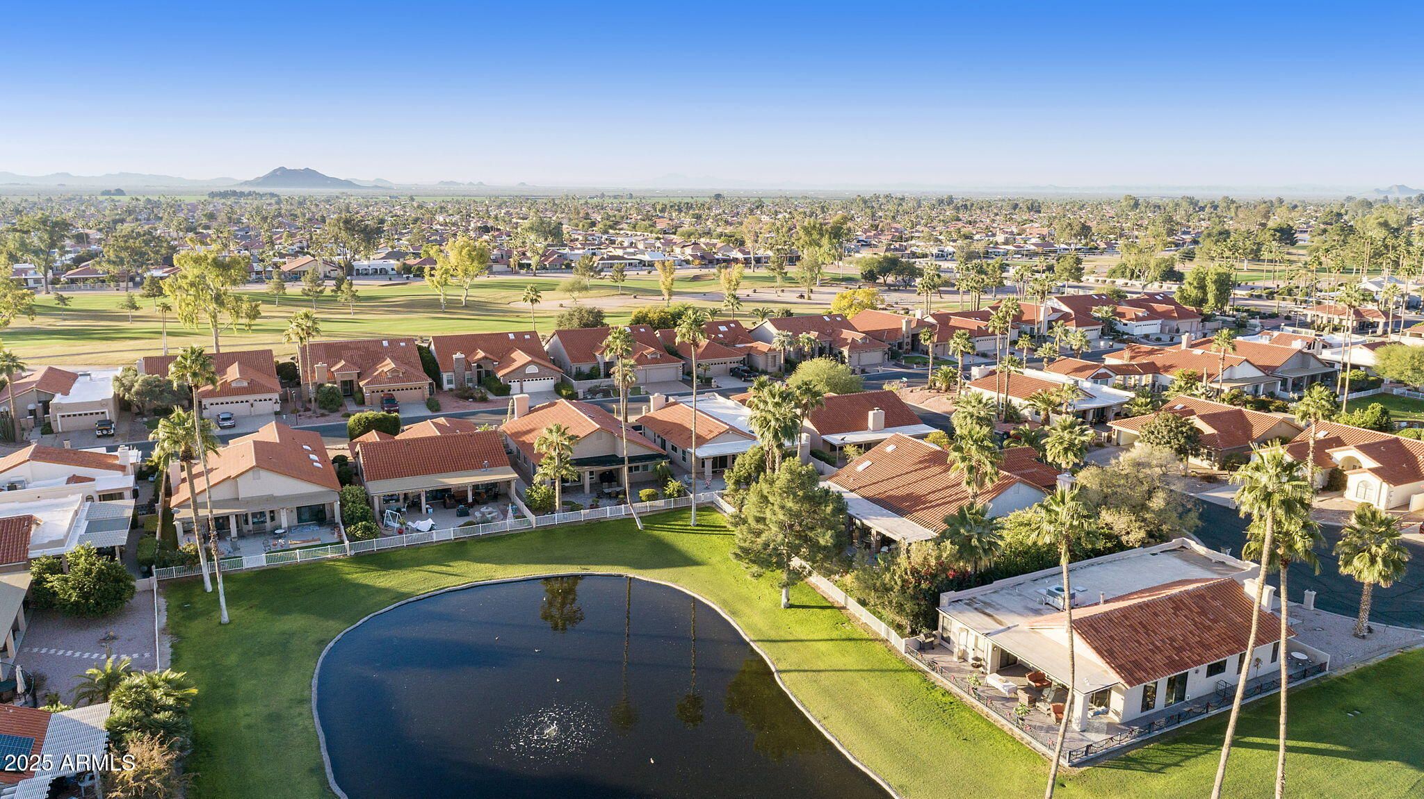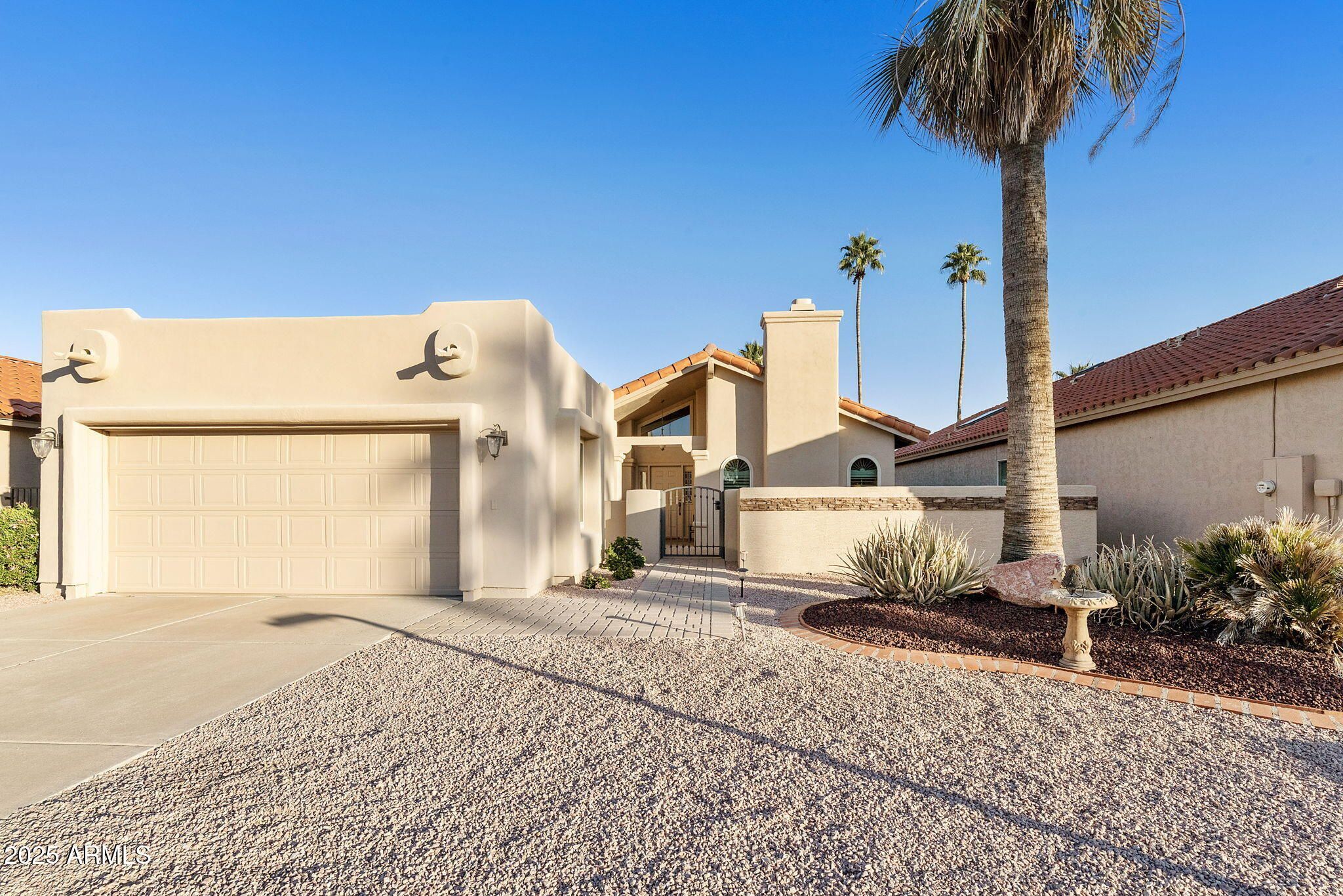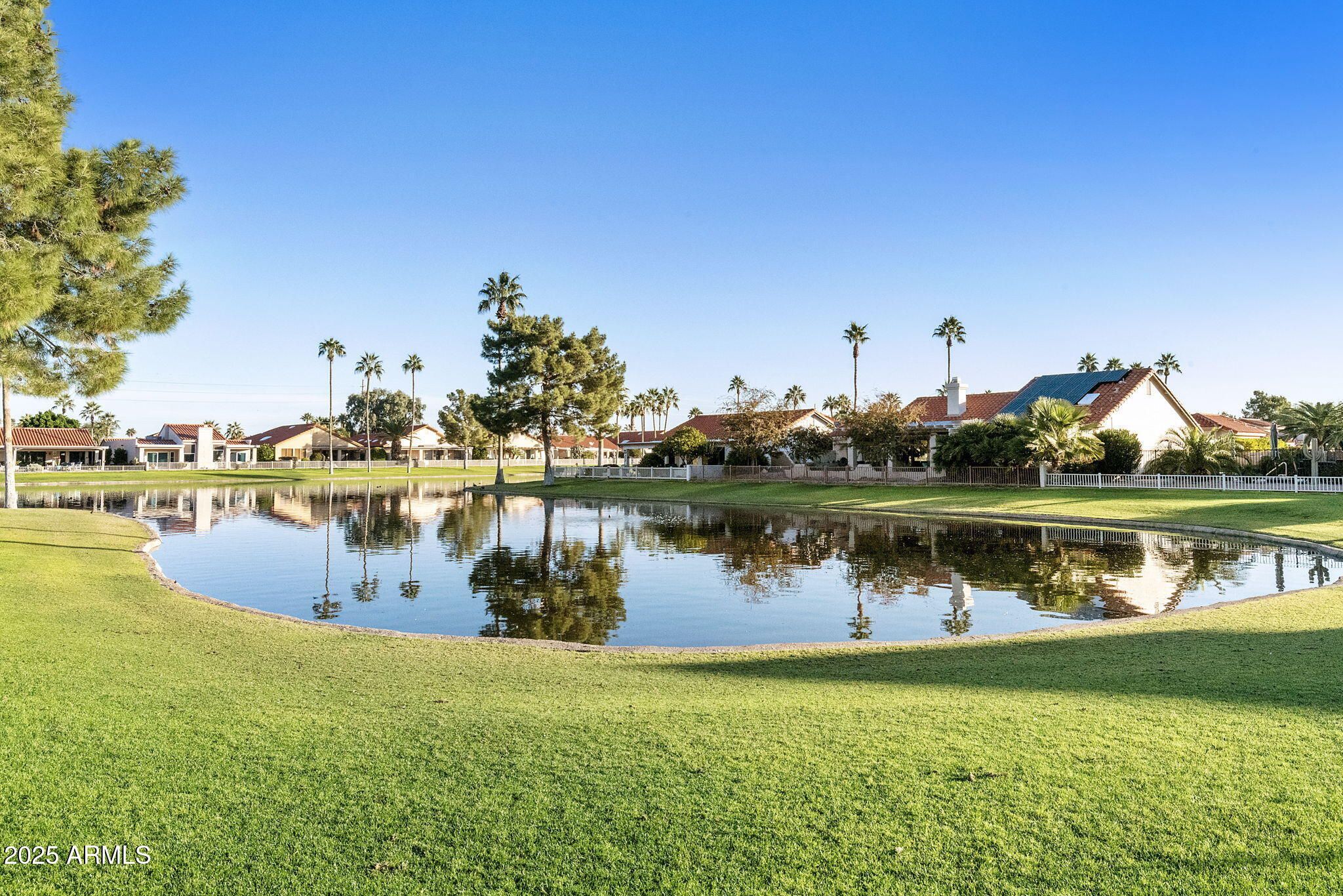 This beautiful Cimarron model with LAKE VIEW is located in the gated active-adult community of Palo Verde in Sun Lakes! Welcoming front COURTYARD leads into an open foyer that flows into the living/dining room with fireplace, shutters,neutral tile and carpet. Bright open kitchen with quartz countertops , lora of storage. Built-in bar area is perfect for casual dining / entertaining. Spacious primary suite features 2 WALK IN CLOSETS, dual sinks, soaking tub, walk-in shower and private patio exit. Large guest BR offers flexible space for office or hobbies. OVERSIZED, EXTENDED GARAGE with golf-cart space and additional storage. Newer Windows too! Come enjoy RESORT STYLE AMMENITIES including golf, pools, fitness center, tennis, pickleball, racquet ball, dining, and social activities