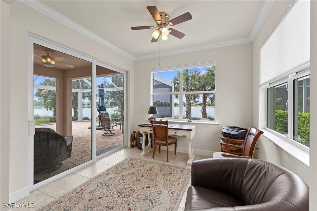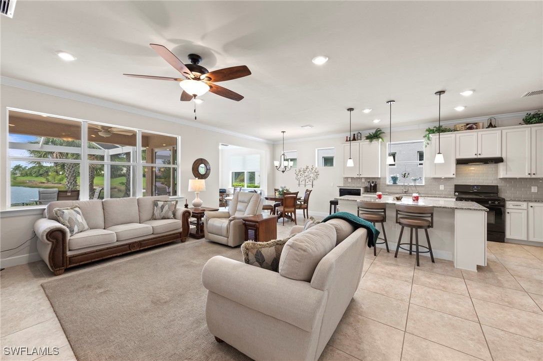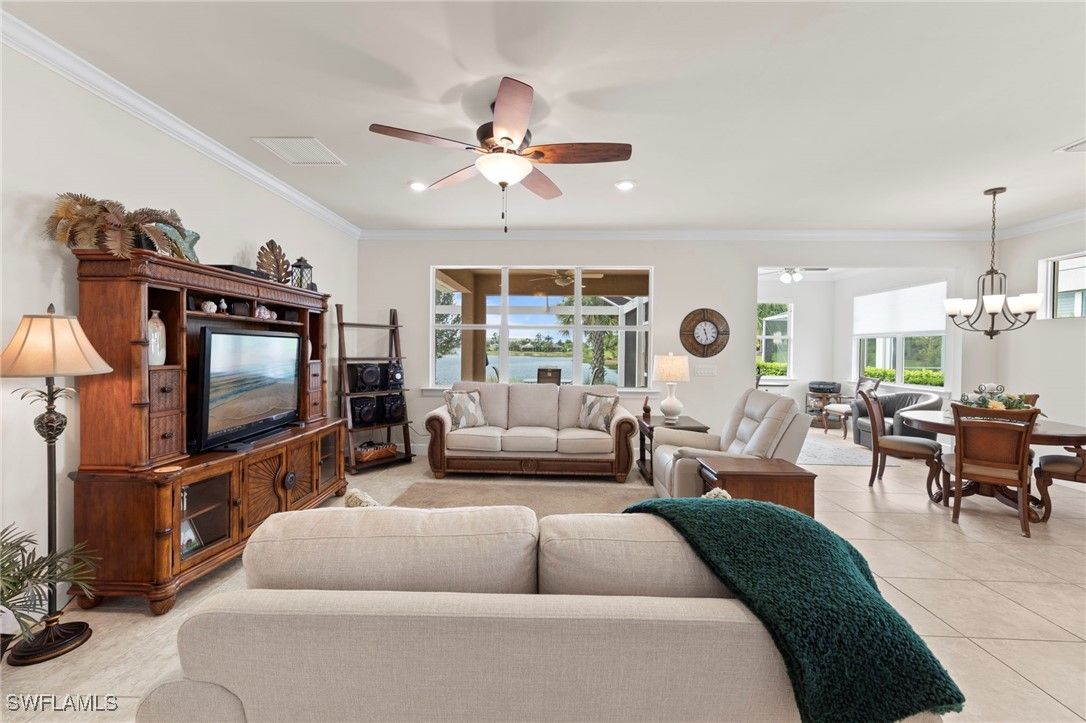 Welcome home to 10507 Jackson Square Drive, with a SPECTACULAR LONG LAKE VIEW. with a BRAND NEW EXTENDED LANAI! This Abbeyville model by Pulte has been lovingly cared for by the original owners. Offering 2 bedrooms + den, 2 full baths, SUNROOM, IMPACT RESISTANT DOORS and WINDOWS, 4FT GARAGE EXTENSION, PREMIUM LAKE LOT, and more! The gourmet kitchen offers Granite countertops, tile backsplash, NATURAL GAS range, Large kitchen island w/storage on one end, pantry, laundry room with ANOTHER PANTRY, and NO CARPET! The master suite has wood flooring in the bedroom and closet, and a large ensuite bath with oversized walk-in shower.. The optional SUNROOM offers a peaceful place for your morning coffee, or enjoy your book with a glass of wine or favorite beverage. The large backyard has plenty of room to expand the lanai or add a POOL if desired. This home has an extremely long driveway, so your friends can all park when they come to visit. Tidewater by Del Webb is a 55+ gated community with NATURAL GAS, LOW HOA (included lawn care + irrigation) and plenty of amenities for all to enjoy. The clubhouse with fitness center, community room, Resort Style Pool, spa, tennis courts, pickleball, Bocce courts is ideally located between Naples and Ft.. Myers. Just a short drive to the beach, RSW Airport, Restaurants, and Coconut Point Mall. Welcome to your slice of paradise!