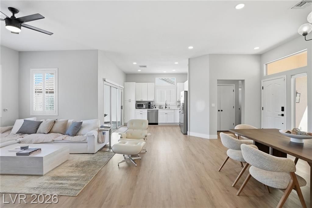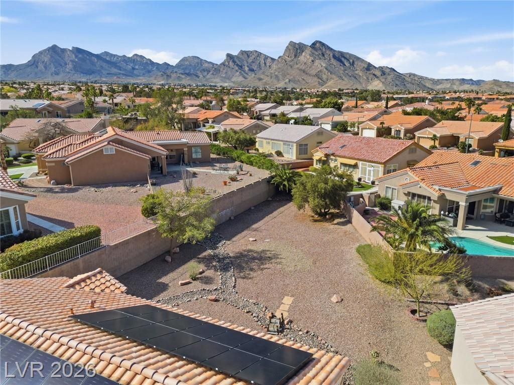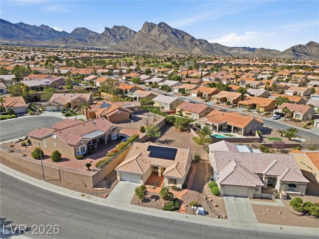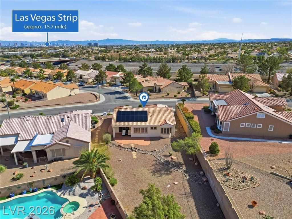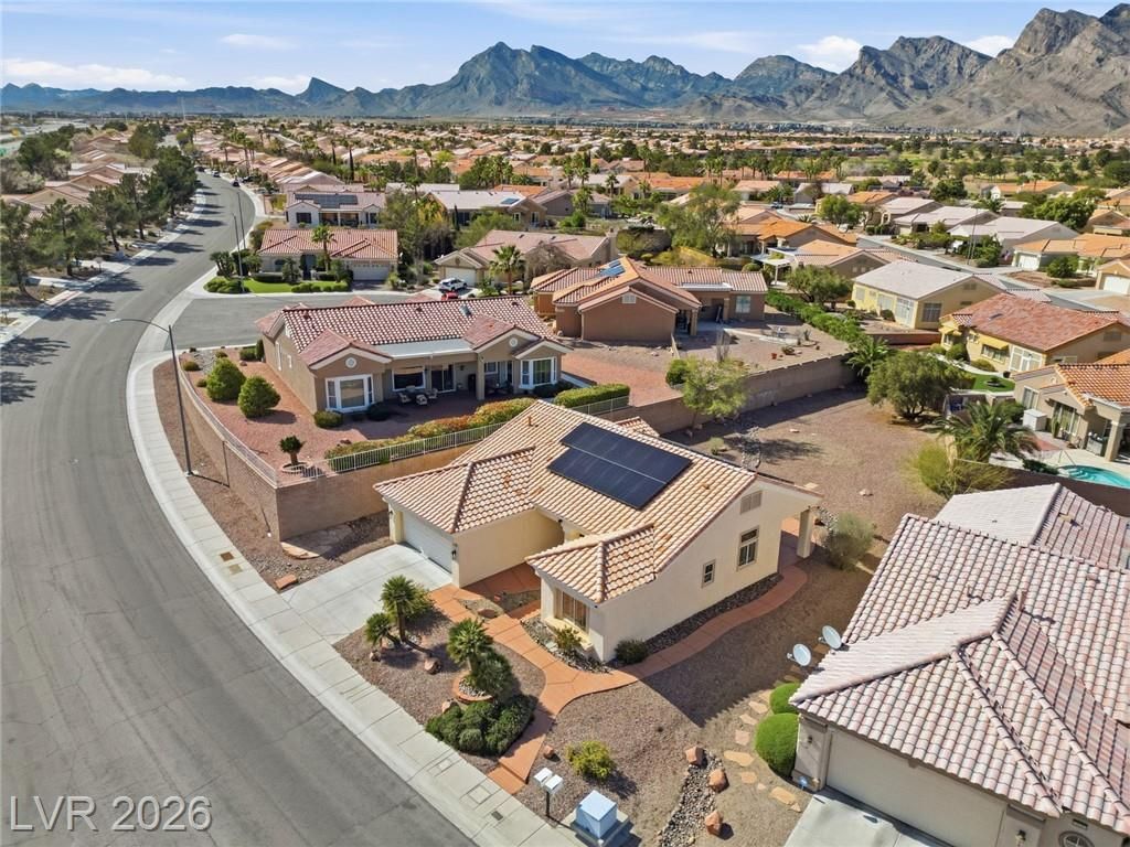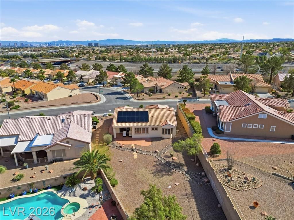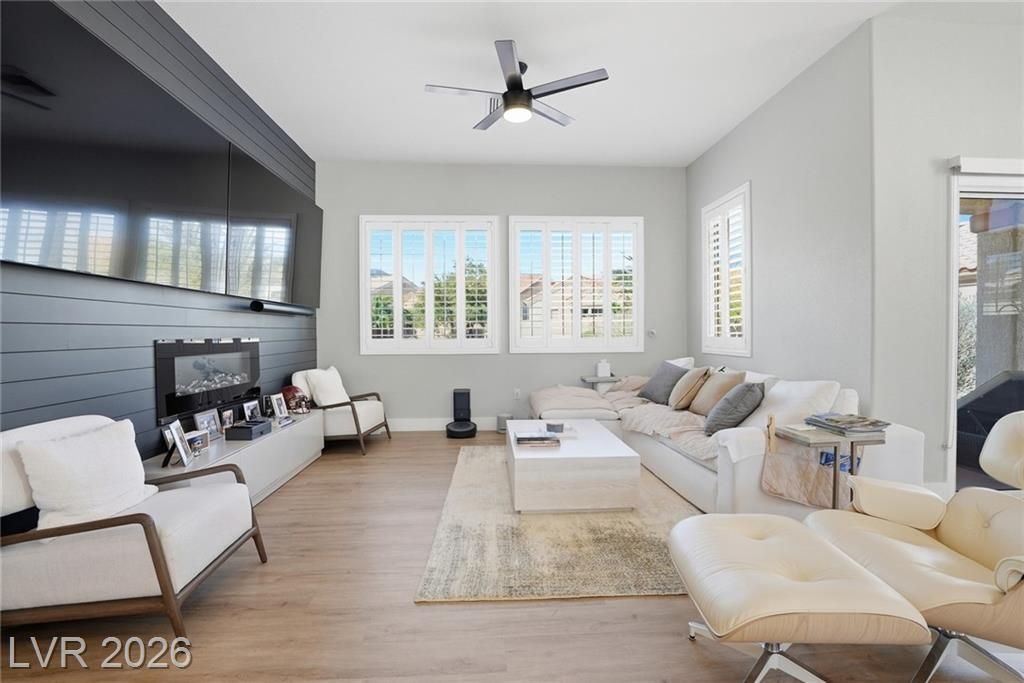 Rare opportunity to own a beautifully upgraded home with mountain and partial Strip views in the highly desirable Sun City Summerlin 55+ community. This bright and open home features a stunning floor-to-ceiling accent wall with a built-in electric fireplace, creating a warm and inviting living space. Plantation shutters and window coverings throughout add both style and privacy. The updated kitchen showcases quartz countertops, modern cabinetry with abundant storage, with stainless steel appliances, and a newer gently used refrigerator. Bathrooms feature updated vanities and beautifully detailed tub and shower tile surrounds. Enjoy abundant natural light and an oversized backyard with endless potential to create your own private outdoor retreat. Additional highlights include a like new washer and dryer, leased solar panels, 220V outlet in the garage, water softener, and more. All Furniture negotiable!