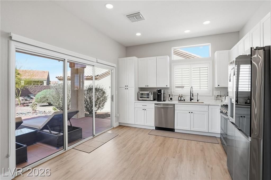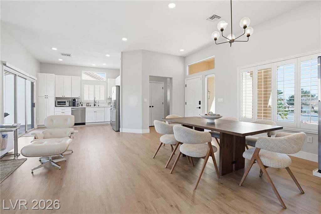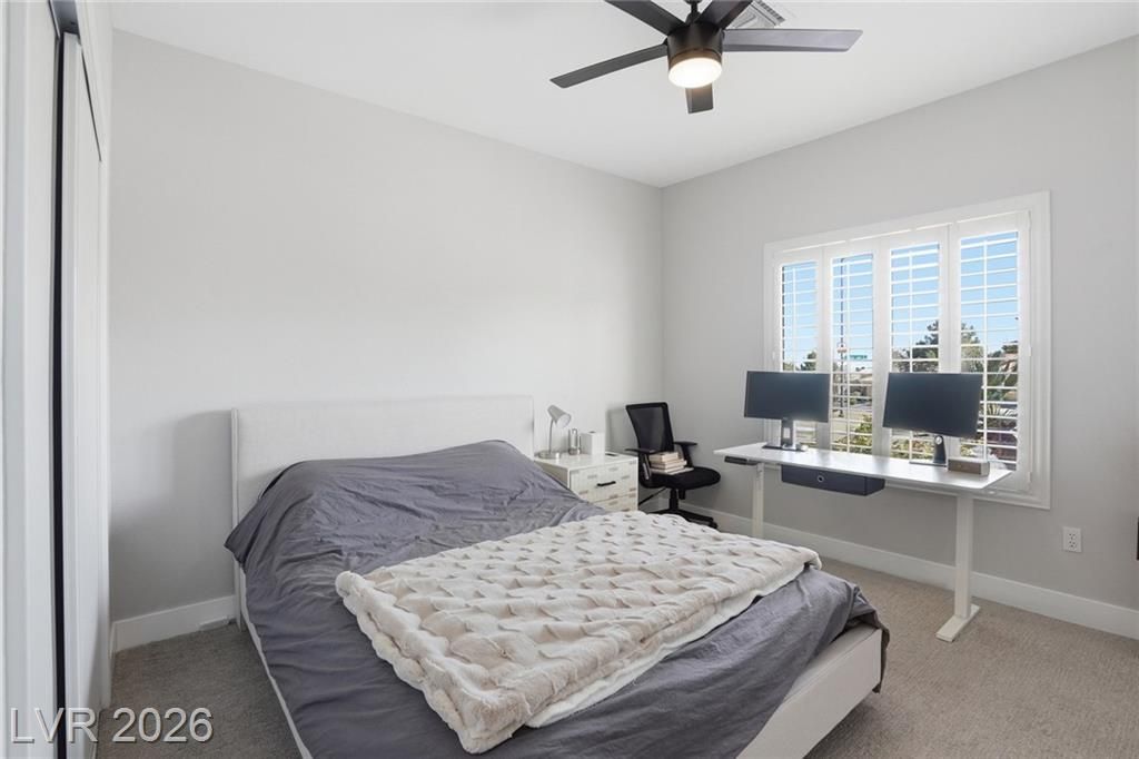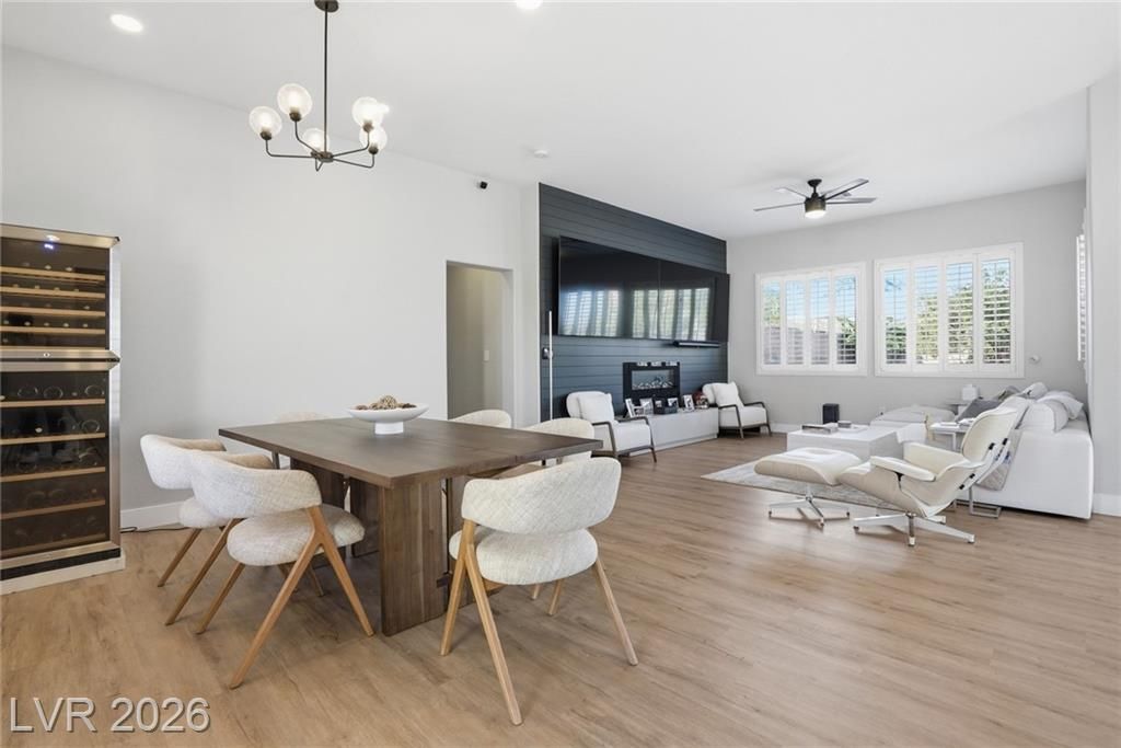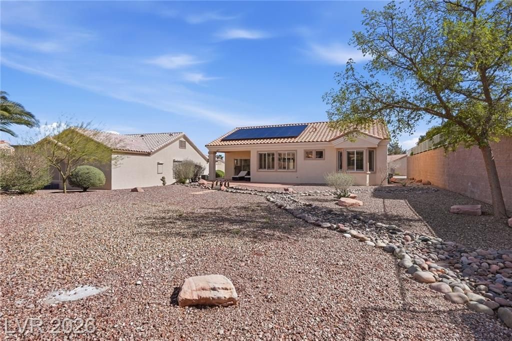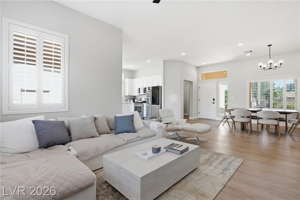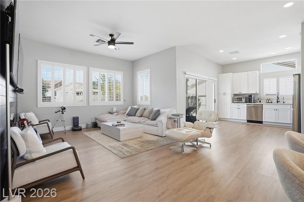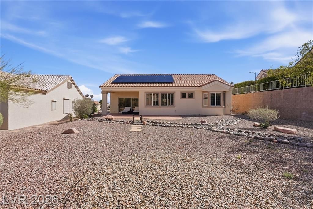 Rare opportunity to own a beautifully upgraded home with mountain and partial Strip views in the highly desirable Sun City Summerlin 55+ community. This bright and open home features a stunning floor-to-ceiling accent wall with a built-in electric fireplace, creating a warm and inviting living space. Plantation shutters and window coverings throughout add both style and privacy. The updated kitchen showcases quartz countertops, modern cabinetry with abundant storage, with stainless steel appliances, and a newer gently used refrigerator. Bathrooms feature updated vanities and beautifully detailed tub and shower tile surrounds. Enjoy abundant natural light and an oversized backyard with endless potential to create your own private outdoor retreat. Additional highlights include a like new washer and dryer, leased solar panels, 220V outlet in the garage, water softener, and more. All Furniture negotiable!