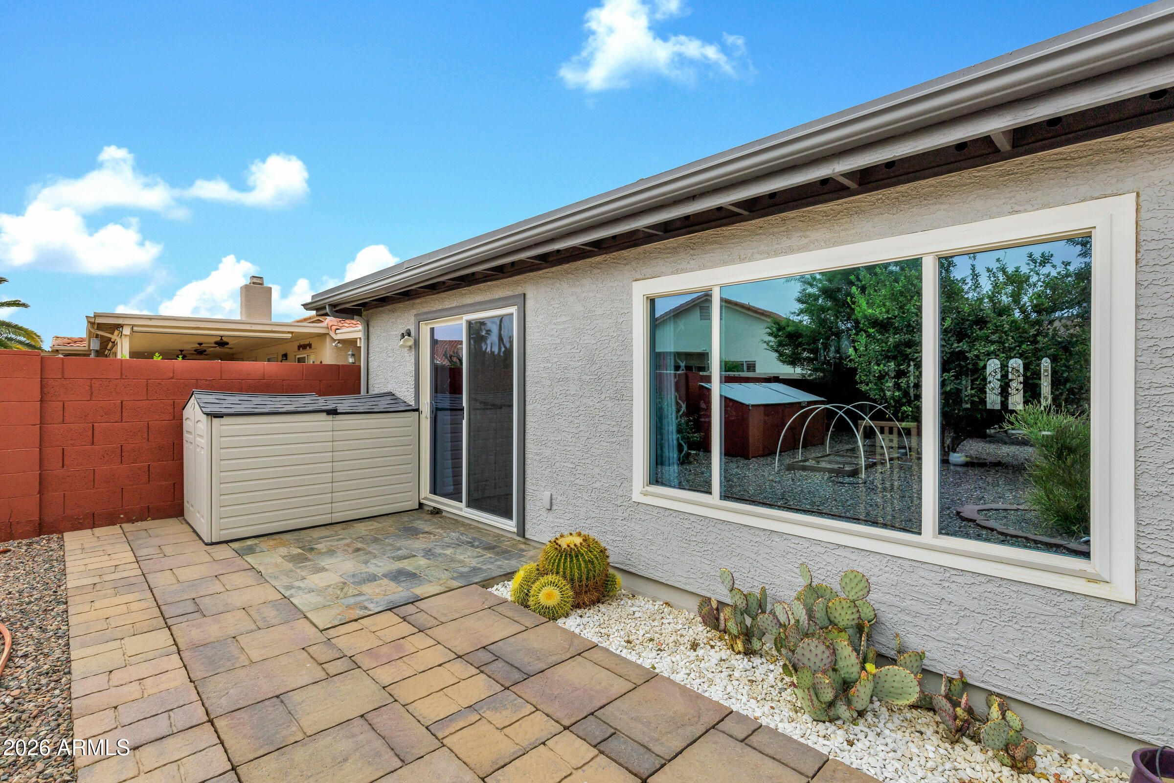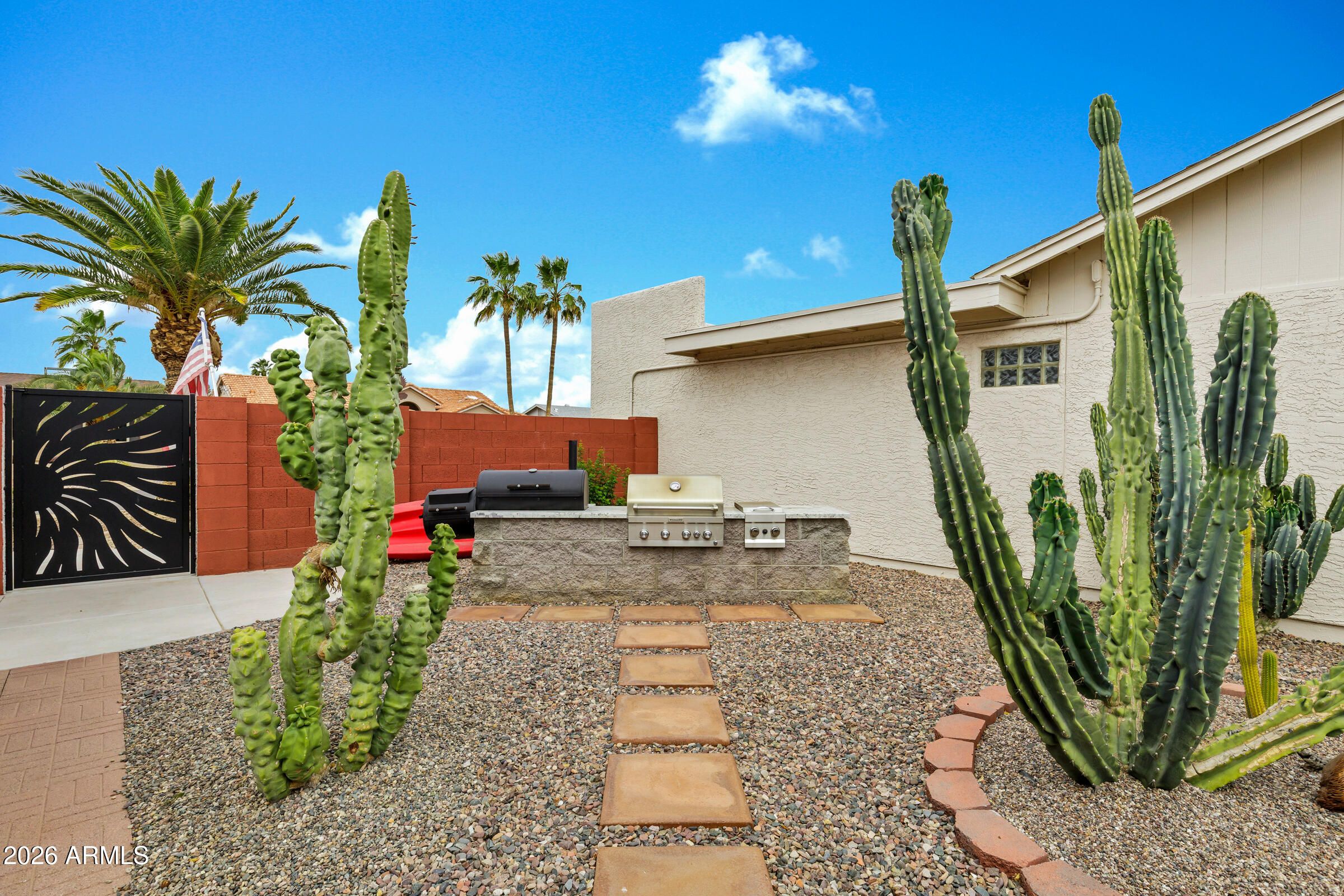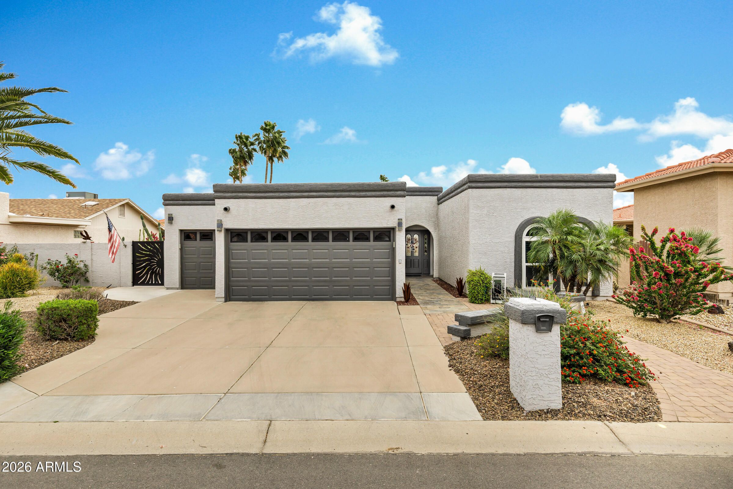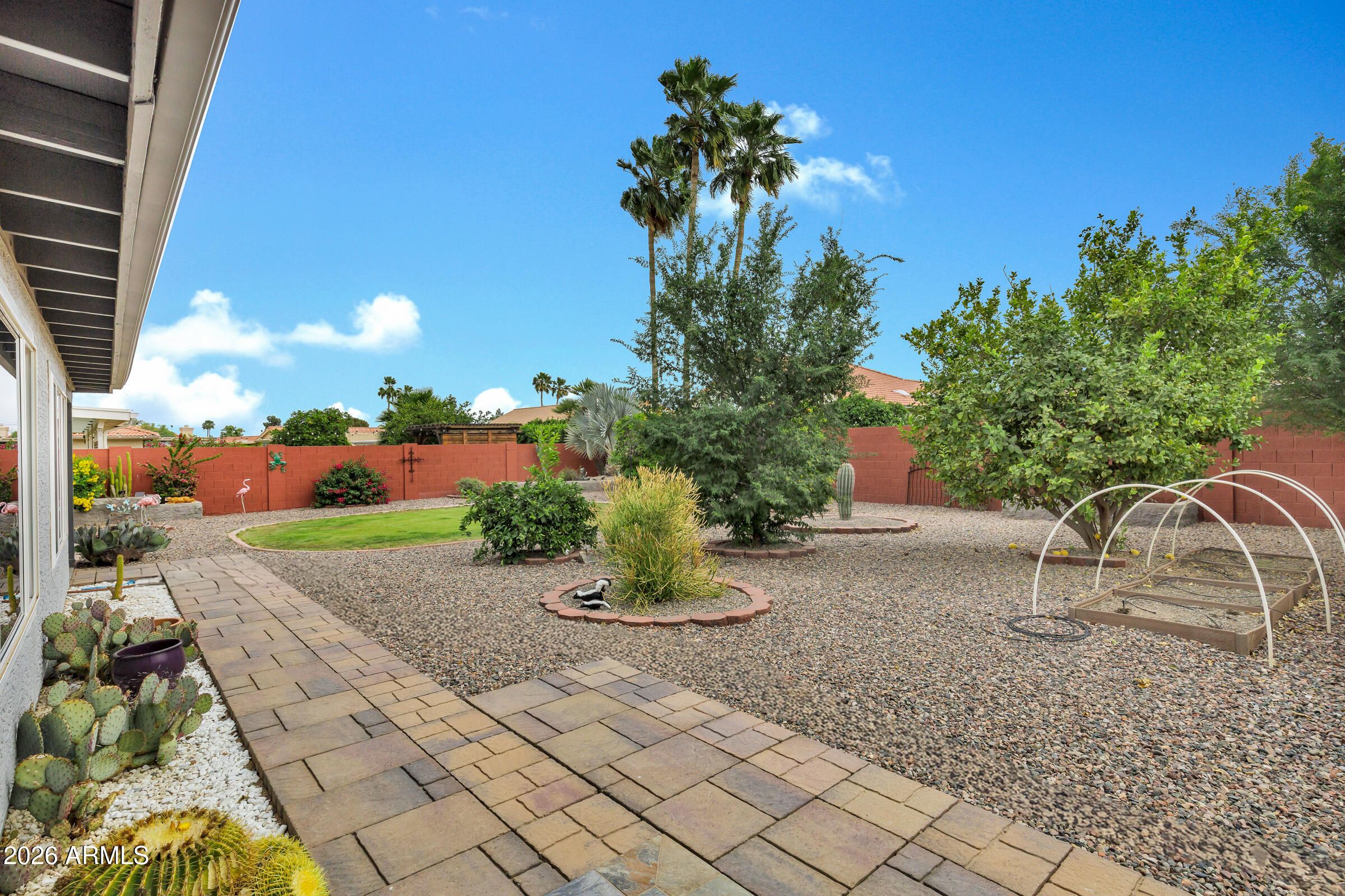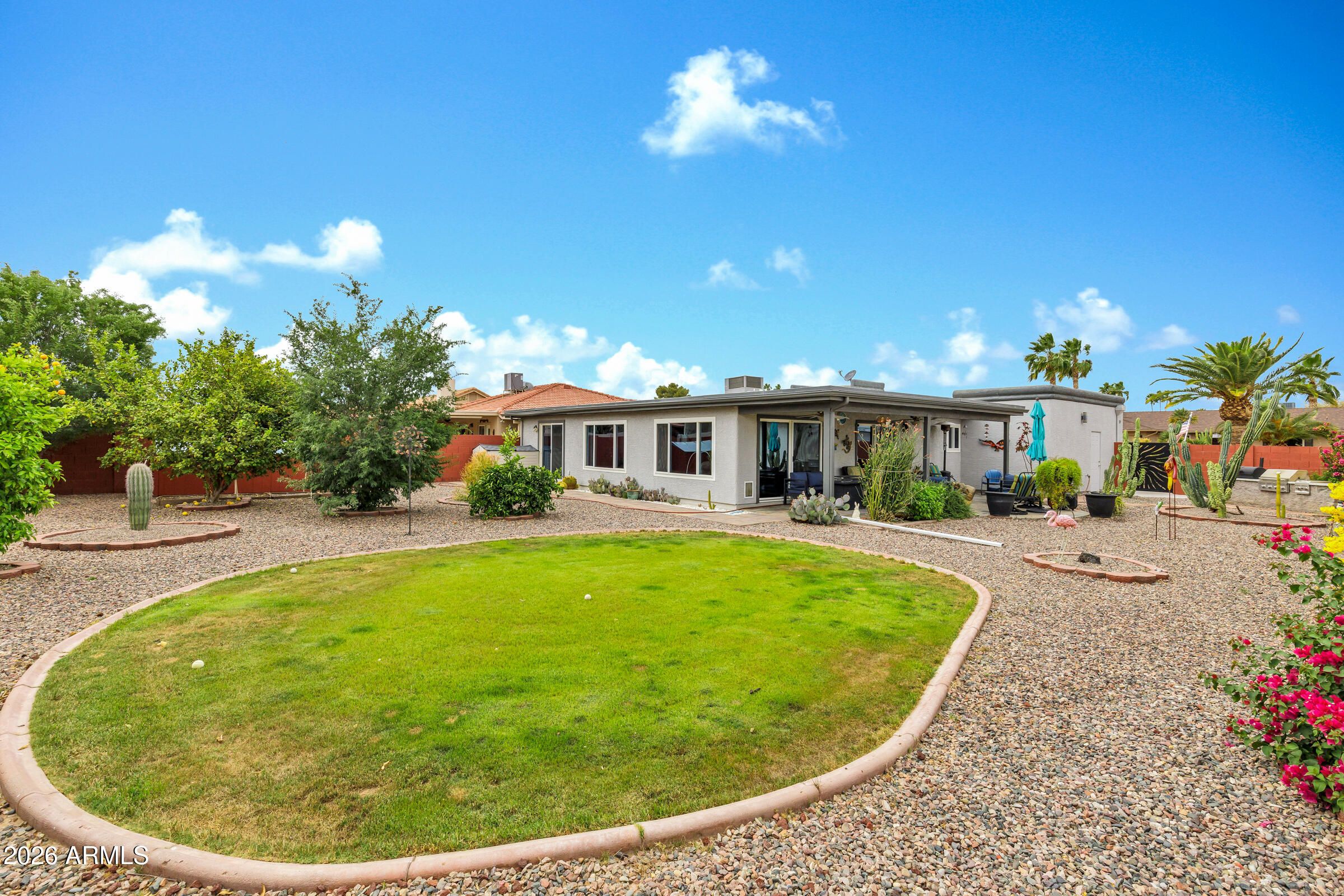 Rare opportunity in Sun Lakes. Move-in ready 2 bed / 2 bath single-level home with a private, beautifully landscaped backyard in one of Arizona's most sought-after 55+ communities. This home checks all the boxes buyers are looking for: open-concept layout, abundant natural light, upgraded finishes, and true indoor-outdoor living. Thoughtfully remodeled and meticulously maintained, this home is ready for you to move in with total peace of mind. Step inside to timeless travertine tile flooring, abundant natural light from oversized high-efficiency windows, and an open-concept layout that feels bright, inviting, and functional. The home was extensively remodeled in 2019, including doors, cabinetry, plumbing, bathrooms, and finishes throughout, resulting in a cohesive, elevated design. The eat-in kitchen is the heart of the home, featuring granite countertops, rich wood cabinetry, tile backsplash, stainless steel appliances, and ample prep and storage space. It flows seamlessly into the main living area and formal dining space, with upgraded patio doors leading directly to the covered patio for effortless indoor-outdoor living. The spacious primary suite is filled with natural light and offers private access to the backyard through glass sliders. It features two closets, each equipped with a ClosetMate system for optimal organization. The ensuite bath includes dual vanities and a beautifully upgraded walk-in shower with floor-to-ceiling tile. The secondary bedroom is generously sized with ample closet space, ideal for guests, while the den offers flexibility for a home office, hobby room, or additional living space. The backyard is a true standout, designed for entertaining and everyday enjoyment. A fully enclosed covered patio opens onto low-maintenance desert landscaping, mature fruit trees, and a custom outdoor kitchen with a grill, smoker, and side burners. This private outdoor retreat is perfect for hosting, relaxing, or enjoying quiet Arizona evenings. Additional features include a spacious two-car garage, an extended golf cart garage, and a 9x12 storage area. Both garages feature durable epoxy flooring and built-in cabinetry for excellent storage. Major system updates provide added value and efficiency, including a newer AC unit (2023), a recoated foam flat roof in 2024 for enhanced insulation and energy efficiency, and exterior paint completed in 2024. Living in Sun Lakes means enjoying one of Arizona's premier active adult communities, offering resort-style amenities including multiple golf courses, clubhouses, fitness centers, pools and spas, tennis and pickleball courts, walking paths, and countless social clubs, classes, and activities. With beautifully maintained grounds and a vibrant, active lifestyle, Sun Lakes provides the perfect blend of relaxation, recreation, and community.
