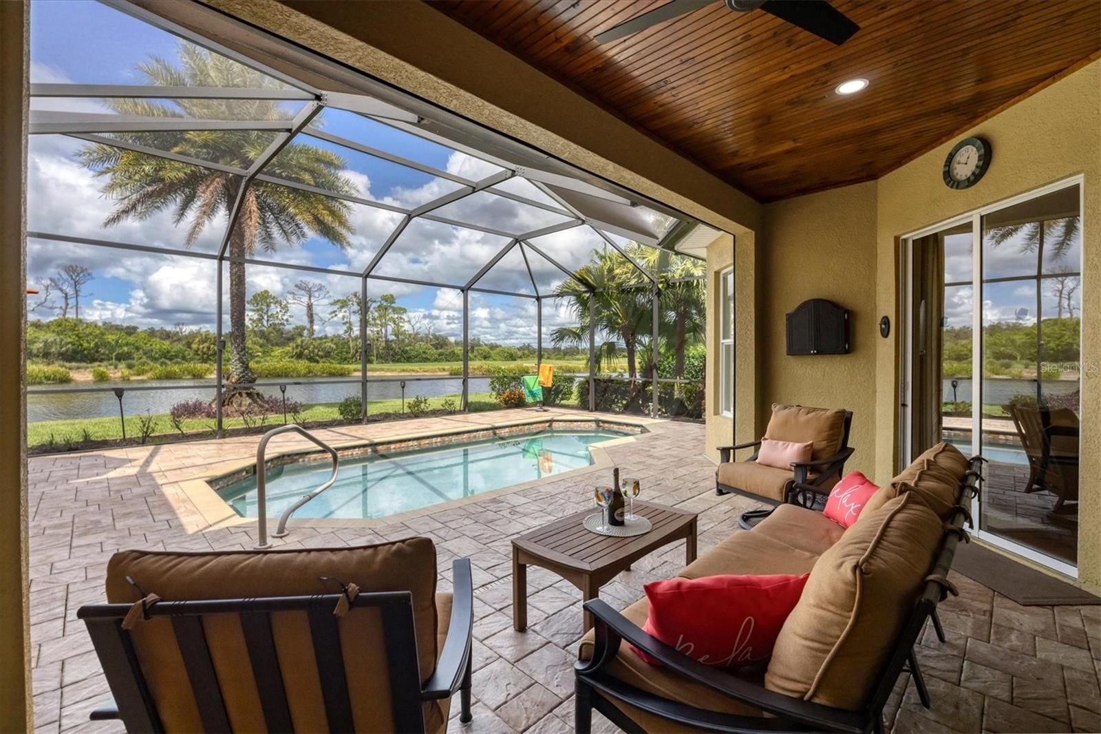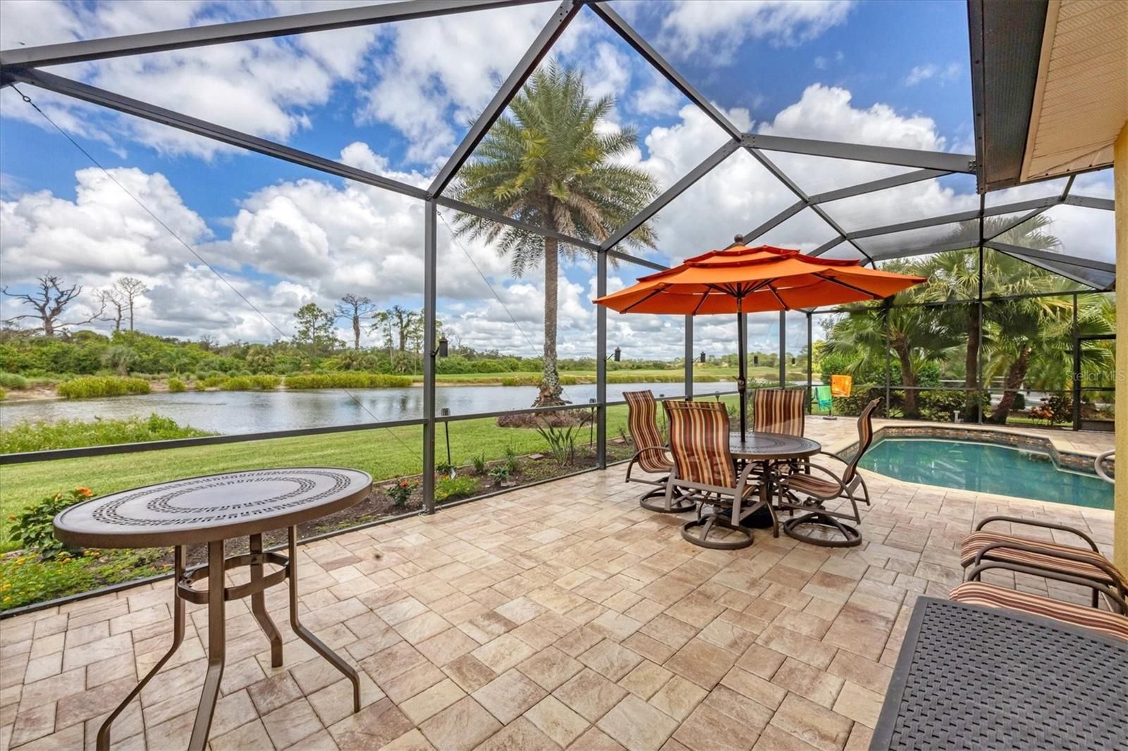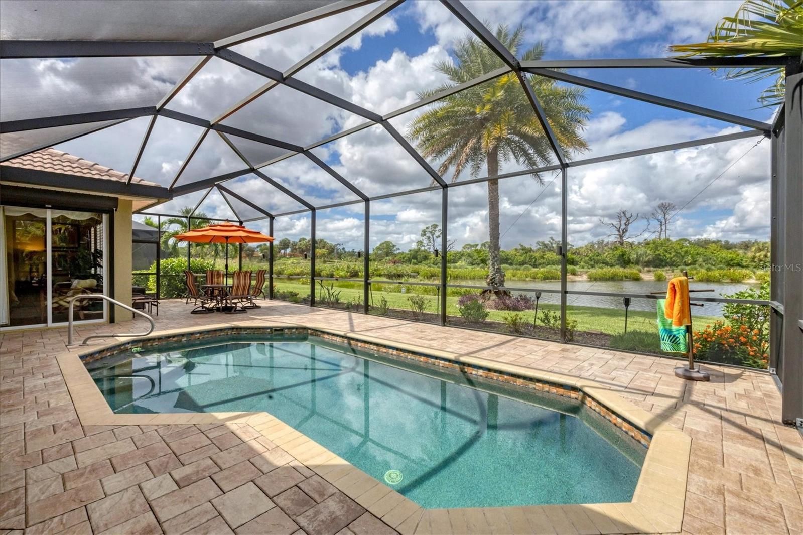 Heron Creek Golf & CC **STUNNING LAKE/GOLF FRONTAGE** This Estate POOL home boasts 3 BEDROOMS + DEN /2BATH/2 HALF BATH/ & a 3 CAR GAR w/ room for toys & GOLF CART too! Savor PANORAMIC Lake views & #4 of the Creek Course. FLOOD ZONE X If you have been searching for a home that checks all the boxes, here she is! This casually elegant RYLAND EXECUTIVE home boasts a NEW TILE ROOF (2023) Fabulous KITCHEN UPDATE 2025 w/NEW QUARTZ Counters a floor plan JUST UNDER 2600 SQ FT well suited to "easy living" & entertaining, 3 BED/ 2 FULL BATHS, DEN/OFFICE w/ adjacent powder room & resort style POOL w/ POOL BATH. This Premium Home site features, lush landscaping & curb appeal that is off the charts w/ a custom paver driveway, stack stone accents & mutli dimensional roof line! Nothing epitomizes “southern hospitality’’ like a covered front porch plenty of room for bench seating & leaded glass doors to welcome you home! Once inside you will realize this home is not like all the rest, the view will immediately take your breath away and will forge an amazing first impression. The list of upgrades is long & includes unique design details, & stylish décor. The flowing layout features front foyer entry, den/office, dining room, OPEN CONCEPT GREAT ROOM, island Kitchen, 2 guest rooms w/ full bath, & Master w/ Updated en suite bath. Interior decor & design selections tastefully creates an "island vibe" & features, accent wall treatments, upgraded lighting and fans, Classic PLANTATION SHUTTERS, custom window treatments, rich maple ENGINEERED HARDWOOD flooring, volume and tray ceilings, & many unique architectural features! The spacious kitchen is outfitted w/SS Appliances inc NATURAL GAS slide in range, timeless quartz countertops & generous wood cabinetry! The kitchen is perfect for entertaining w/lots of room for party prep, large counter height island, lots of storage w/ 42’” upper cabinets & closet pantry! The Great room has cascading sliders that open directly to the lanai which is quite simply an outside oasis! On the lanai you will enjoy generous undercover space with RICH HARDWOOD INLAID CEILNG as well as an extended area for soaking up the rays & watching the unbelievable array of birds on parade on the water, Other notable exterior lanai features include a desirable bronze screen enclosure, paver pool deck, PEBBLE-TECH pool surface w/ decorative accent tile,& unobstructed views of the lake, course & preserve beyond! After a long day enjoying paradise, you can retire to the Master Retreat w/its refreshed “Spa-worthy", granite vanity w/ dual sinks, soaking tub and gorgeous shower! This home is simply IMMACULATE & move in ready.1-YR HOME WARRANTY INCLUDED for peace of mind !STORM SMART ROLL DOWNS on lanai/Master bed slider. Golf Cart and furnishings may be available under separate contract. Heron Creek Golf & CC offers a spectacular 21,000 sq ft Clubhouse, a wide array of social activities, 27-hole AUTHUR HILLS designed championship golf course & practice facility, Tennis, fitness center & resort pool. Required membership as low as $268 /month. HOA fees incl: ground maintenance, irrigation, mulching, Cable, High Speed Internet & guarded gate entry! Hurry "Nothing Compares" the only thing this home is missing is you! Heron Creek is centrally located w/ easy access to I-75, gulf beaches, downtown Venice, Wellen Park, Braves stadium & local airports. JUST 2 MILES TO THE NEW 557 MILLION DOLLAR SMH HOSPITAL (Now under construction) AT 1-75 & SUMTER!!