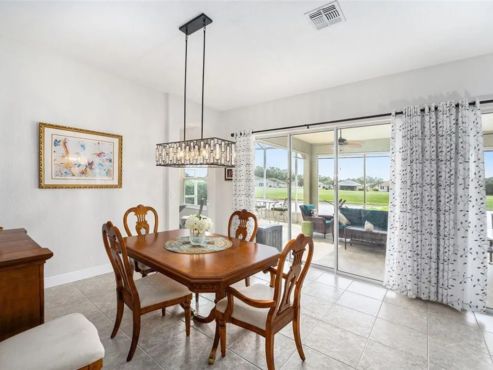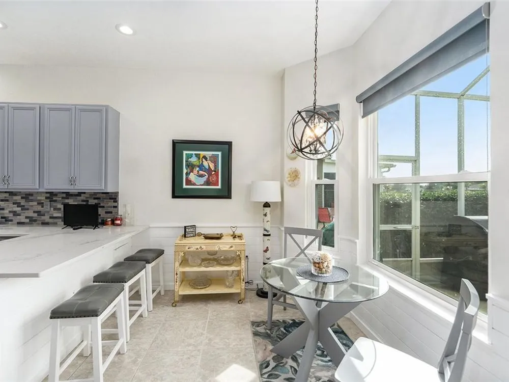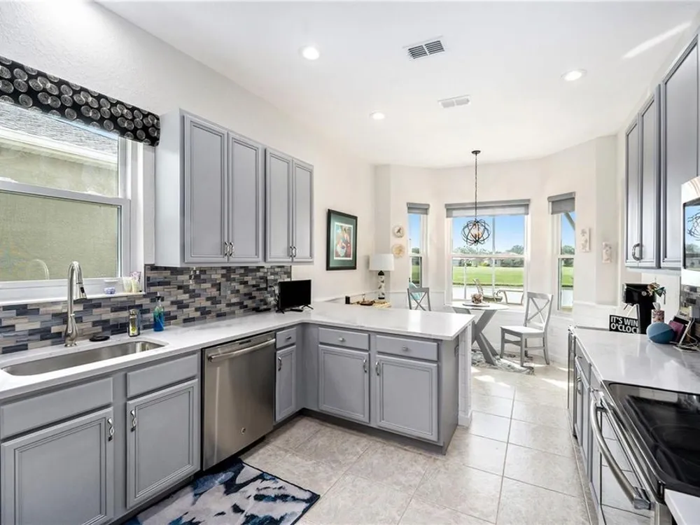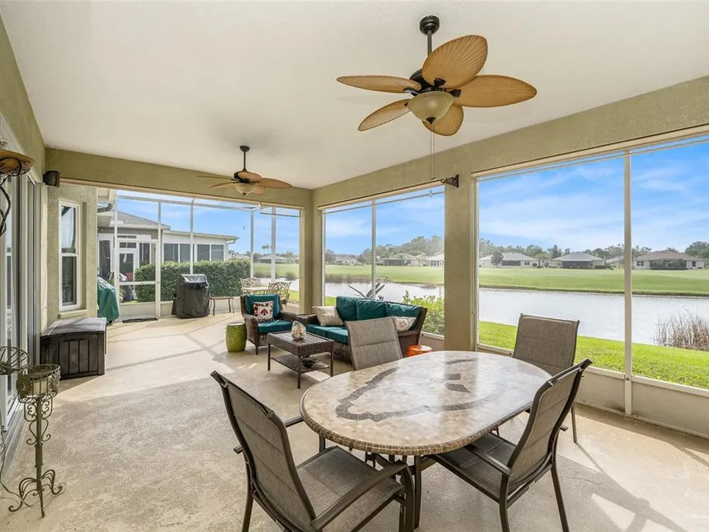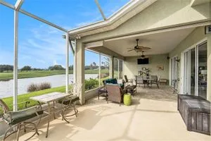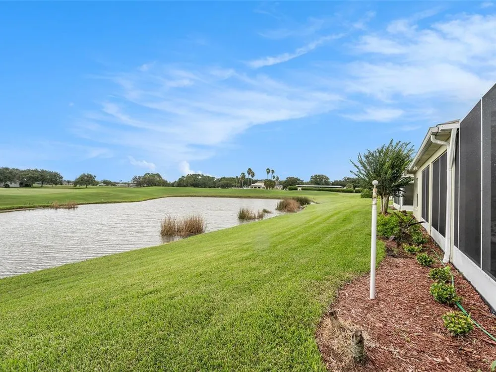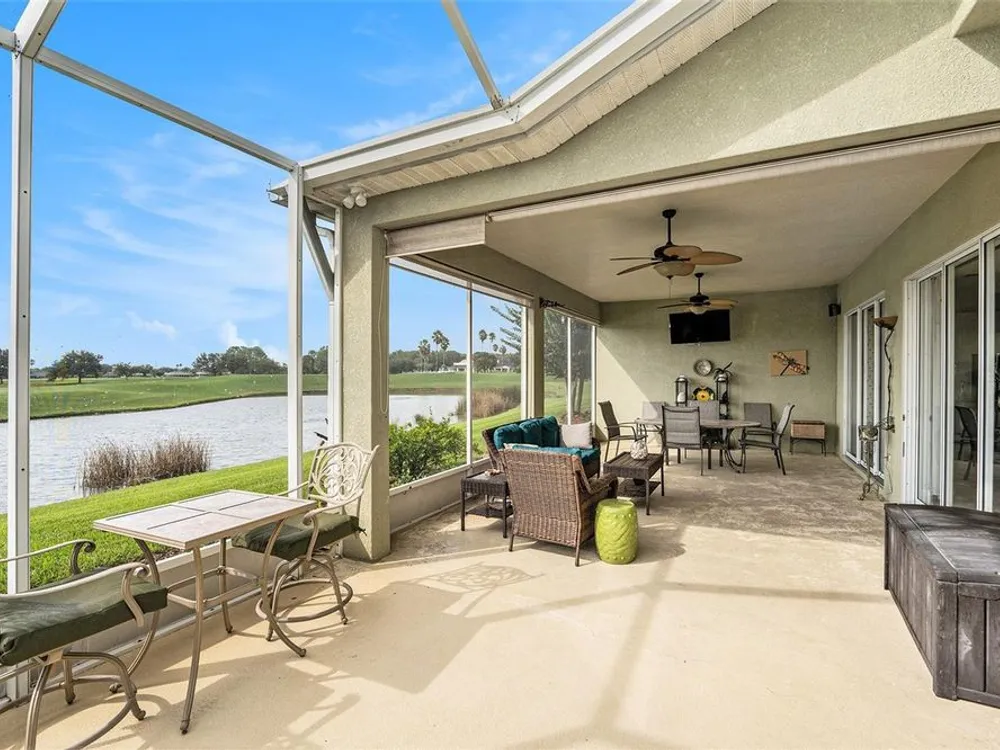 Beautiful Golf Course & Pond Views. Located in the sought-after 55+ community of Tampa Bay Golf and Country Club, this 3-bedroom home combines modern updates with stunning outdoor scenery. Step inside through a decorative glass front door into a spacious great room with 9.5-foot ceilings. Two sets of tinted sliding glass doors open to an oversized screened lanai with panoramic views of the pond and 10th hole. The kitchen has been recently remodeled with stainless steel appliances, quartz countertops, glass-tile backsplash, abundant cabinetry, pantry, and a dine-in area. The primary bedroom suite offers two closets, including an extra-large walk-in, plus a tiled shower with frameless glass enclosure and a relaxing whirlpool tub. The guest bathroom features a striking glass bowl sink with matching vanity cabinet. Updated light fixtures and ceiling fans add a modern touch throughout. Common rooms and wet areas have tile floors while bedrooms all have a matching luxury vinyl that complements the tile. The laundry room off the kitchen offers a stacked washer/dryer, utility sink, and broom closet for added convenience. Major updates include a new roof (2021), A/C (2019), and a tankless water heater for instant hot water. Enjoy access to resort-style amenities including two golf courses, swimming pools, fitness center, pickleball and tennis courts, and an on-site restaurant. HOA Fees include Cable, Internet, and Lawn Care. This home offers a low-maintenance, amenity-rich lifestyle with one of the best views in the community.