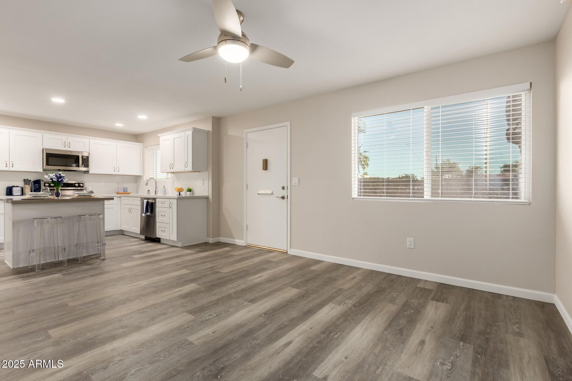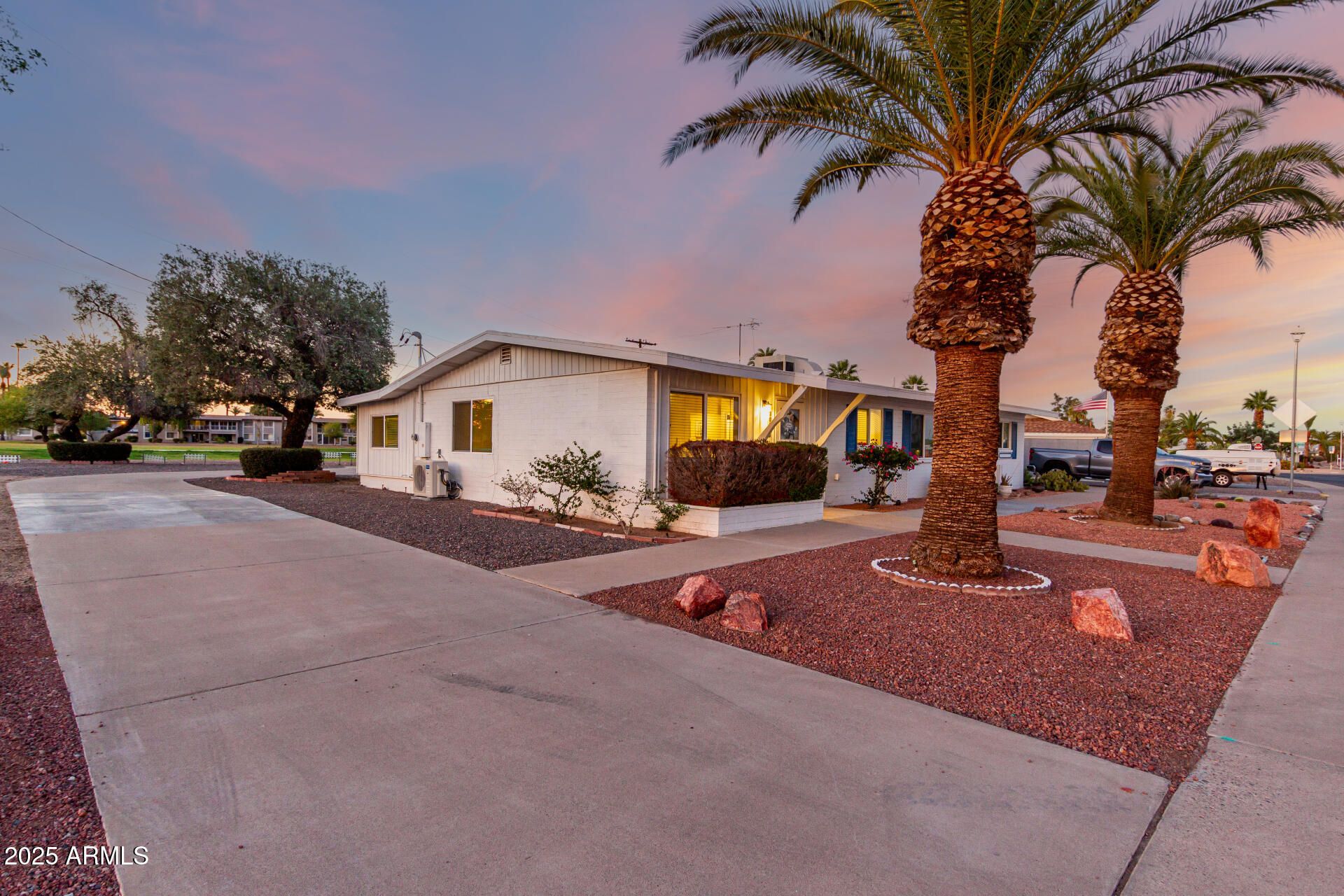 Welcome to your slice of Paradise! This FULLY renovated 2025 golf course gem sits on the 2nd hole of the Sun City south golf course, offering stunning views & serenity. Located in a vibrant 55+ community, this 2-bed, 2-bath home is full of surprises. The interior showcases a split layout with wood-look flooring, neutral paint, stylish updates throughout & natural light pouring in. Enjoy the peace of mind that comes with all-new plumbing, sewer & electrical. The pristine kitchen boasts shaker cabinetry, custom backsplash, solid-surface counters, stainless steel appliances, and a prep island. The private lock-off suite comes with its own kitchenette & laundry, perfect for guests, rental income, or creative studio space.