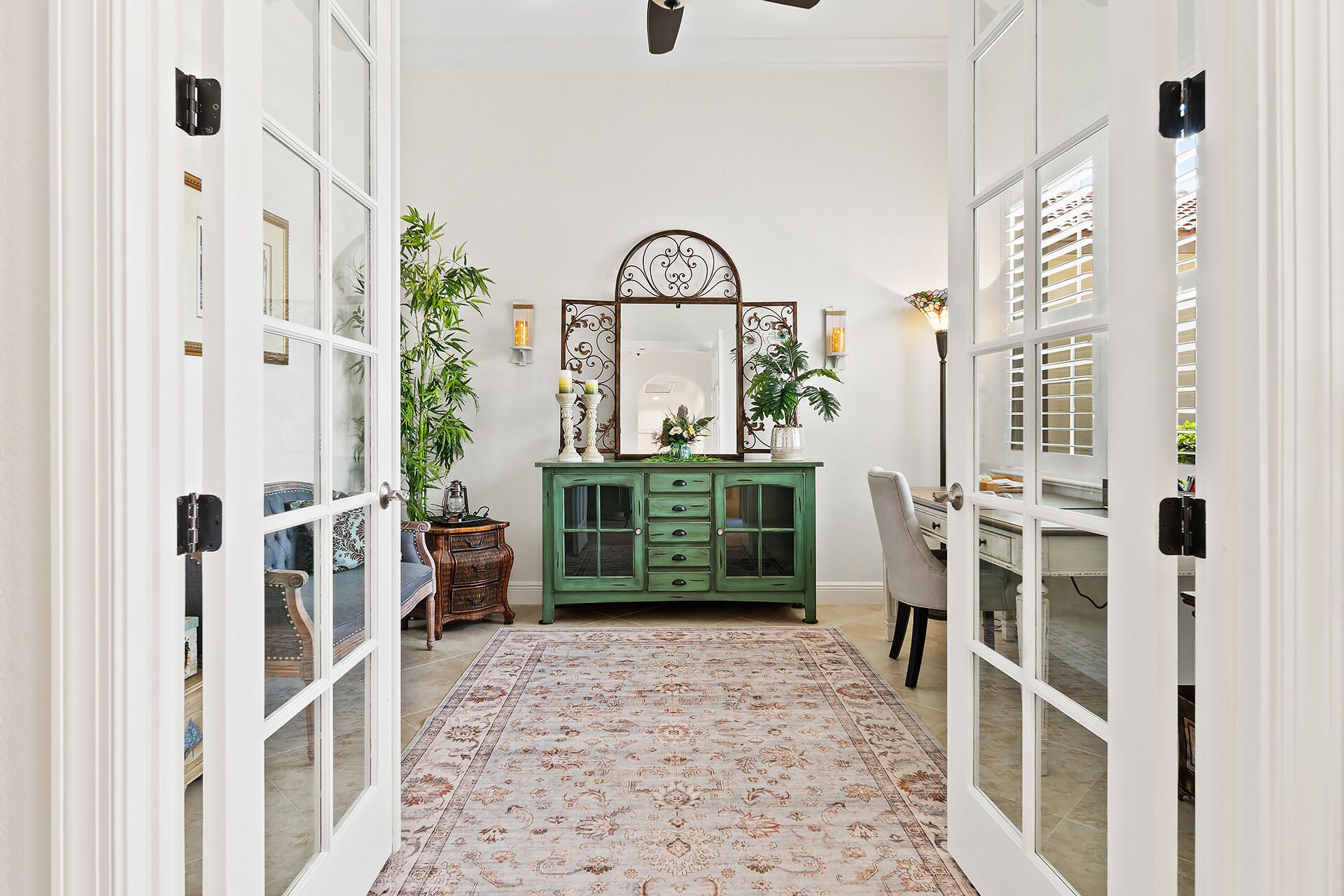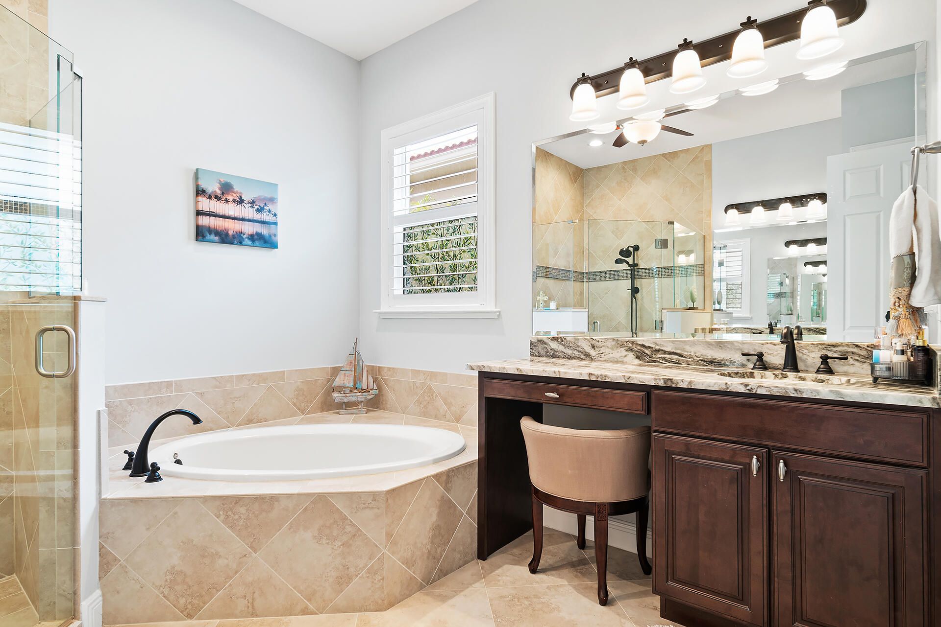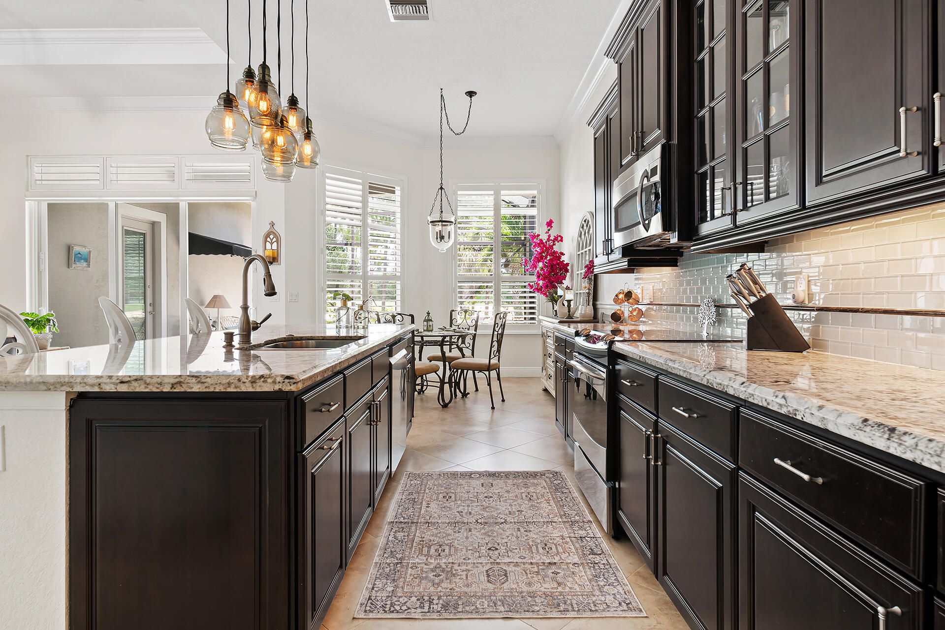 - Entrance Foyer, Pantry, Garden Tub/Roman Tub, Split Bedrooms, High Ceilings, Walk-In Closet(s), Home Office, Family/Dining Room, Eat-in Kitchen, Snack Bar, Impact Glass, Plantation Shutters, Dual Sinks, Separate Shower, Bathtub