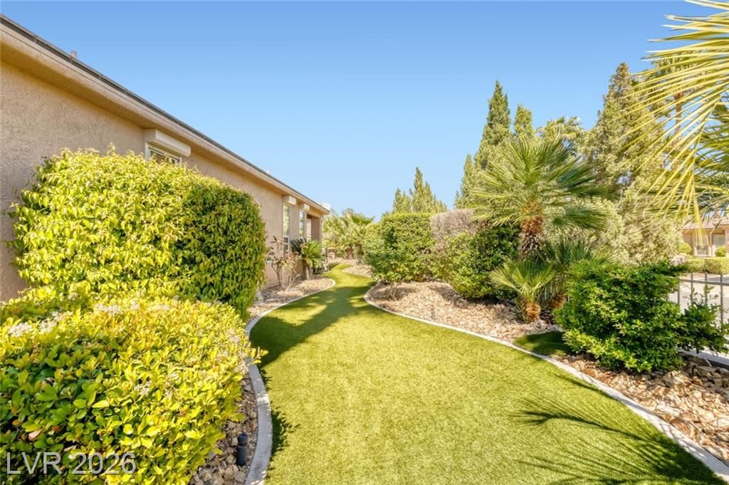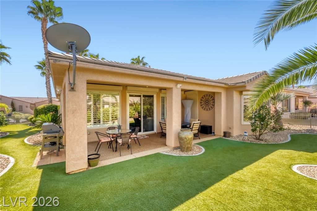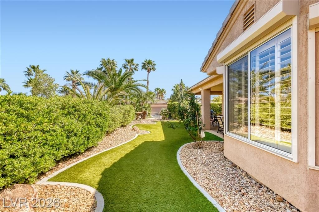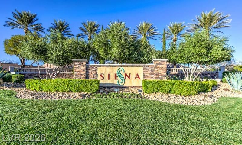 This beautifully maintained Mediterranean/Spanish-inspired home, upgraded with $120K in improvements, in Siena, features bright, inviting living spaces with light wood-style flooring, plantation shutters, and a seamless flow from the living room to the dining area and out to the private backyard. The spacious primary bedroom includes an ensuite with a double cherry-wood vanity, quartz counters, double shower, and private toilet room. The second bedroom offers a plantation-shuttered bay window, light carpet, and mirrored closet doors. A second full bath and a well-organized laundry room with garage access add convenience. Outside, the elevated corner lot showcases lush greenery, premium artificial turf, and some of the most impressive professional landscaping in Siena, creating a serene and private retreat.