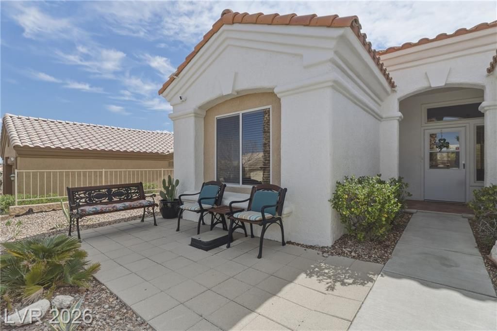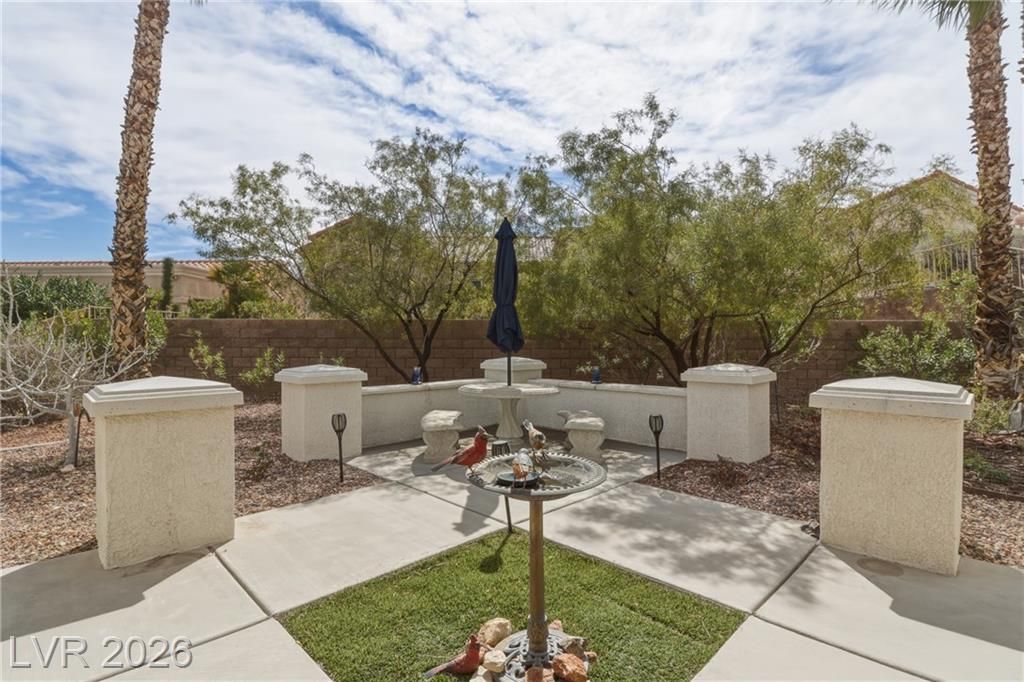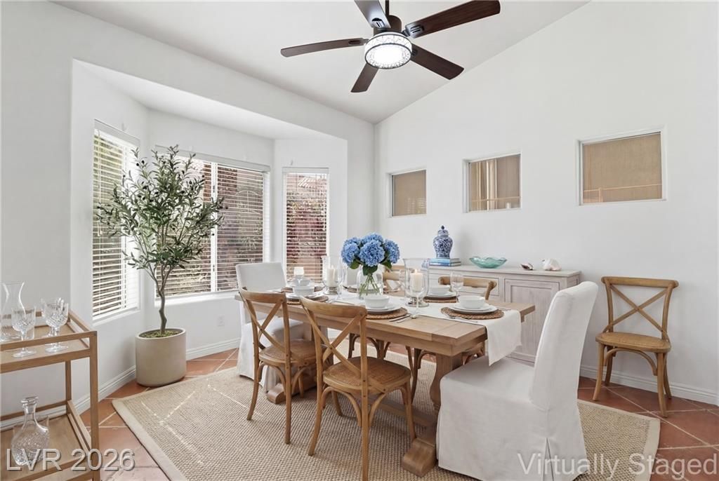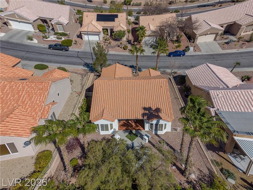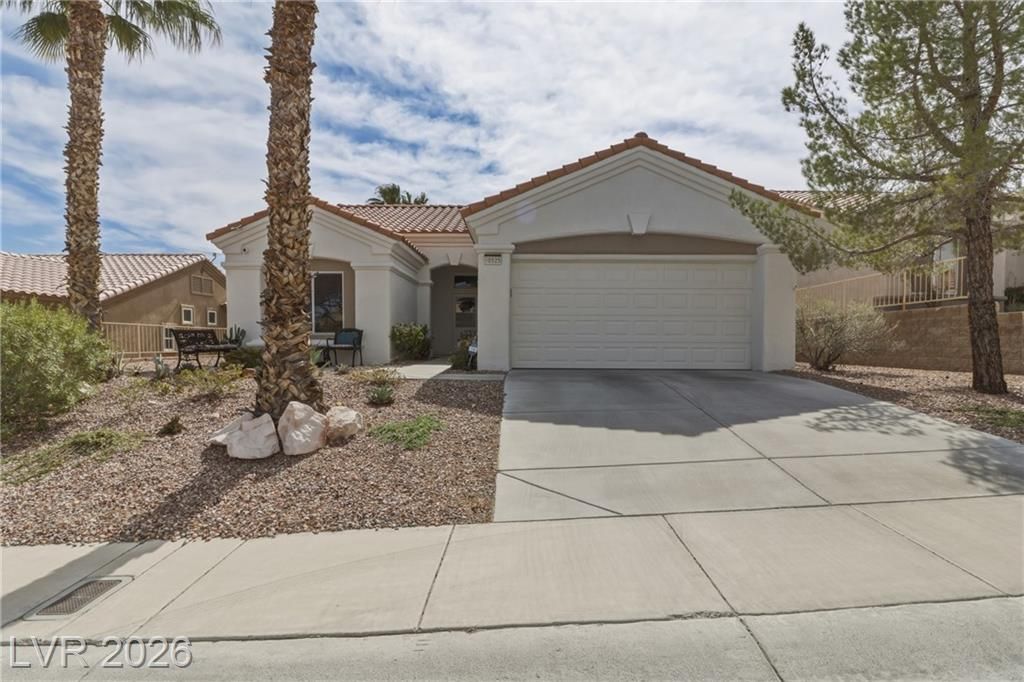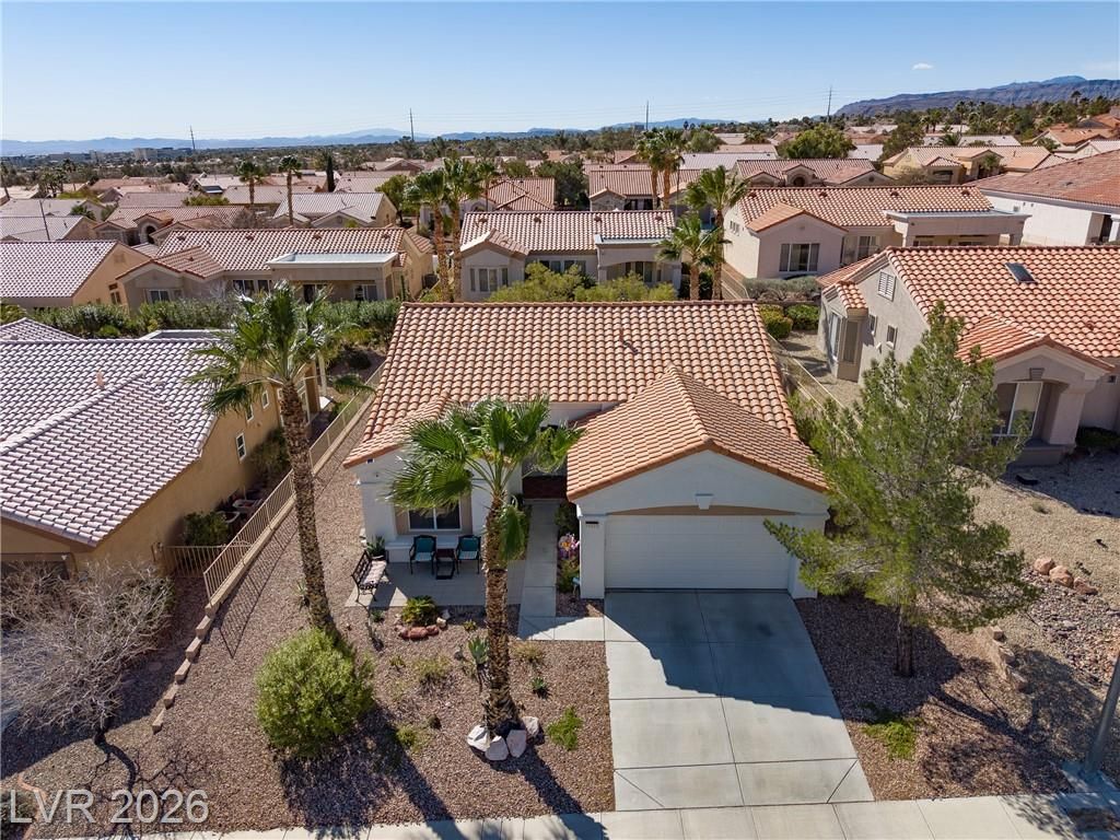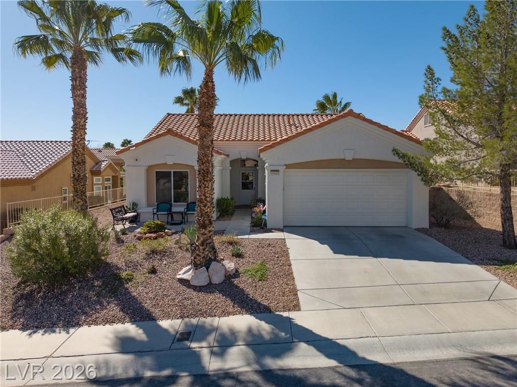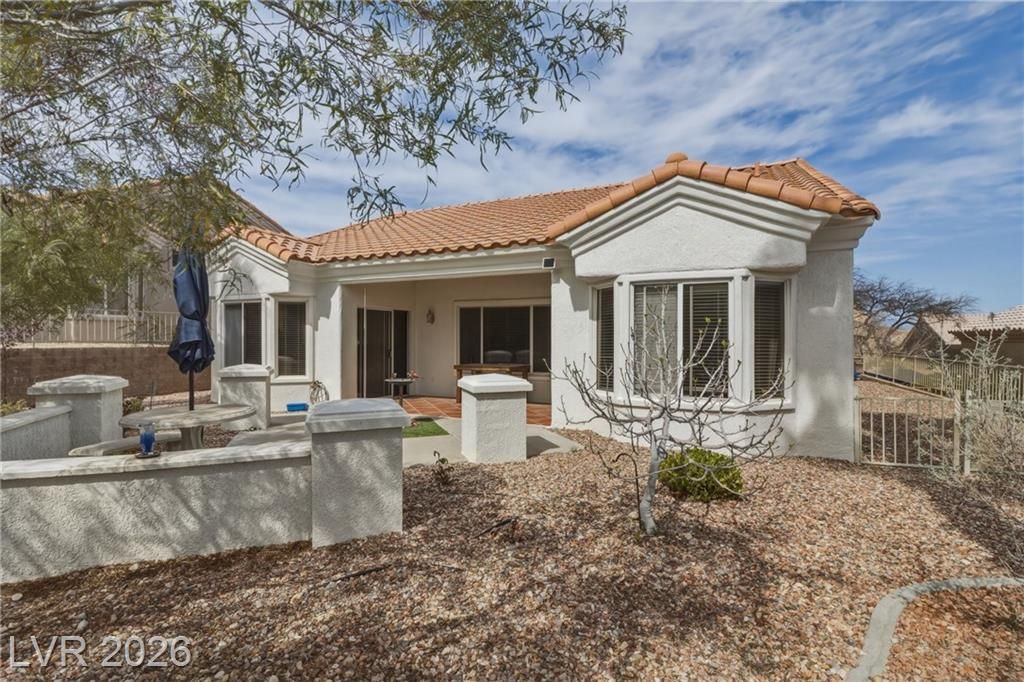 Discover your ideal retirement home in the 55+ community of Sun City Summerlin. This charming single-story gem features 2 bedrooms, 2 bathrooms, a fully fenced backyard, & a 2-car garage with golf cart parking. Inside, abundant natural light, high ceilings, & tile flooring create an open, airy feel. The living & dining areas flow seamlessly & open to the backyard through sliding doors—perfect for everyday living. The kitchen offers a breakfast bar, a casual dining area, built-in appliances, & plenty of cabinetry. The master suite features a bay window, a walk-in closet, & a private bath with a walk-in shower. A spacious secondary bedroom & a small flex room off the kitchen is ideal for an office or craft space. Step outside to a peaceful, Zen-inspired backyard with a covered patio & low-maintenance desert landscaping—perfect for relaxing. Enjoy Sun City Summerlin’s outstanding amenities, including a pool, golf course, clubhouse, tennis courts, and more designed for an active lifestyle.