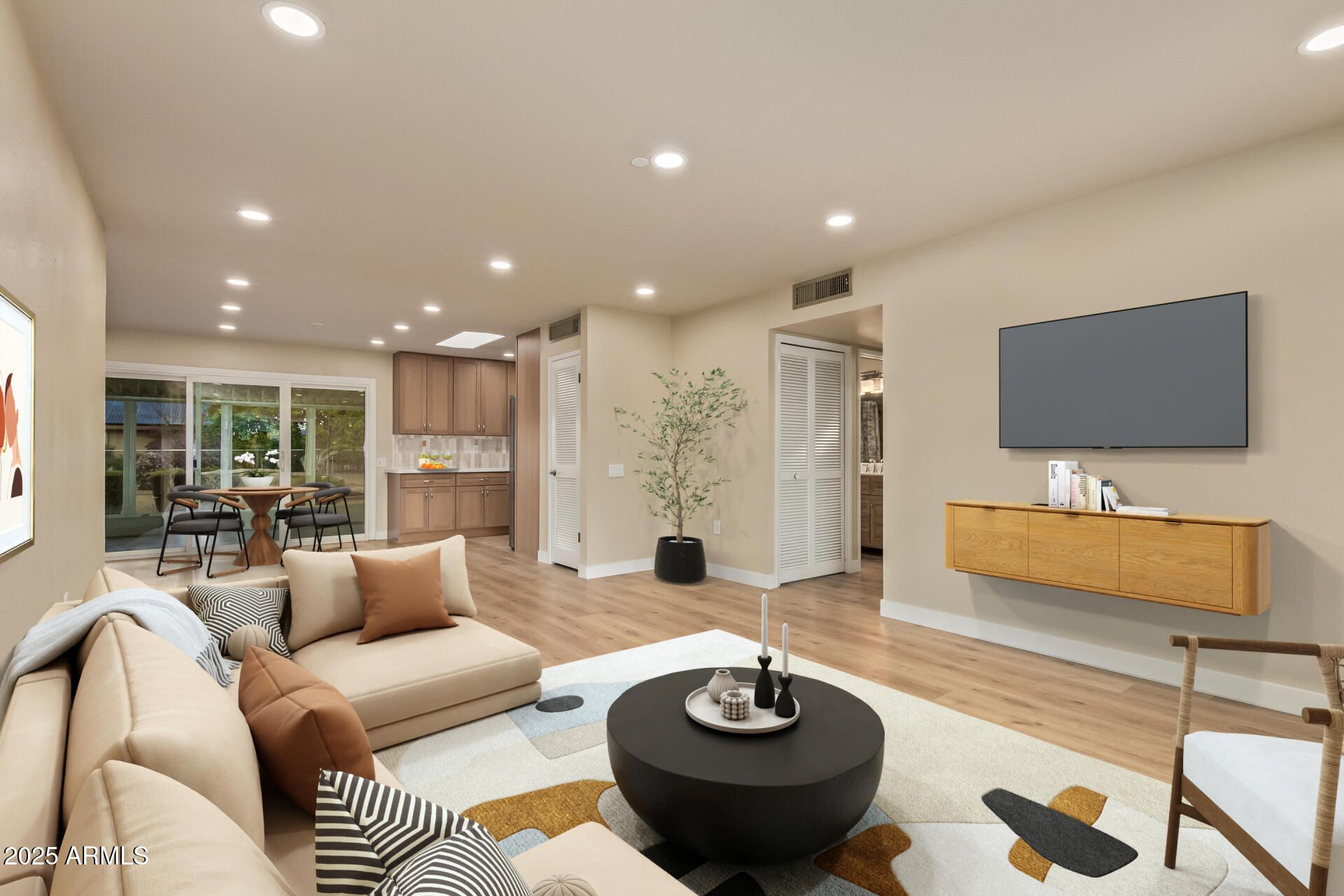 This stunning Sun City residence has been fully remodeled and is ready for you to move right in. Inside, you'll find brand-new vinyl plank flooring, high-quality white oak soft-close cabinets, sleek quartz countertops, and tastefully updated bathrooms. Major upgrades include a newer AC unit (2021), newer roof, energy-efficient windows, and a new water heater (2022). The open-concept layout is perfect for entertaining and hosting family gatherings, while the spacious fenced yard—nearly 9,000 square feet—features mature fruit trees and plenty of room to relax or garden. Enjoy Arizona's beautiful weather year-round on the expansive, full-length covered patio. In addition, an oversized tiled garage is the perfect place for car or golf cart parking and features a work bench, cabinets, utility sink, and extra space for storage. Located in the heart of Sun City, you'll have access to seven recreation centers, eight golf courses, gyms, pools, clubhouses, and an active, welcoming community offering endless activities and amenities.