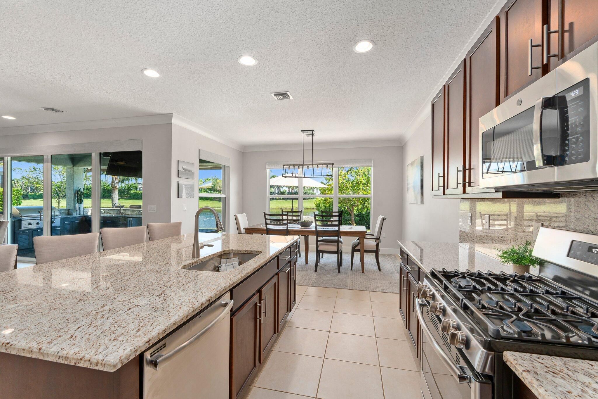Welcome to Valencia Cay at Riverland, a premier 55+ active lifestyle community! This highly desirable 3-bedroom, 2-bath, CBS home offers tranquil lake views and an extended paver patio with a stunning outdoor kitchen, bar, shower, and retractable awning—perfect for entertaining! Enjoy peace of mind with impact windows and sliders, tile roof, and an epoxy-coated garage floor. The interior features tile flooring throughout, a spacious kitchen with a huge island, gas stovetop, and on-demand gas water heater. Designer wood wall treatments, crown molding, and a remote-controlled thermostat add both comfort and style. This community offers its residents incredible resort-style amenities & an exceptional lifestyle. This is Florida living at its finest!