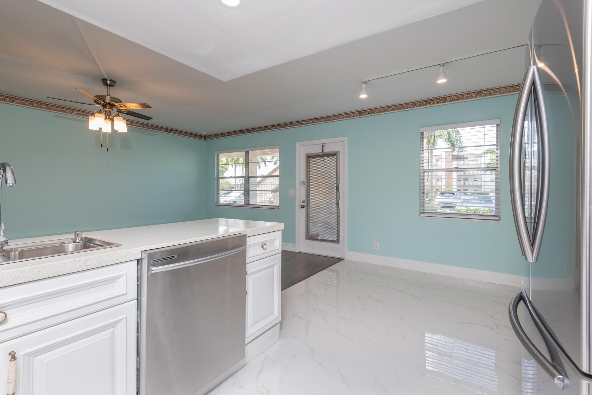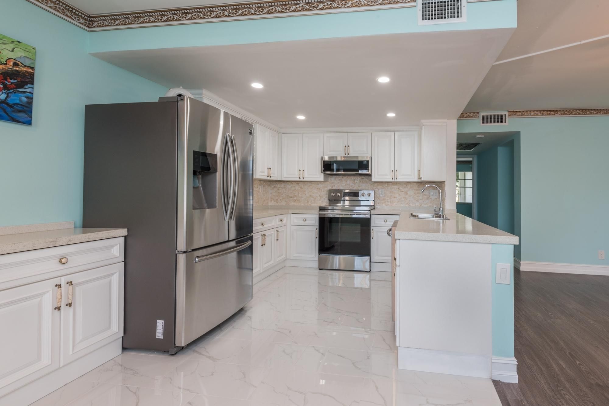 Stunning renovation of this convenient 1st floor condo in the wonderful Century Village community. Brand new AC and hot water heater installed. All wood kitchen with quartz counters and marble backsplash. Fully opened kitchen with extended cabinets to dining area. Full suite of Samsung Stainless Steel appliances. Quality laminate flooring in living and bedroom areas, Porcelain tile in kitchen, bathrooms and patio. Floor to ceiling tile in bathrooms. Enjoy the expansive lake views from your screened in patio. Bathrooms have ornate, solid wood, large vanity cabinets with matching mirrors and marble tops. Master bathroom has separate walk-in shower. New lighting fixtures and fans throughout.