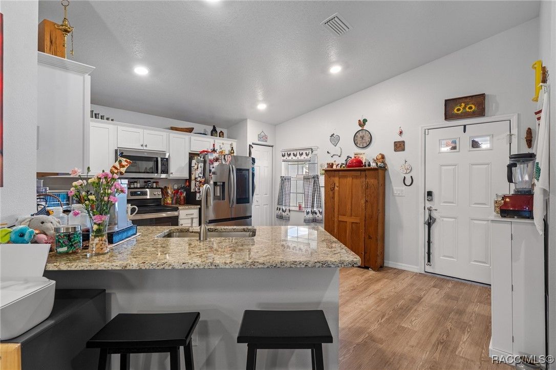 - Breakfast Bar, High Ceilings, Main Level Primary, Primary Suite, Open Floorplan, Stone Counters, Separate Shower, Vaulted Ceiling(s), Walk-In Closet(s), WoodCabinets, Window Treatments, Sliding Glass Door(s)