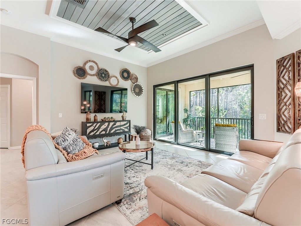 This rare second-floor carriage home in the Casella neighborhood at Pelican Preserve, a 55+ master-planned gated community, offers modern comfort and style. Completed in 2021, Casella was built to the highest building and energy efficiency standards, featuring updated interior design elements not found in older carriage homes. The home boasts stunning views of a pristine 41-acre preserve. Inside are 3 spacious bedrooms, 2 baths, a versatile flex room for a home office, media room, or hobbies, a private elevator for convenience, and a 2-car garage with an extra wide driveway for easy maneuvering. The expansive kitchen includes a sleek one-level quartz island, upgraded KitchenAid appliances and designer tile backsplash. Custom millwork throughout, luxury vinyl and tile flooring throughout - no carpet, and a custom closet organizers. The open-concept great room with 11-foot ceilings flows seamlessly to the spacious 29’ x 9’ tiled east-facing lanai, perfect for enjoying morning sun and cool afternoons. All windows and doors feature PGT impact glass for peace of mind. Pelican Preserve’s vibrant town center offers amenities like staffed fitness and wellness facilities, indoor and outdoor pools, tennis and pickleball courts, restaurants, entertainment, social events, a concert pavilion, cinema, and more. Casella is the only carriage home neighborhood with its own private pool, adding an exclusive touch. Optional golf memberships are available, and the location is just minutes from the airport, shopping, medical facilities, and endless activities.