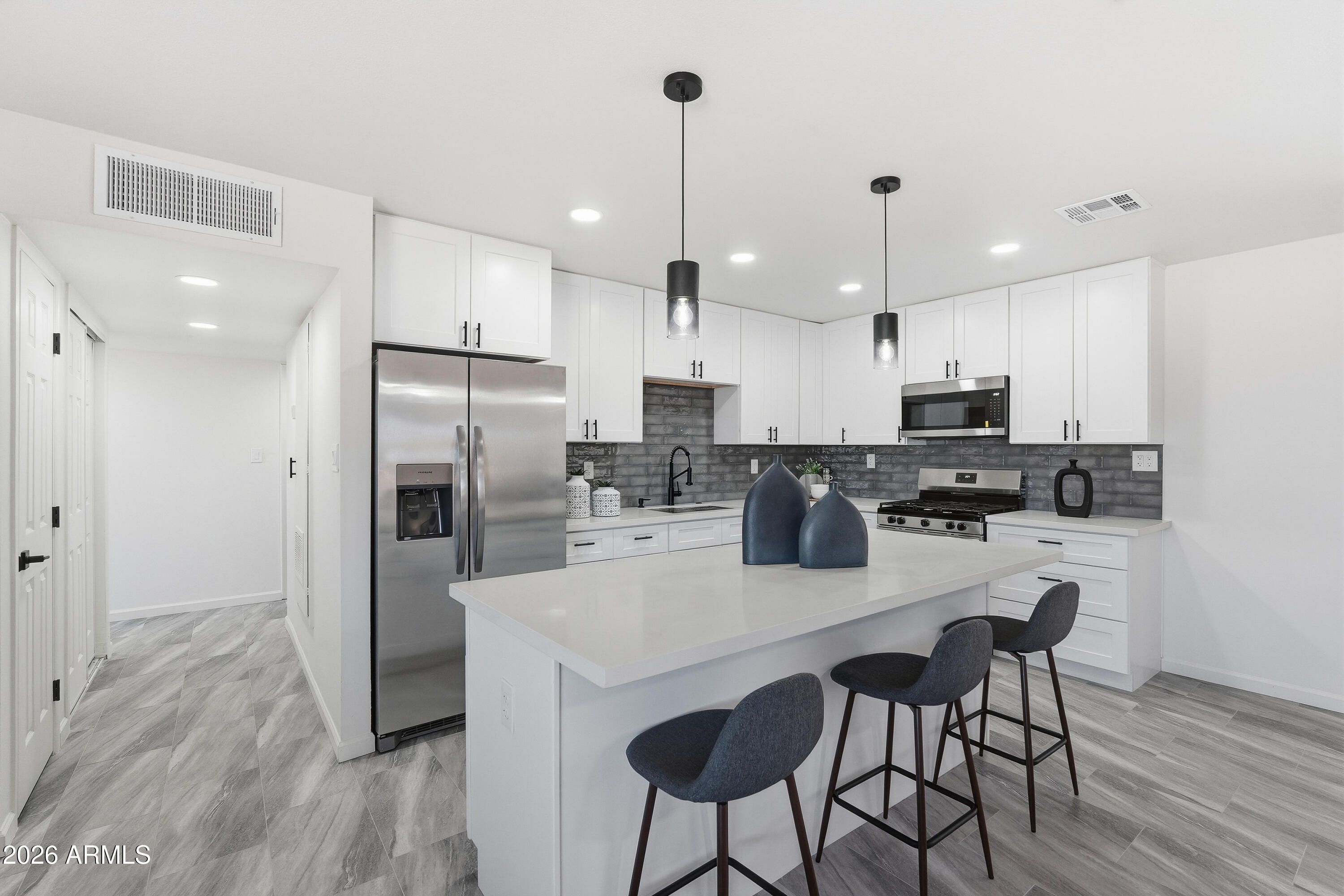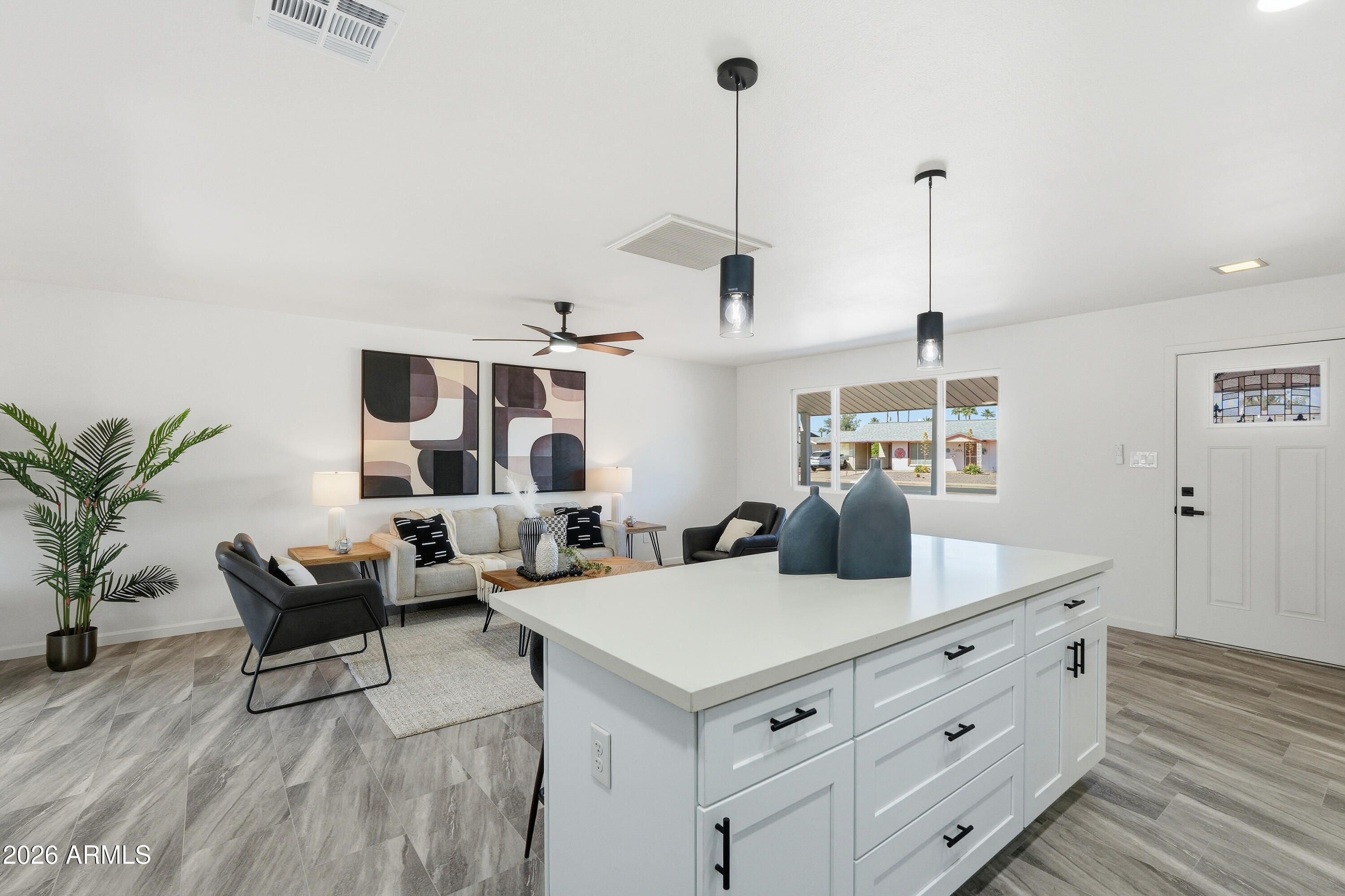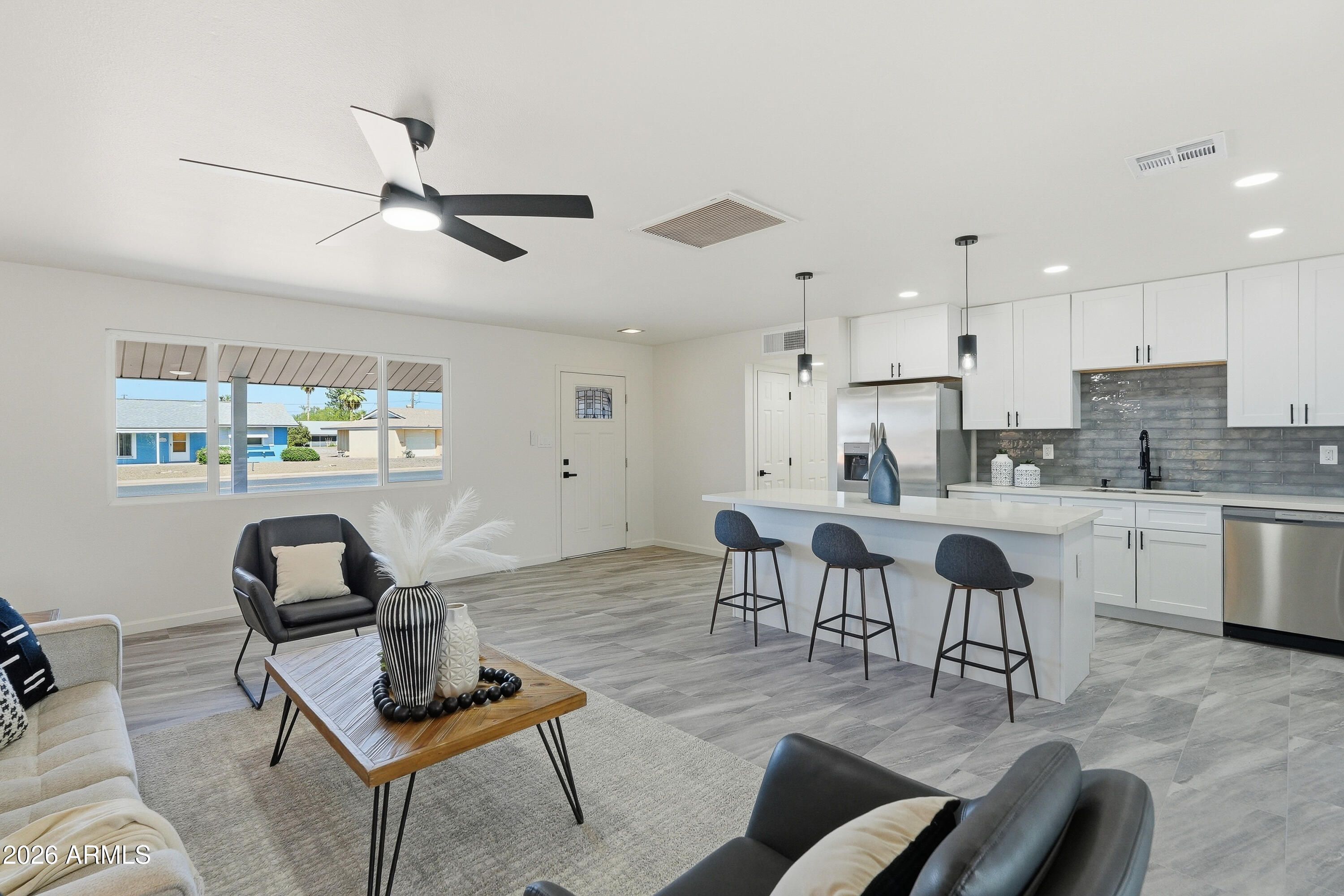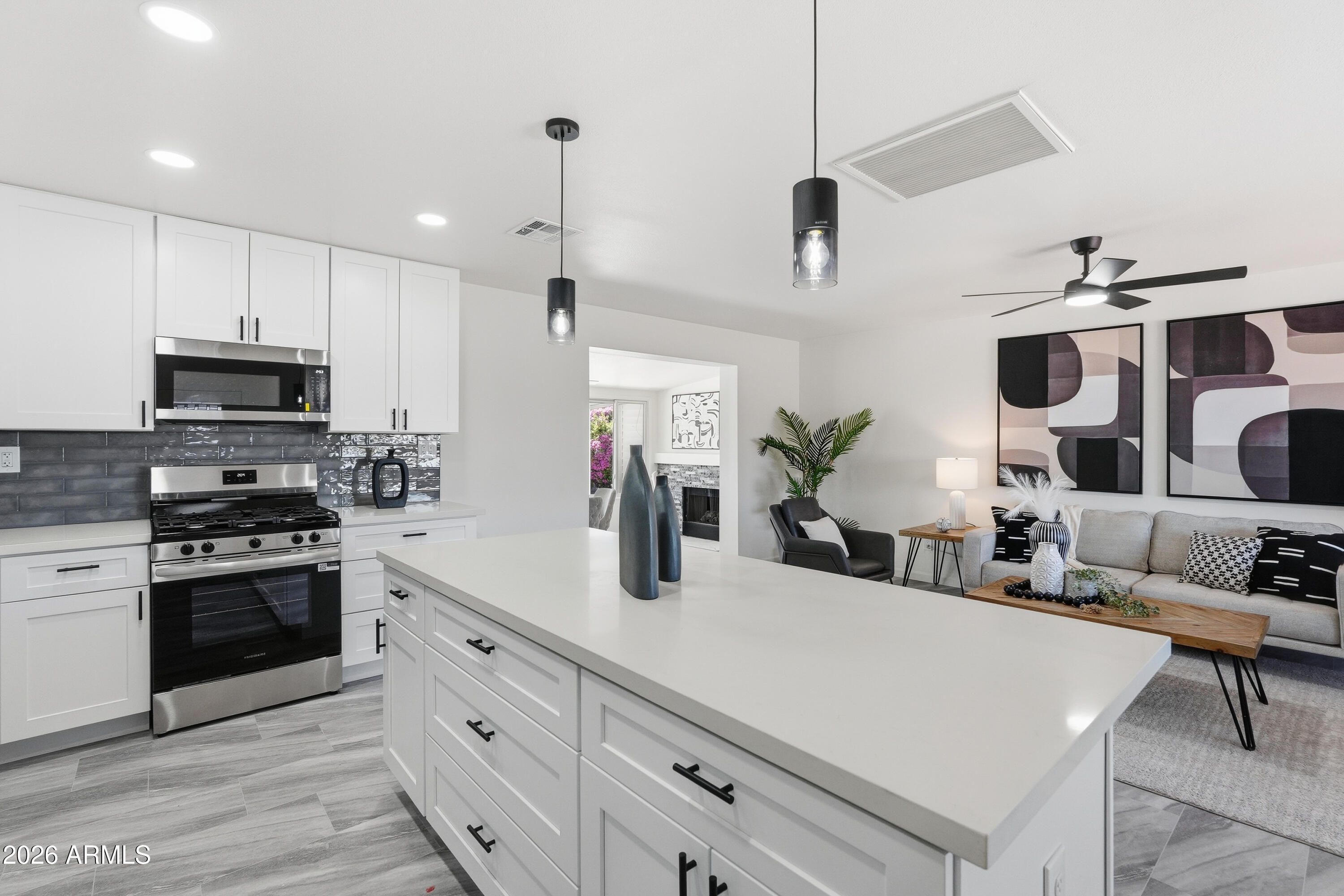 Step into luxury with this 3-bed, 2-bath ranch transformed by a $135k full remodel. The heart of the home is a stunning kitchen featuring a 7-foot custom island, white shaker soft-close cabinets, quartz countertops, and a designer backsplash. Relax in the finished Arizona Room by the custom stacked stone gas fireplace. Enjoy ultimate peace of mind with a NEW 2026 roof, NEW HVAC, and NEW double-pane windows. Save big with the paid-for solar system. The master suite offers a rare zero-threshold shower. Includes a private fenced yard, bonus hobby room, and luxury vinyl flooring throughout. This smoke-free, pet-free gem is better than new!
