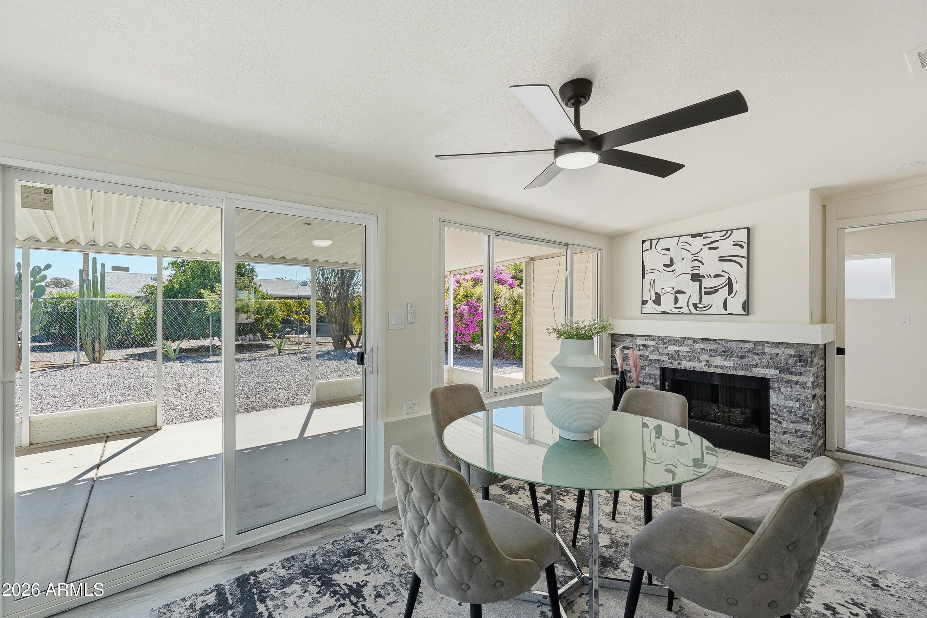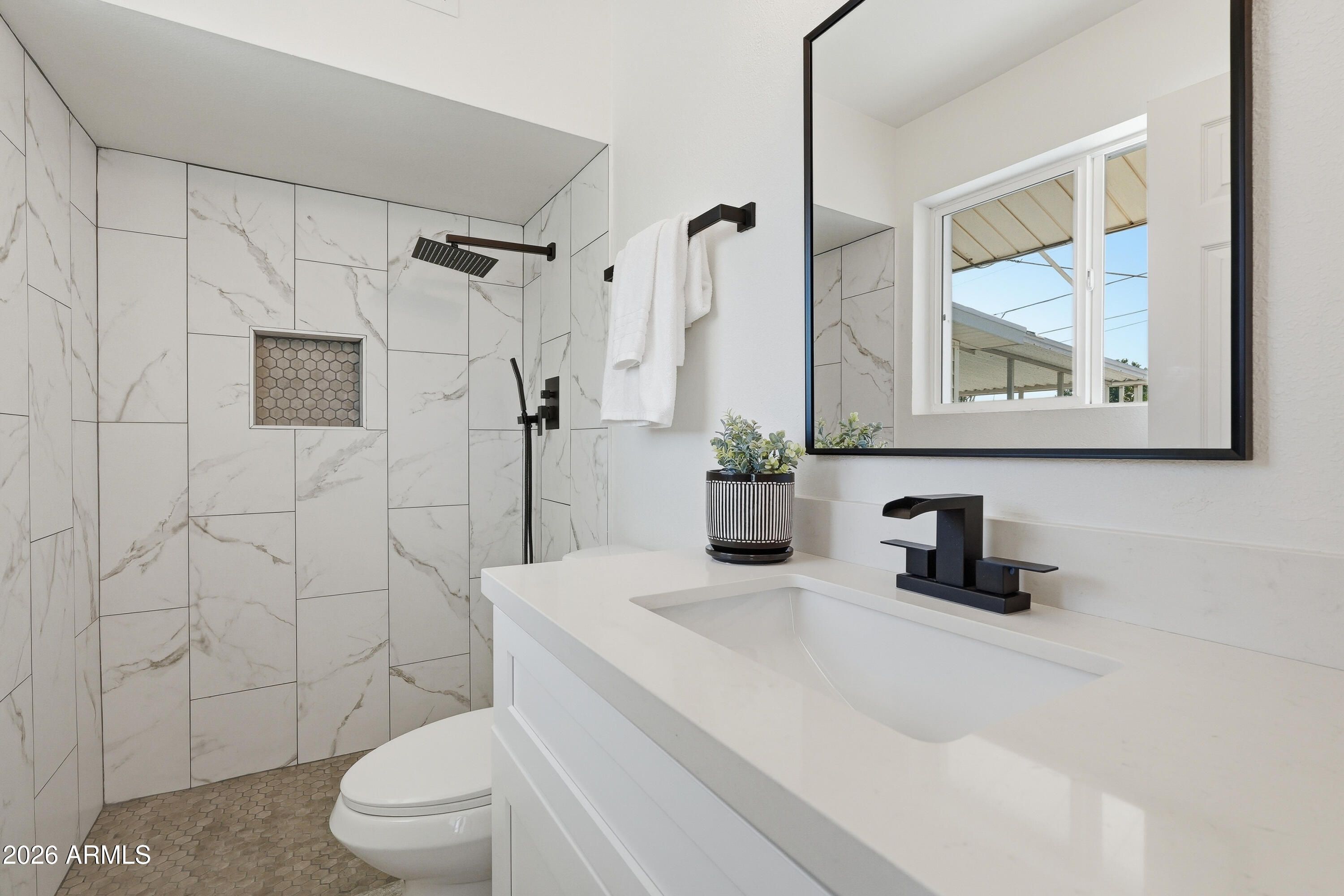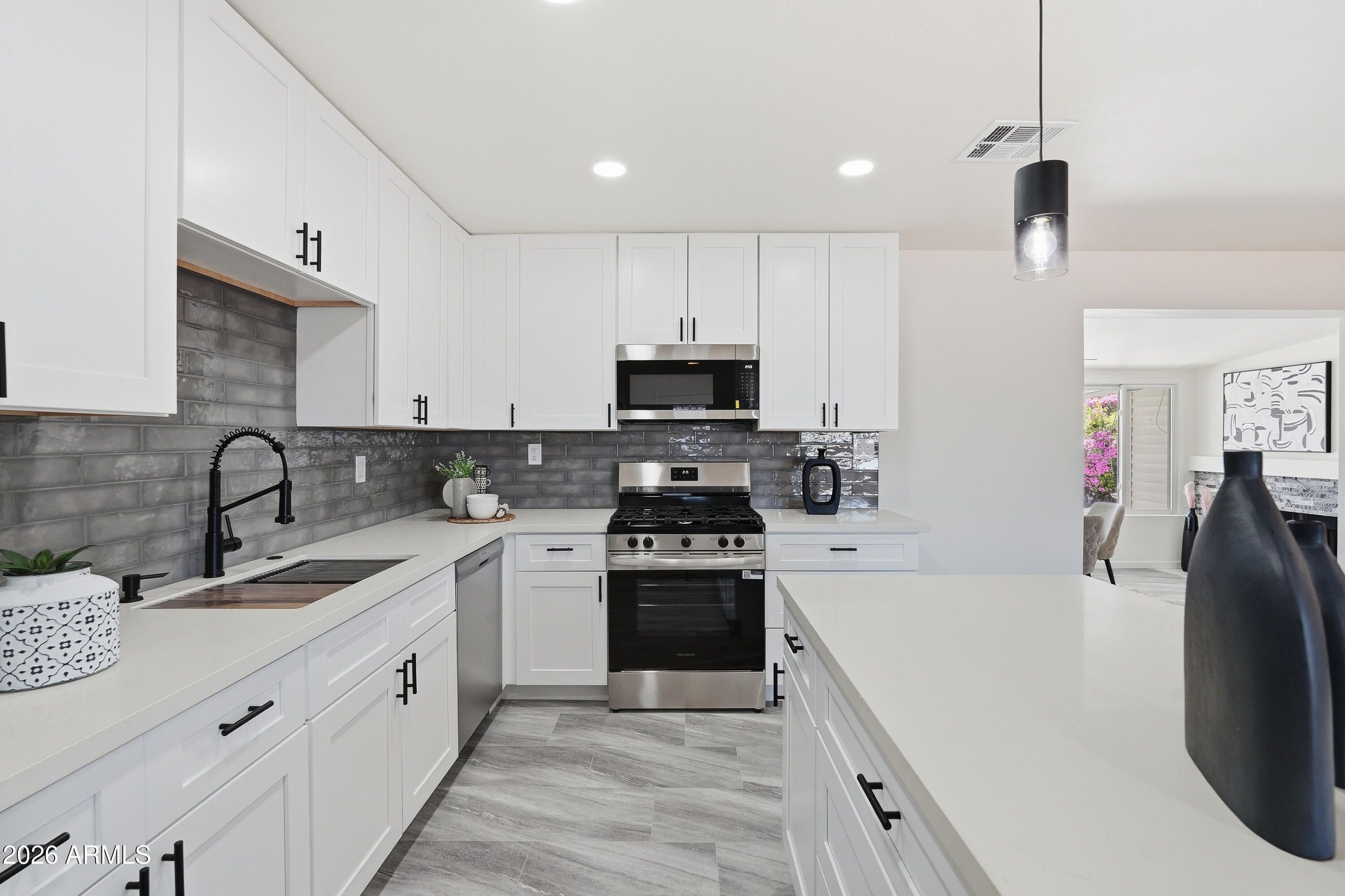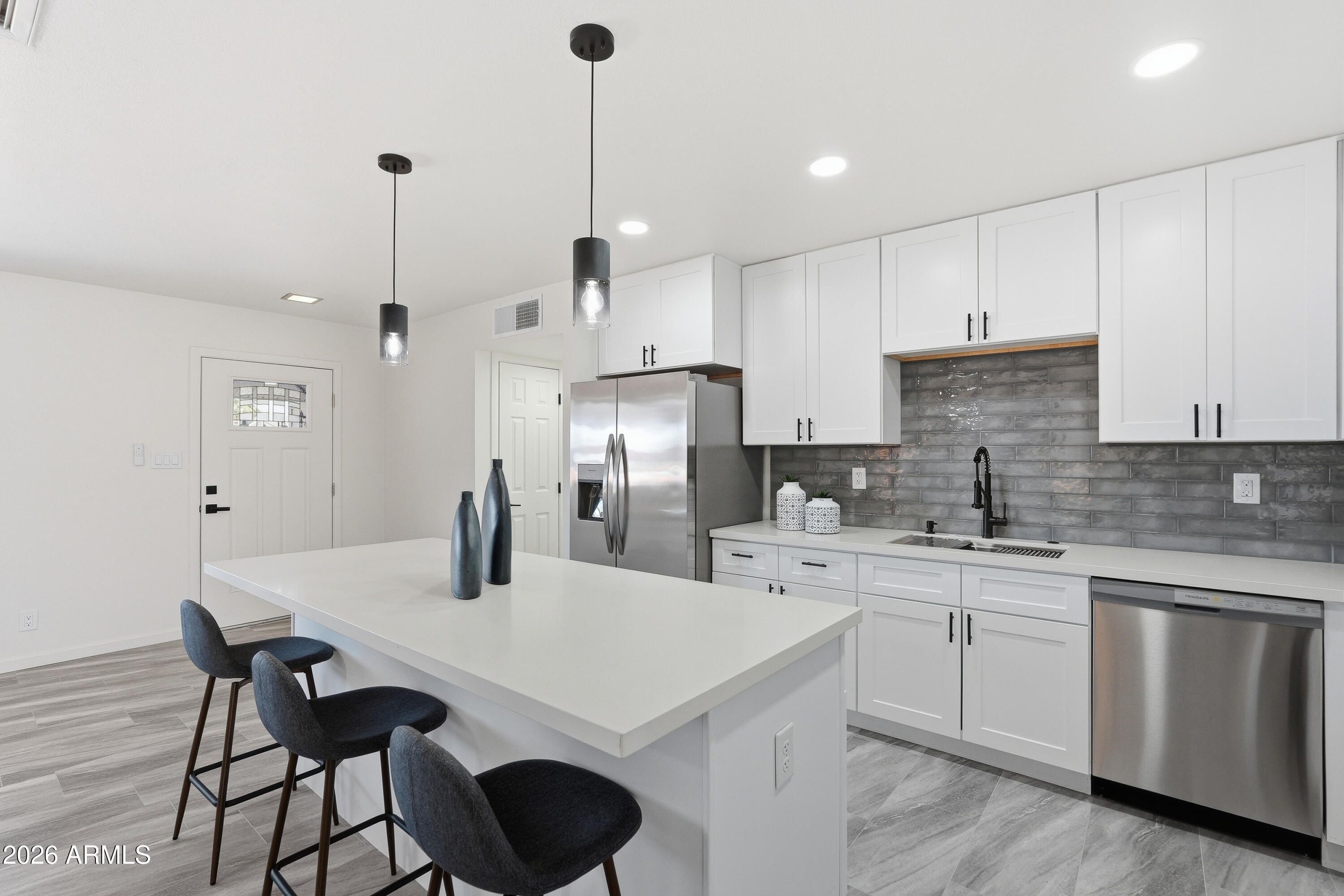 Step into luxury with this 3-bed, 2-bath ranch transformed by a $135k full remodel. The heart of the home is a stunning kitchen featuring a 7-foot custom island, white shaker soft-close cabinets, quartz countertops, and a designer backsplash. Relax in the finished Arizona Room by the custom stacked stone gas fireplace. Enjoy ultimate peace of mind with a NEW 2026 roof, NEW HVAC, and NEW double-pane windows. Save big with the paid-for solar system. The master suite offers a rare zero-threshold shower. Includes a private fenced yard, bonus hobby room, and luxury vinyl flooring throughout. This smoke-free, pet-free gem is better than new!