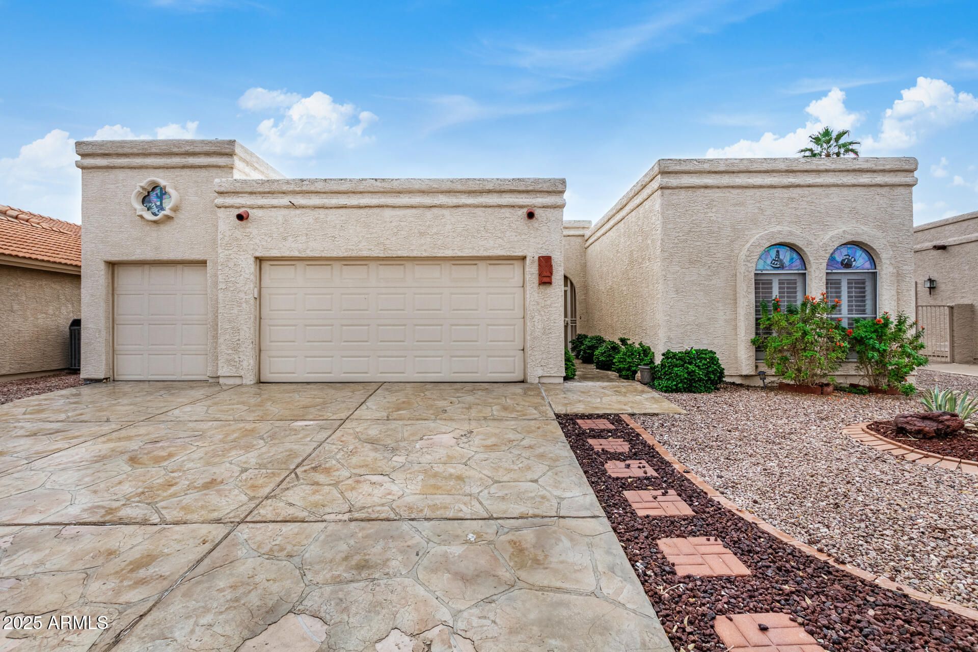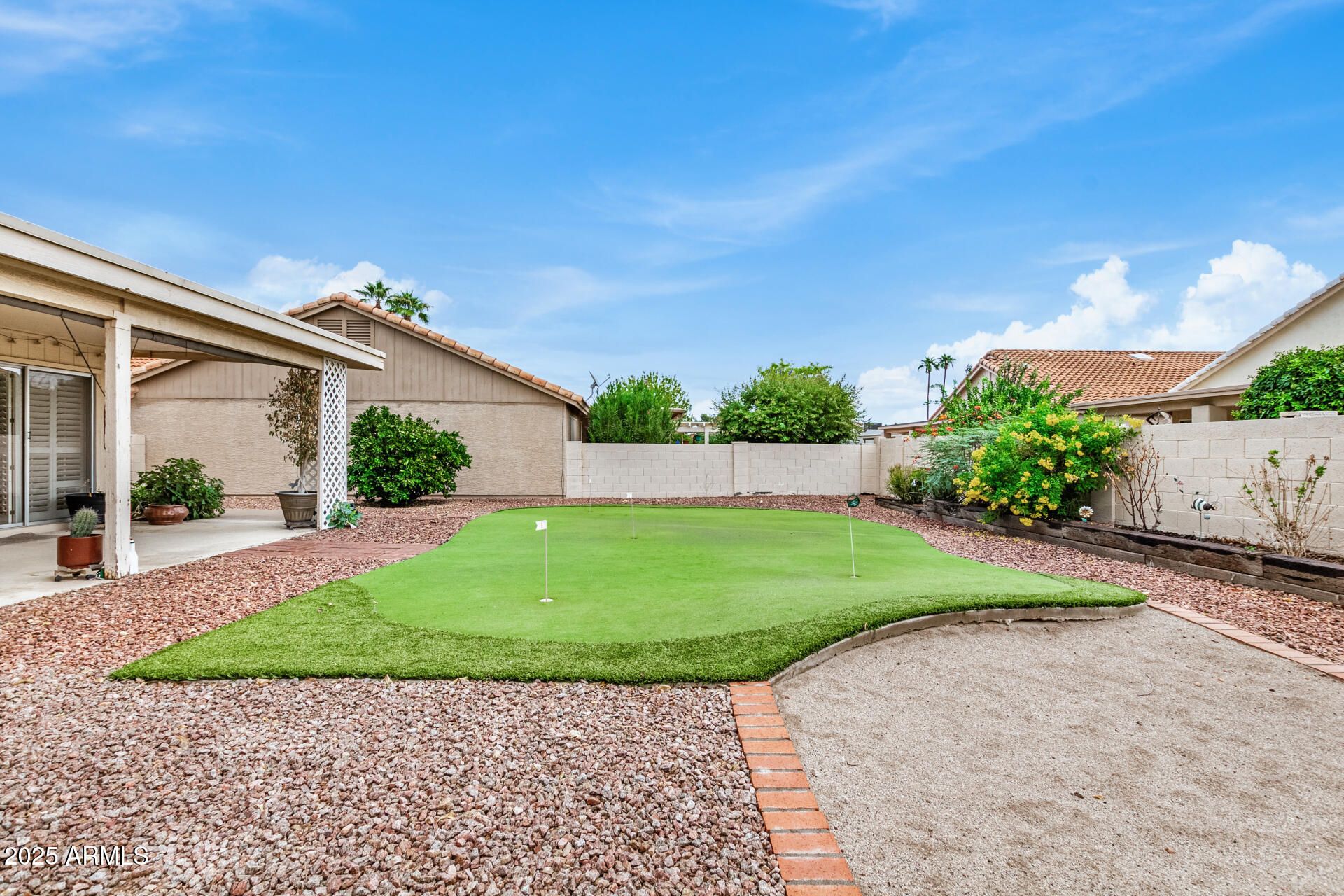 Charming home in the sought-after Cottonwood community! You'll love the 2-car garage + golf cart garage w/built-in cabinets! Enter to see a welcoming living room w/cozy fireplace, plantation shutters, & neutral paint. The kitchen has built-in appliances, wood cabinetry, solid-surface counters, fluorescent lighting, & a breakfast nook for enjoying your morning coffee. The main bedroom offers backyard access, walk-in closet, & ensuite featuring a dual sink vanity w/makeup area & a grab bar in the shower. Don't miss the laundry closet! Easy-care backyard boasts covered patio, putting green, & colorful desert plantings. Enjoy resort-style living with the community amenities such as a lake, walking paths, greenbelts, tennis courts, clubhouse, & more. Start living the Cottonwood lifestyle!