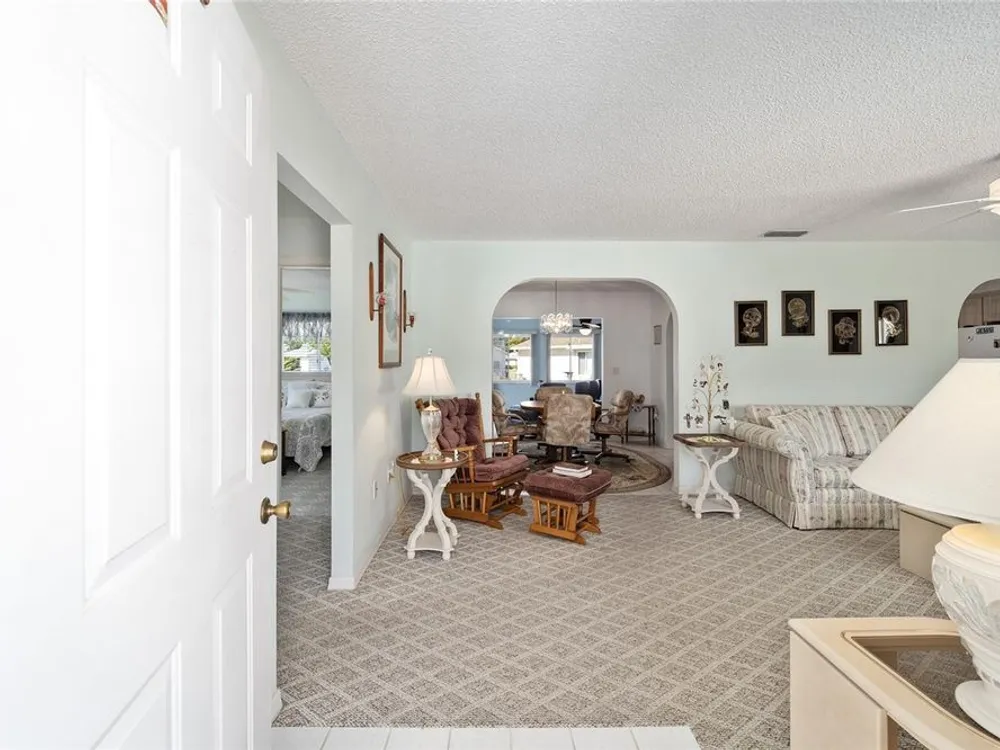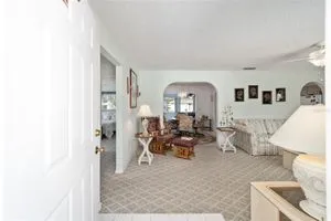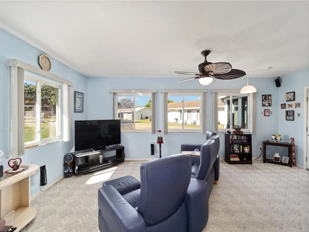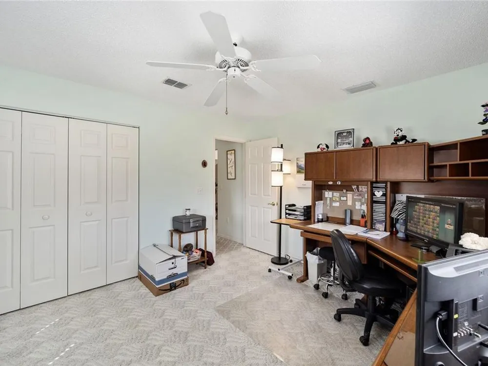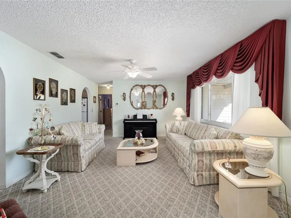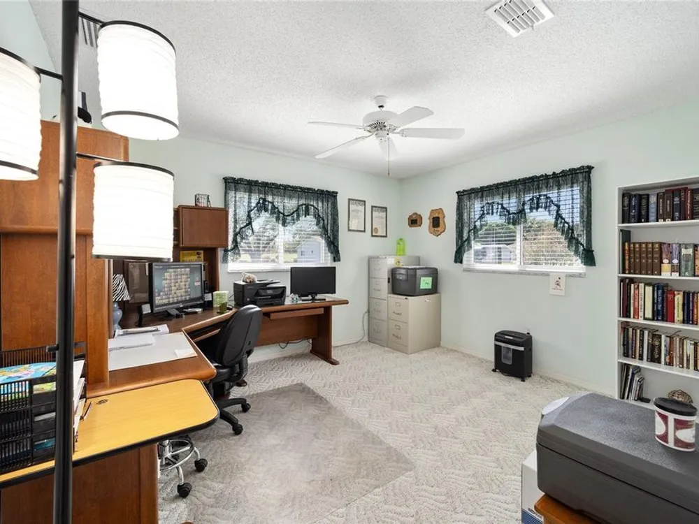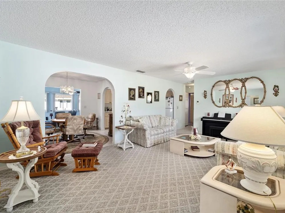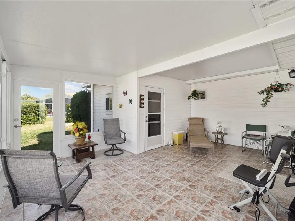 Charming and cozy home located in Spruce Creek South, a 55+ gated golf course community just north of The Villages! This inviting split-bedroom floor plan features a spacious den, perfect for an office or additional living space, plus a large enclosed Florida room to enjoy year-round. A bonus golf cart garage provides ample storage and could easily be converted into a workshop for your hobbies. Light and bright throughout, this home boasts a generous master suite with a large walk-in closet for added convenience. Ideal for those seeking comfort and a relaxed lifestyle in a vibrant, active community! Reverse Osmosis water treatment system, 2023 ROOF, 2022 HOT WATER HEATER, 2020 ELECTRIC PANEL, 2016 HVAC, 2025 Side door for garage has been replaced, as well as the control panel for irrigation.