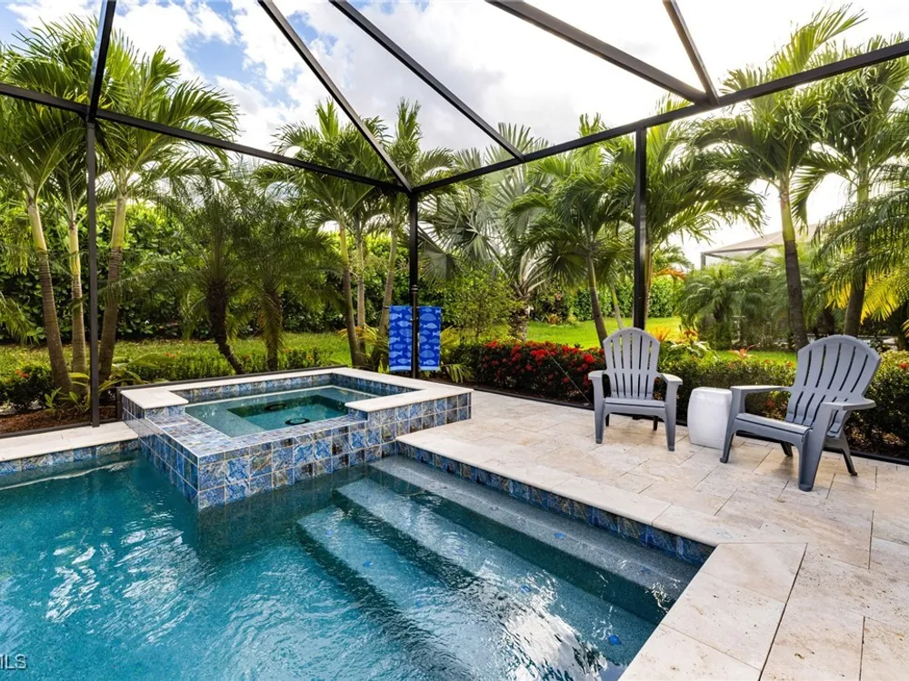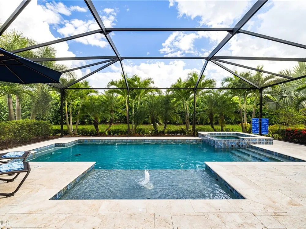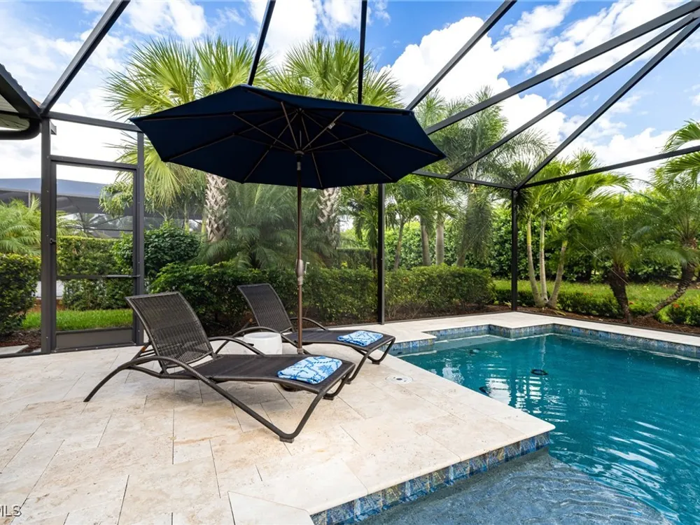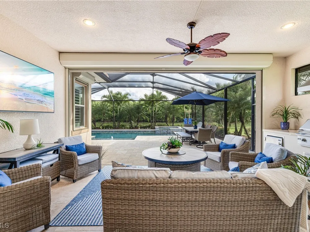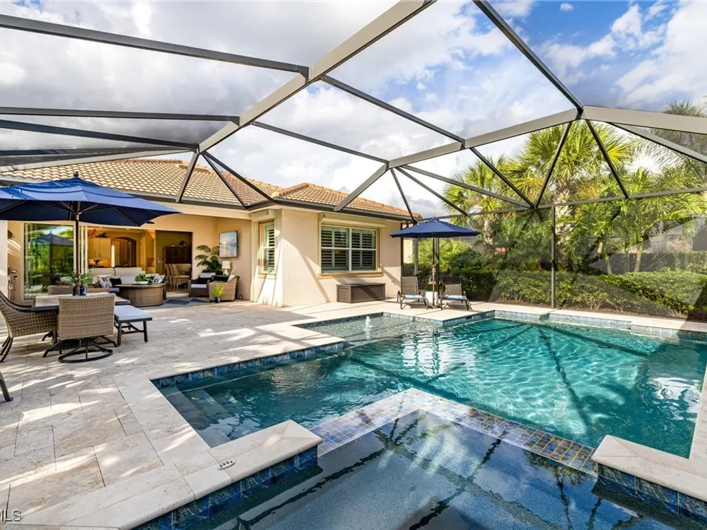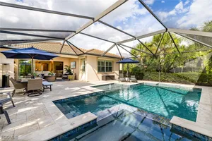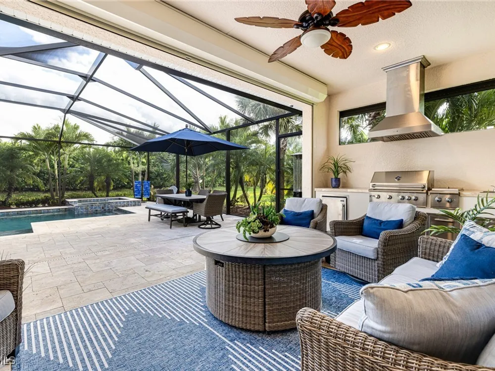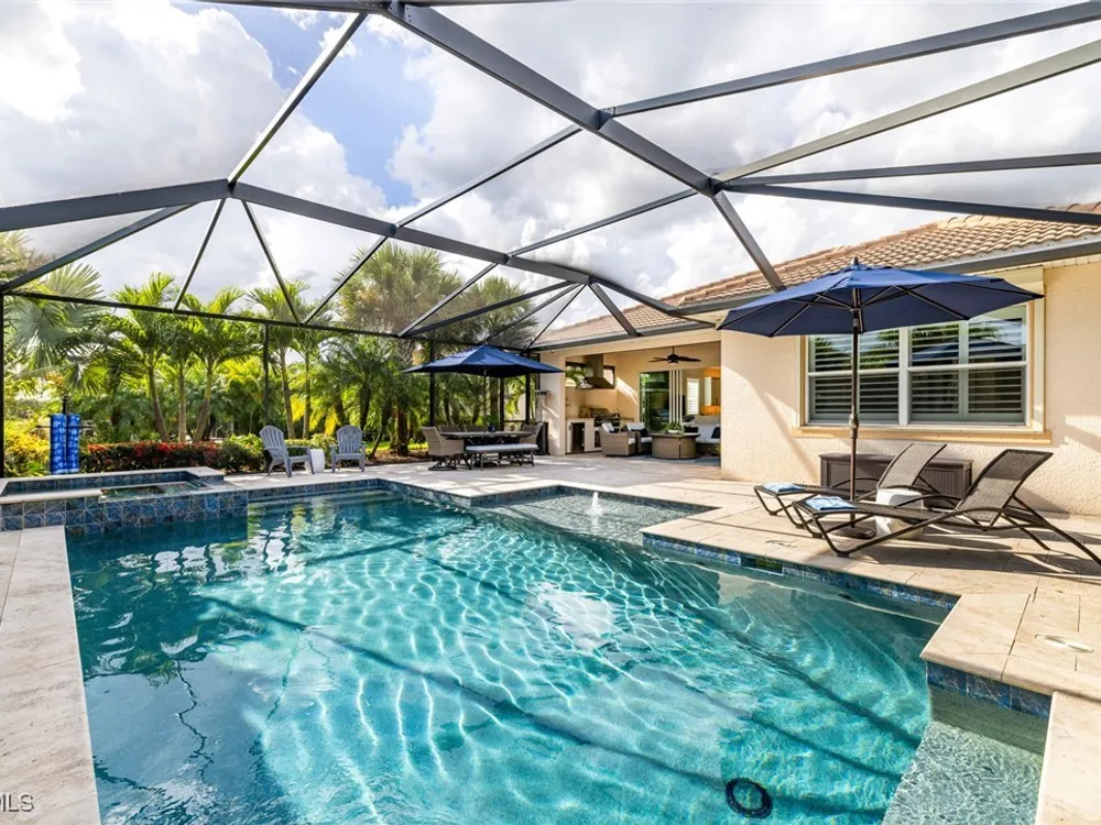 This stunning property is a must-see! The popular San Remo Floor plan boasts over $225,000 in upgrades, making it a truly luxurious home. The highlight of the property is the new saltwater pool with a Travertine deck, creating a private oasis surrounded by palm trees and lush foliage. The lanai features a summer kitchen for outdoor entertaining. Inside, the cabinets have been redone with elegant hardware, and all appliances are high-end Kitchen Aid models installed in 2021. The laundry room has also been updated with new cabinets, sink, and faucet. Additional upgrades include hurricane shutters on all windows, high-impact glass on the front window and door, crown molding, outdoor landscape and lighting, plantation shutters, fans and lights, reverse osmosis, security system, smart features, storage racks and epoxy floors in the garage, and more. Not only will you love the home itself, but you'll also enjoy the vibrant community and lifestyle in Pelican Preserve. This award-winning 55+ community offers amenities for every interest, including tennis, pickleball, softball, live music, fitness, spa, cards, books, walking trails, dog parks, and more. Optional golf memberships are also available. Sales in the community were up 30% in the 3rd quarter! Don't miss out on the chance to make this exceptional home your own and experience the unparalleled lifestyle Pelican Preserve has to offer.