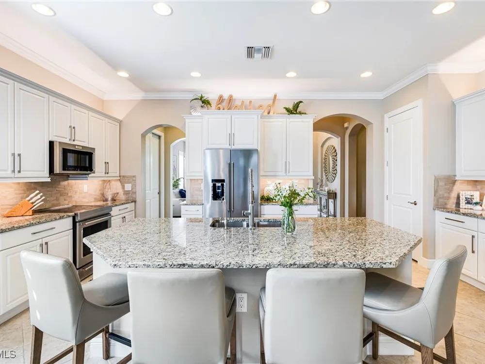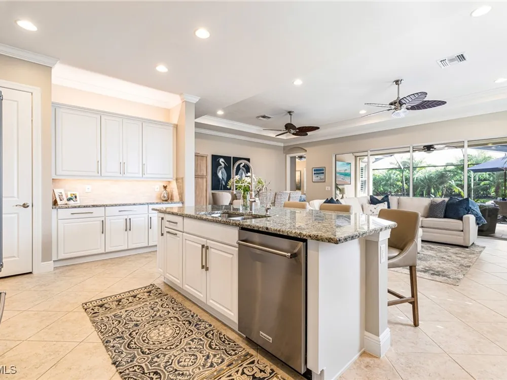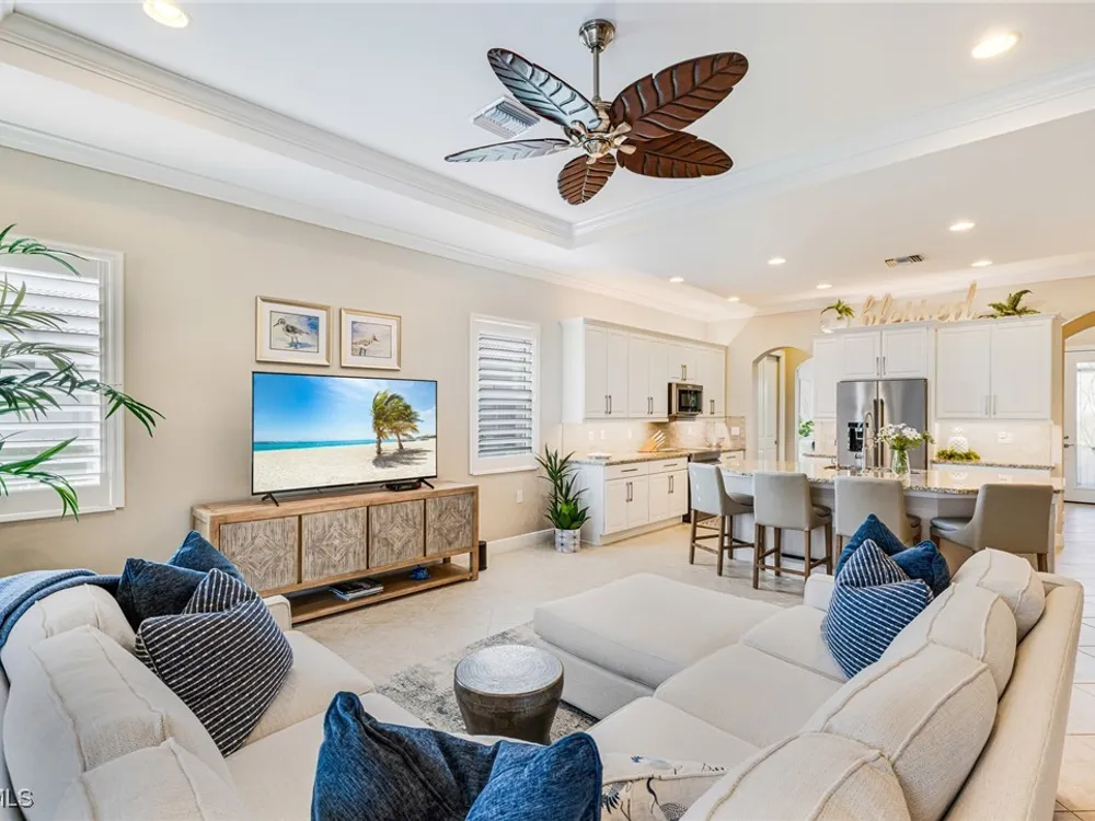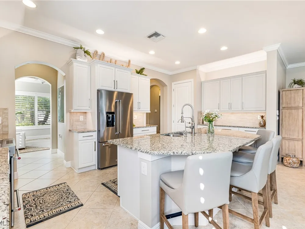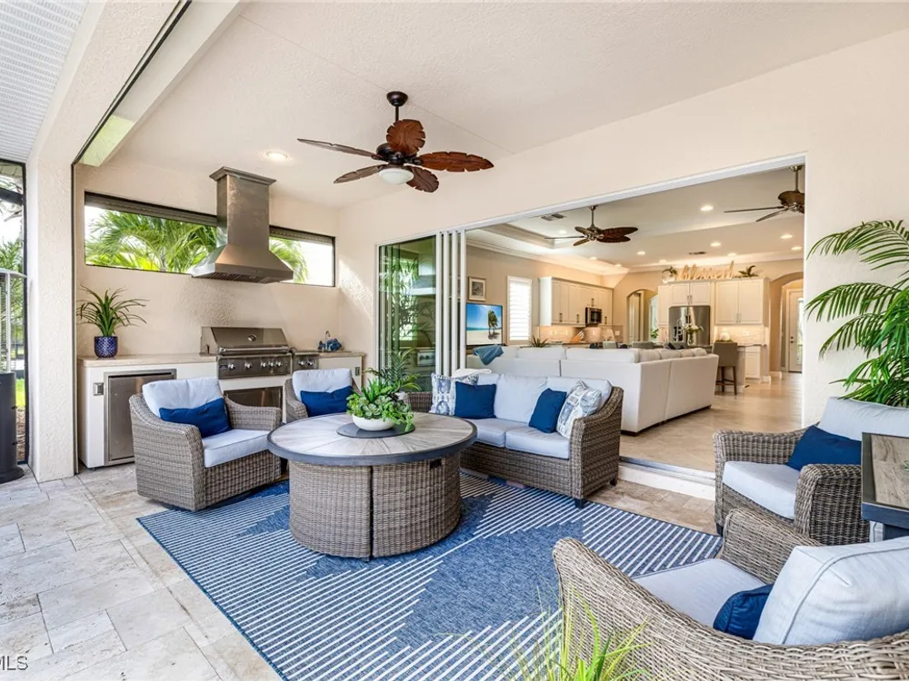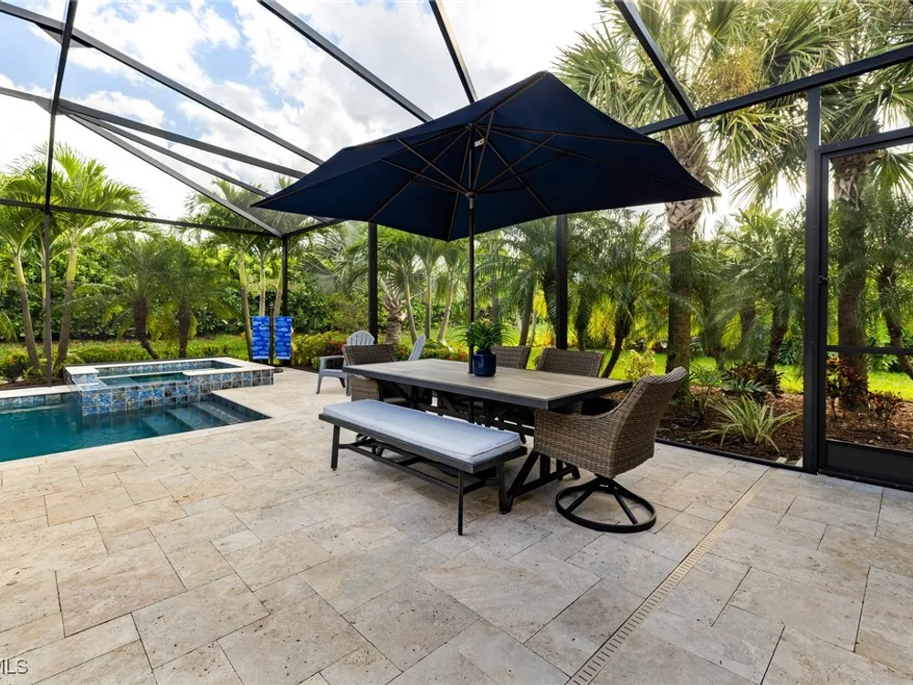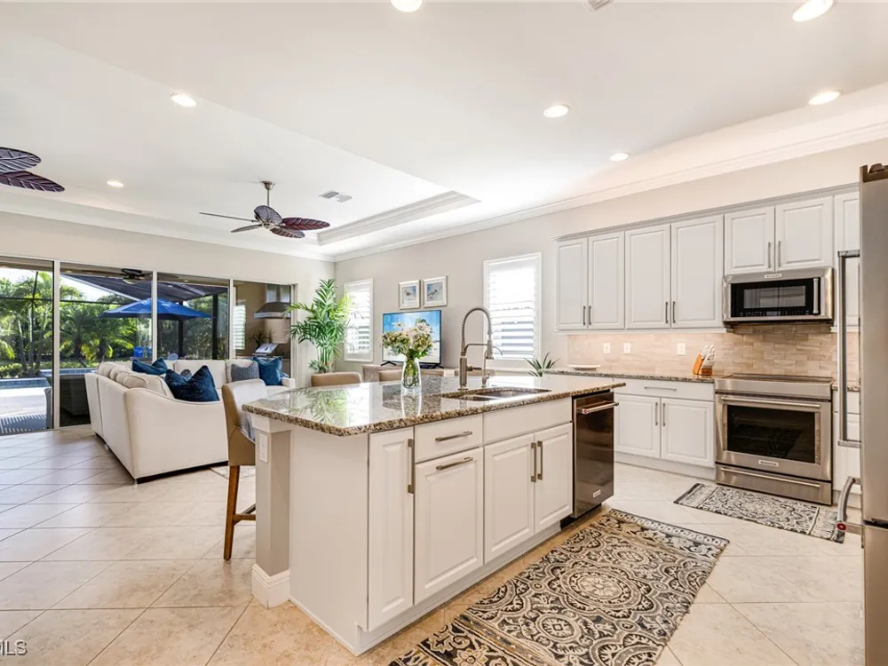 This stunning property is a must-see! The popular San Remo Floor plan boasts over $225,000 in upgrades, making it a truly luxurious home. The highlight of the property is the new saltwater pool with a Travertine deck, creating a private oasis surrounded by palm trees and lush foliage. The lanai features a summer kitchen for outdoor entertaining. Inside, the cabinets have been redone with elegant hardware, and all appliances are high-end Kitchen Aid models installed in 2021. The laundry room has also been updated with new cabinets, sink, and faucet. Additional upgrades include hurricane shutters on all windows, high-impact glass on the front window and door, crown molding, outdoor landscape and lighting, plantation shutters, fans and lights, reverse osmosis, security system, smart features, storage racks and epoxy floors in the garage, and more. Not only will you love the home itself, but you'll also enjoy the vibrant community and lifestyle in Pelican Preserve. This award-winning 55+ community offers amenities for every interest, including tennis, pickleball, softball, live music, fitness, spa, cards, books, walking trails, dog parks, and more. Optional golf memberships are also available. Sales in the community were up 30% in the 3rd quarter! Don't miss out on the chance to make this exceptional home your own and experience the unparalleled lifestyle Pelican Preserve has to offer.