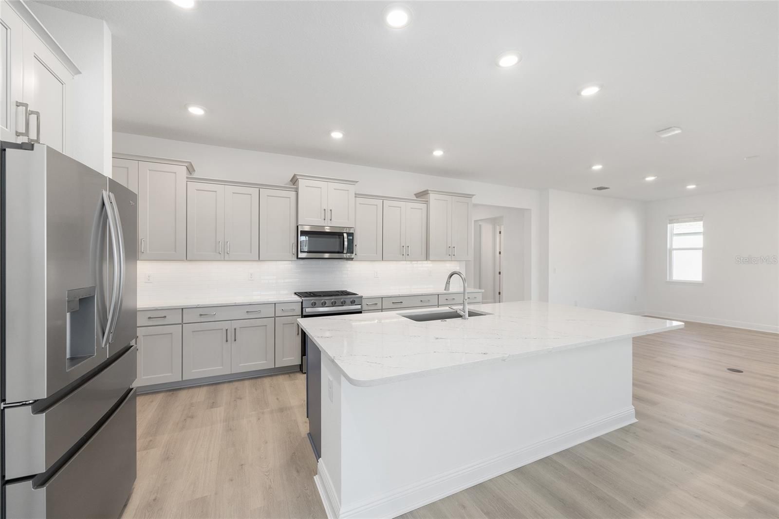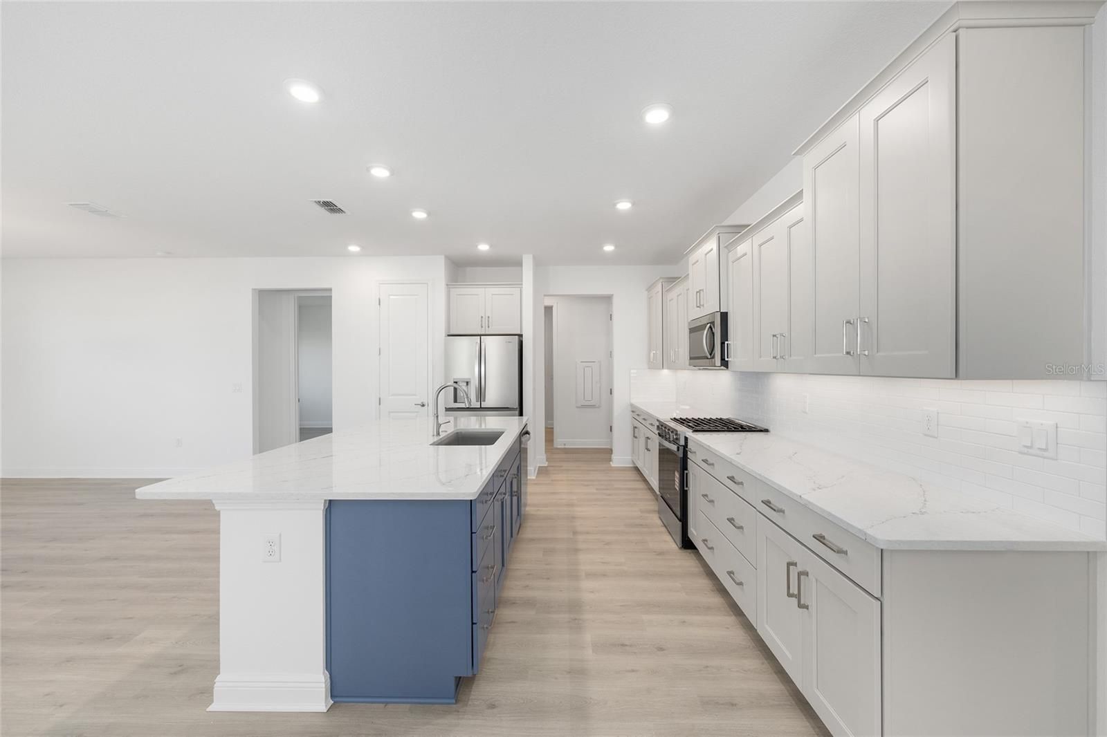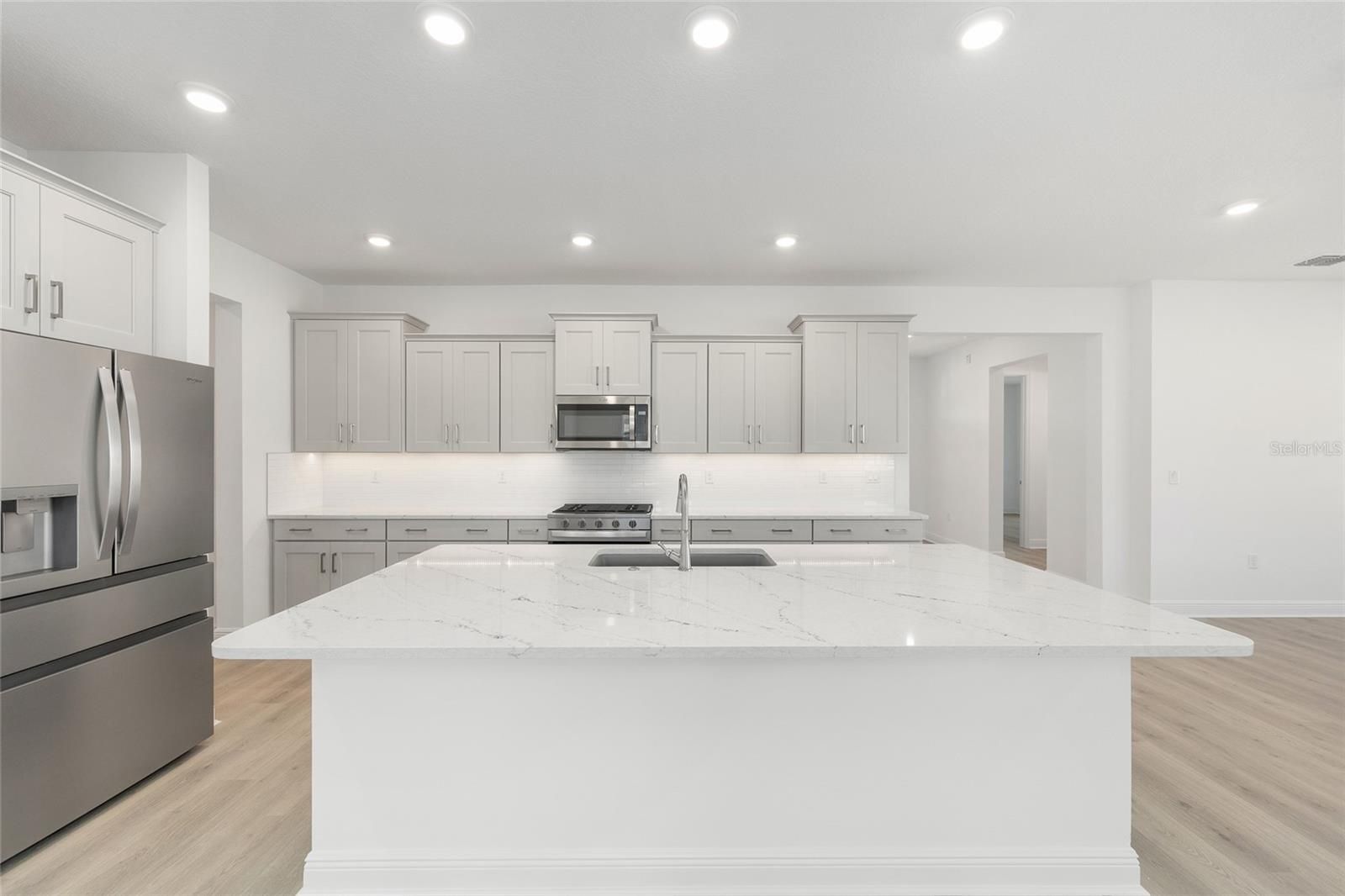 Experience refined Florida living in the beautifully designed Beatrix, a thoughtfully crafted new construction home that blends elegance, comfort, and functionality. Offering two bedrooms, two baths, and a two-car garage with dedicated golf cart space, this residence delivers a sophisticated yet inviting lifestyle. The open living room is enhanced by expansive Luxury Vinyl, recessed lighting, and a seamless connection to the home’s stunning designer kitchen. At the center of the space, an oversized quartz island anchors the kitchen, complemented by sleek cabinetry, a classic subway tile backsplash, and stainless-steel appliances—perfectly suited for both everyday living and effortless entertaining. A versatile flex room provides an ideal setting for a home office, private den, or creative retreat, while the dedicated laundry suite adds convenience with ample storage and thoughtful design. The primary suite offers a serene escape, featuring generous proportions and a spa-inspired bath with dual vanities and refined finishes. A secondary bedroom and full bath ensure comfort and privacy for guests. Outdoor living is elevated with a covered and screened lanai, along with a welcoming covered front porch—ideal for enjoying Florida’s year-round sunshine. With 2,142 square feet of climate-controlled living space and a total of 3,214 square feet under roof, the Beatrix combines architectural elegance with modern craftsmanship. Located in the desirable Longleaf Ridge neighborhood of On Top of the World, this exceptional home offers timeless style within a vibrant, amenity-rich community.