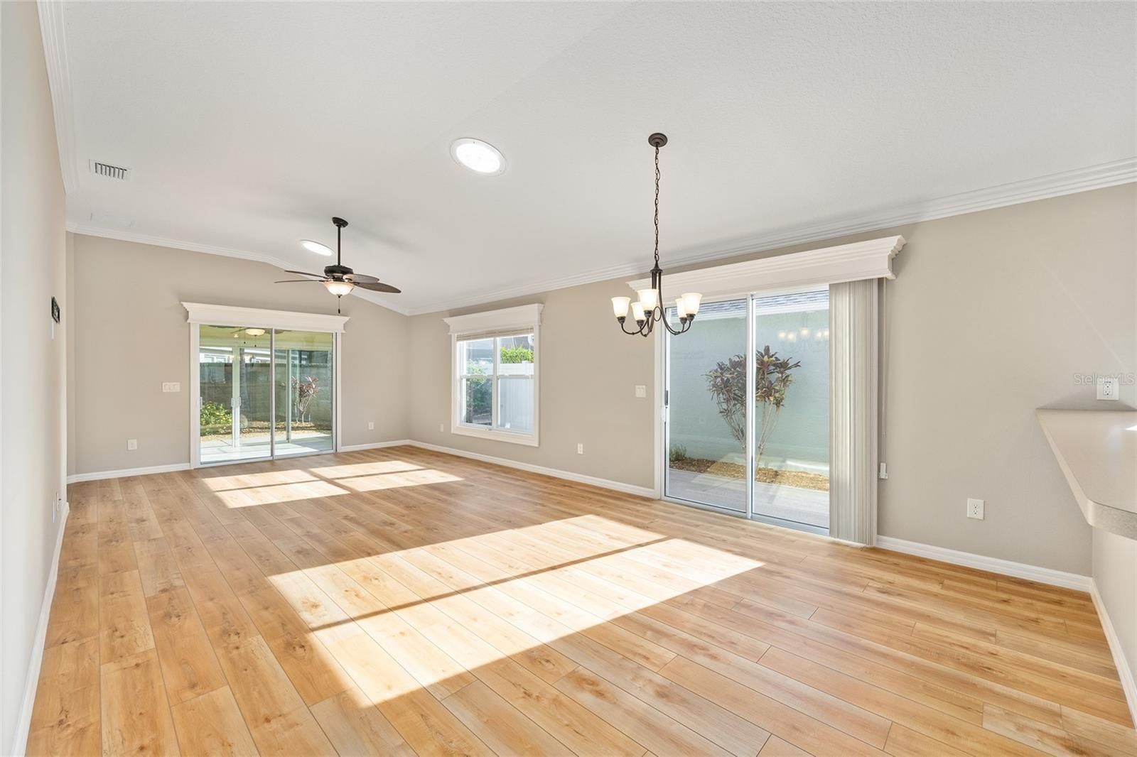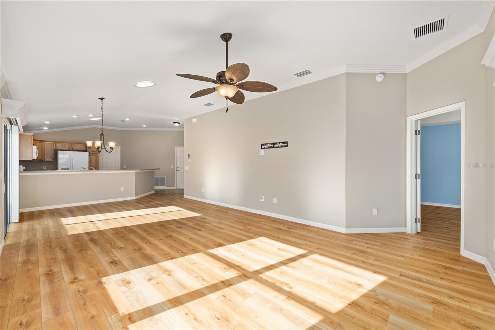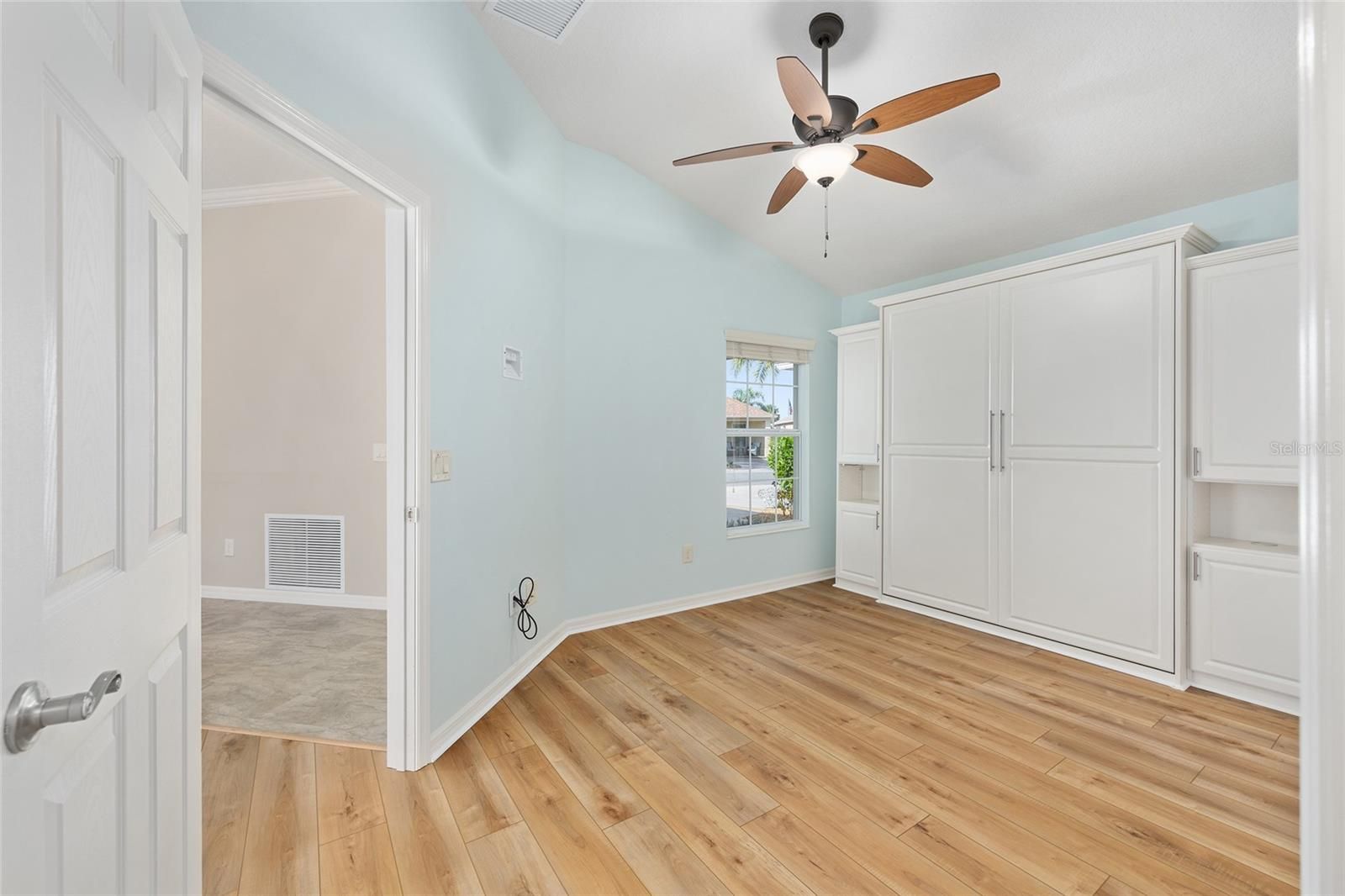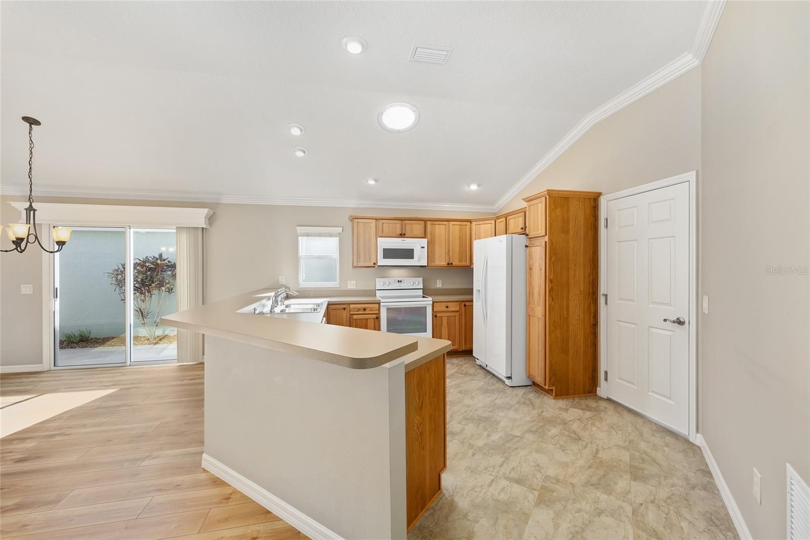 One or more photo(s) has been virtually staged. Village of Pine Ridge – Reagan Villas!! Meticulously Maintained Cambridge Courtyard Villa LOADED WITH UPGRADES in a Prime Location in The Villages, FL! -- Built in 2015, this Concrete Block and Stucco Villa features 1,270 sq ft of living space with 2 bedrooms, 2 baths, High and Vaulted Ceilings, and NO CARPET. -- You'll find COREtec 100% Waterproof Luxury Vinyl Plank Flooring in the Main Living Areas, paired with CROWN MOLDING, CUSTOM WOOD CORNICES, and THREE SOLAR TUBES that brighten the space with Natural Light. The Driveway, Walkway, and Front Porch are CUSTOM PAINTED, and the Garage includes a HIDEAWAY SCREEN, Insulated Garage Door, Radiant Barrier Attic Insulation, Attic fan, Built-in Workspace, and Rock Mulch in the Mature Landscaped Beds. -- The Kitchen boasts Recessed Panel Hickory Cabinets with Pot Drawers and Pull-outs, a Breakfast Bar Overhang, and a Reverse Osmosis System. The OPEN LAYOUT offers Spacious Living and Dining areas, with TV Mounts and In-wall Wiring Ready for your Setup. The Guest Suite features a BUILT-IN QUEEN MURPHY BED, Closet, and an EN-SUITE BATHROOM with a Tub/Shower combo, while the OWNER'S SUITE showcases a TRAY CEILING, EN-SUITE BATH with Pocket Door Entry, Walk-in Closet, Dual Sinks, a Tiled Step-in Shower with Glass Door and Bench Seat, and a Linen Closet. -- Relax in the ENCLOSED FLORIDA ROOM with ROLL-DOWN SHADES, Recessed Lighting, Ceiling Fan, and 12-foot Glass Slider Doors (with a Six-foot Opening) leading to the Rear Courtyard. -- Outdoors, you’ll enjoy CUSTOM-PAINTED Rear and Side Patios surrounded by Professional Landscaping. -- The Grage is outfitted with a TILED VINYL FLOOR, HVAC Closet, Washer and Dryer (2021), BUILT-IN WORKSTATION, Extra Wall-mounted Cabinets and Wire Shelving, Utility sink, Pull-down Attic Stairs, and HIDEAWAY SCREEN. -- Ideally located just 0.5 miles from the Escambia & Okeechobee Executive Courses and Moyer Recreation Center & Family Pool, 0.8 miles from Pine Ridge Pool & Mail Station, 2.5 miles from Belle Glade Country Club, and only 1 mile from Colony Plaza Shopping Center and MORE —this move-in ready villa offers incredible convenience. You don’t even need a car. -- Please enjoy the attached VIDEO WALKTHROUGH and DRONE FOOTAGE and Schedule your Private Showing TODAY!