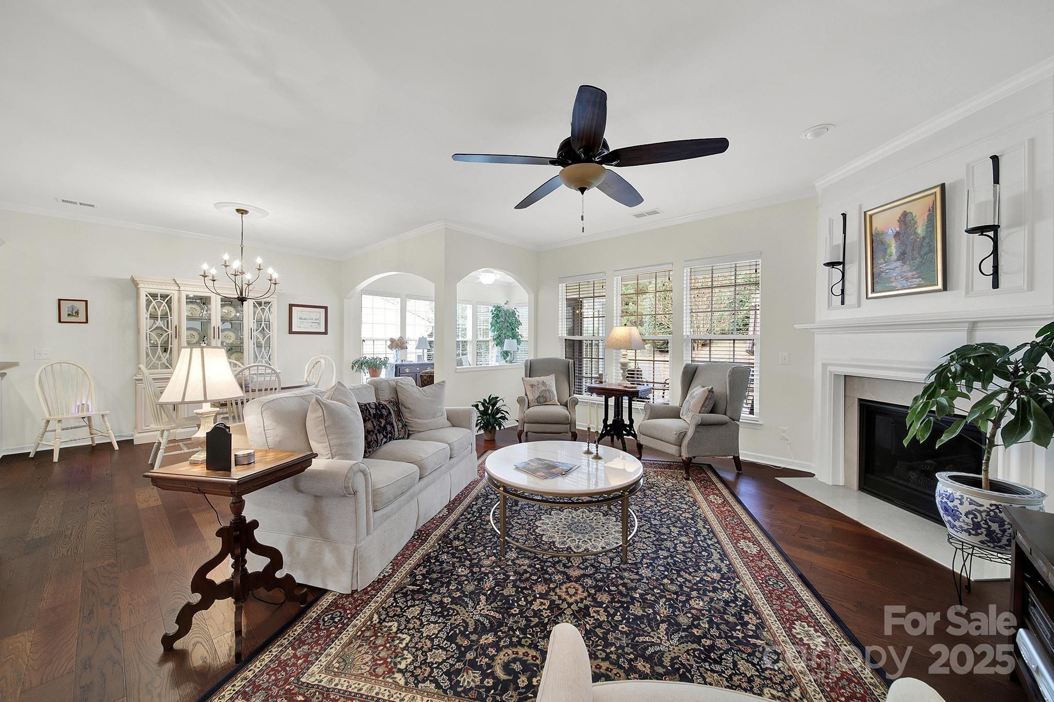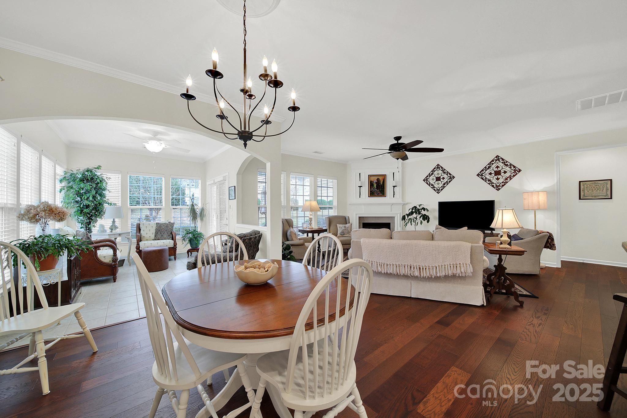 This beautiful updated Copper Ridge home is stylish living at its best in one of the area's most sought-after 55+ active adult communities. Beautiful new laminate wood flooring flows throughout the main living areas, creating a warm and welcoming feel from the moment you enter. This open concept home is highlighted by the stunning updated kitchen featuring white painted cabinets, marble tile backsplash, granite countertops, SS appliances and a breakfast bar that opens up to the living & dining areas, perfect for entertaining. A cozy gas log fireplace warms the living room while crown molding and custom light fixtures provide elegant accents throughout the home. A striking archway leads to the tiled sunroom, offering expansive views of the private backyard and abundant natural light. The primary suite is tucked at the rear of the home and features a tray ceiling and an ensuite bath complete with a garden tub, walk-in shower, dual-sink vanity and large walk-in closet. The guest bedroom sits at the front of the home and offers a full guest bath. French doors open to a versatile flex space, perfect for a home office or a dedicated hobby space. Relax outdoors on the covered paver patio with a ceiling fan, overlooking a custom water feature that adds a soothing ambiance to your outdoor living space. And great news - new HVAC 2023, Hot Water Heater 2023, wood flooring 2023, Roof 2024, custom light fixtures 2023, SS dishwasher & microwave 2024. Residents of Sun City Carolina Lakes enjoy resort-style amenities including a golf course, pools, gym, sport courts, canoe/kayak center backing to the Catawba river, walking trails, and so much more. Conveniently located to grocery, shopping, restaurants and more. This home offers the perfect blend of comfort, convenience, and community living!