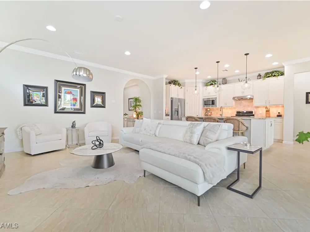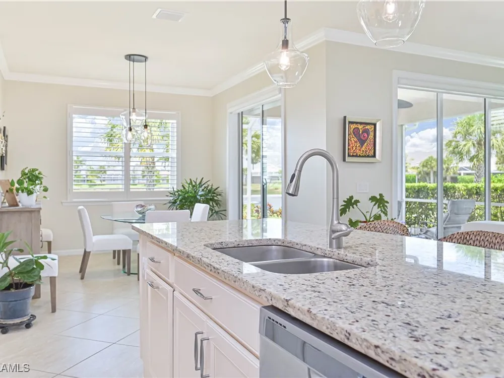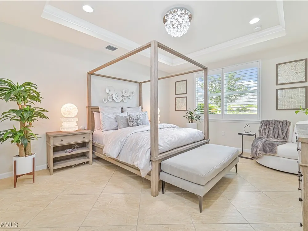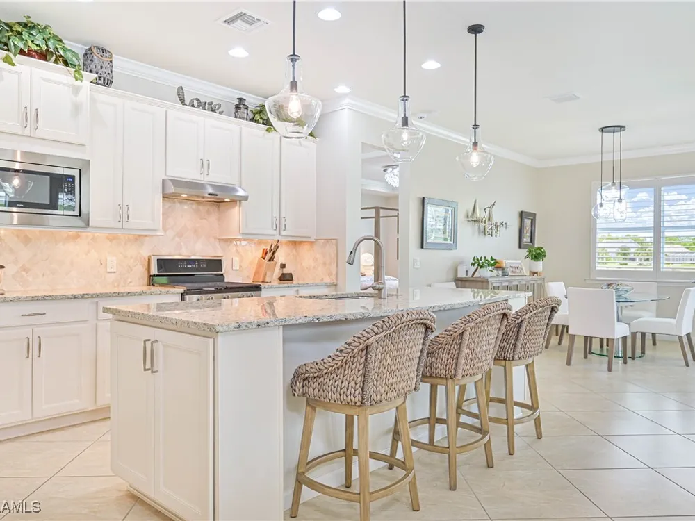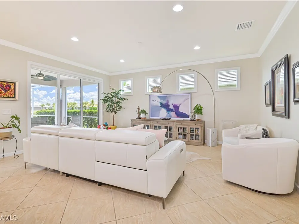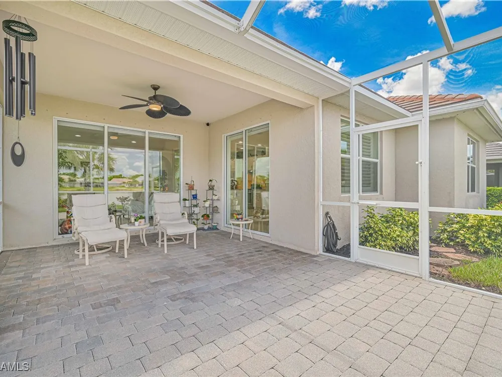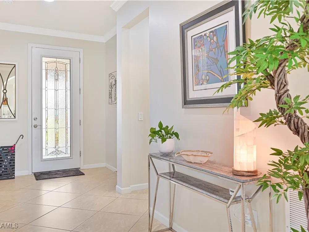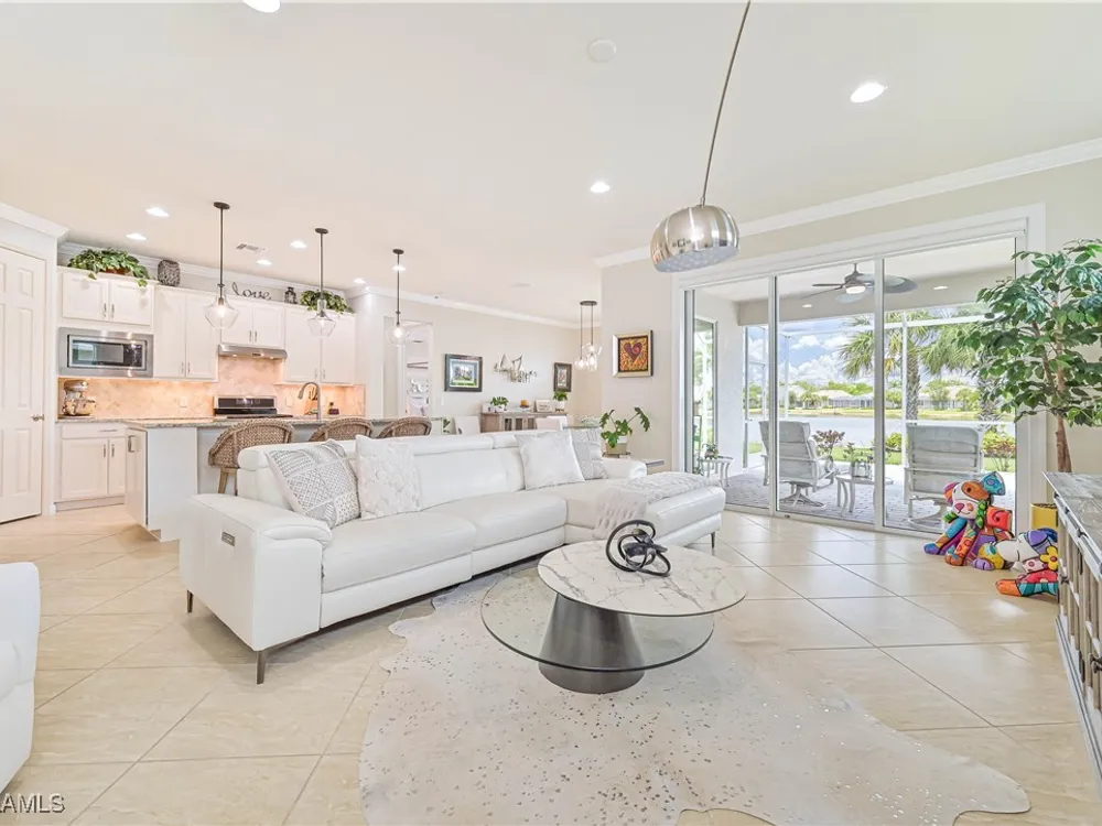 Welcome to the highly sought-after Tidewater community by Del Webb in Estero, Florida! This stunning home is a true model-like residence, offering elegant design and exceptional upgrades throughout. Featuring 3 bedrooms plus a versatile den, the home boasts a spacious and open layout with 21-inch diagonal tile flooring that flows seamlessly across the interior. Plantation shutters and crown molding add a touch of sophistication, while the primary suite impresses with custom built-in closets, dual sinks, and a large glass-enclosed shower — perfect for relaxing retreats. The chef’s kitchen is equipped with stainless steel appliances, a custom backsplash, an abundance of can lighting, a large work island, making it ideal for entertaining. Step outside to the extended paver lanai, perfect for outdoor living and overlooking the breathtaking lake views. The epoxy-painted garage floor adds durability and style. Additional features include extended lanai living space, numerous interior extras, and a prime location within the community. Don’t miss this exceptional opportunity to own a move-in-ready home in Tidewater — a vibrant, active community with plenty of amenities. Schedule your showing today!