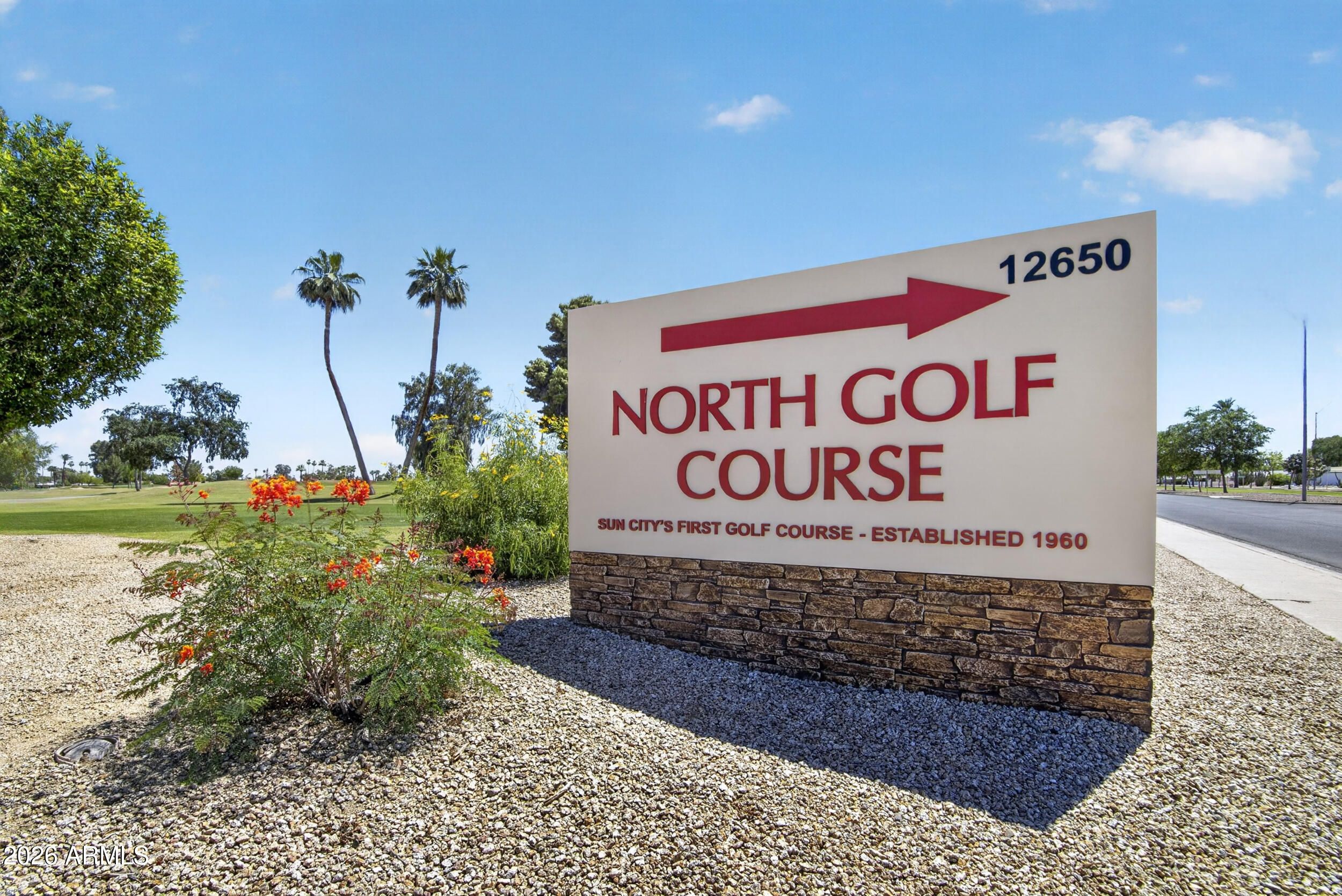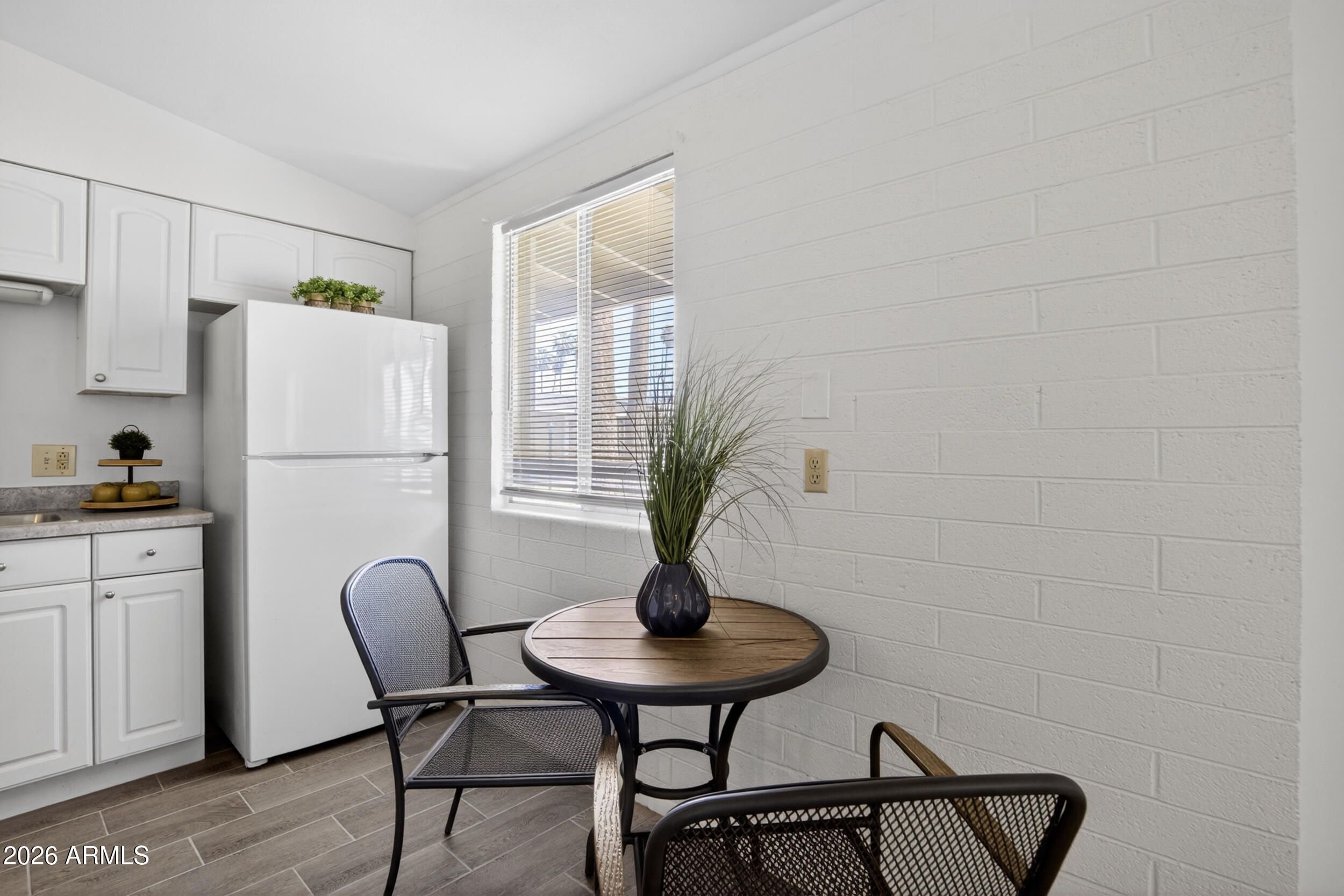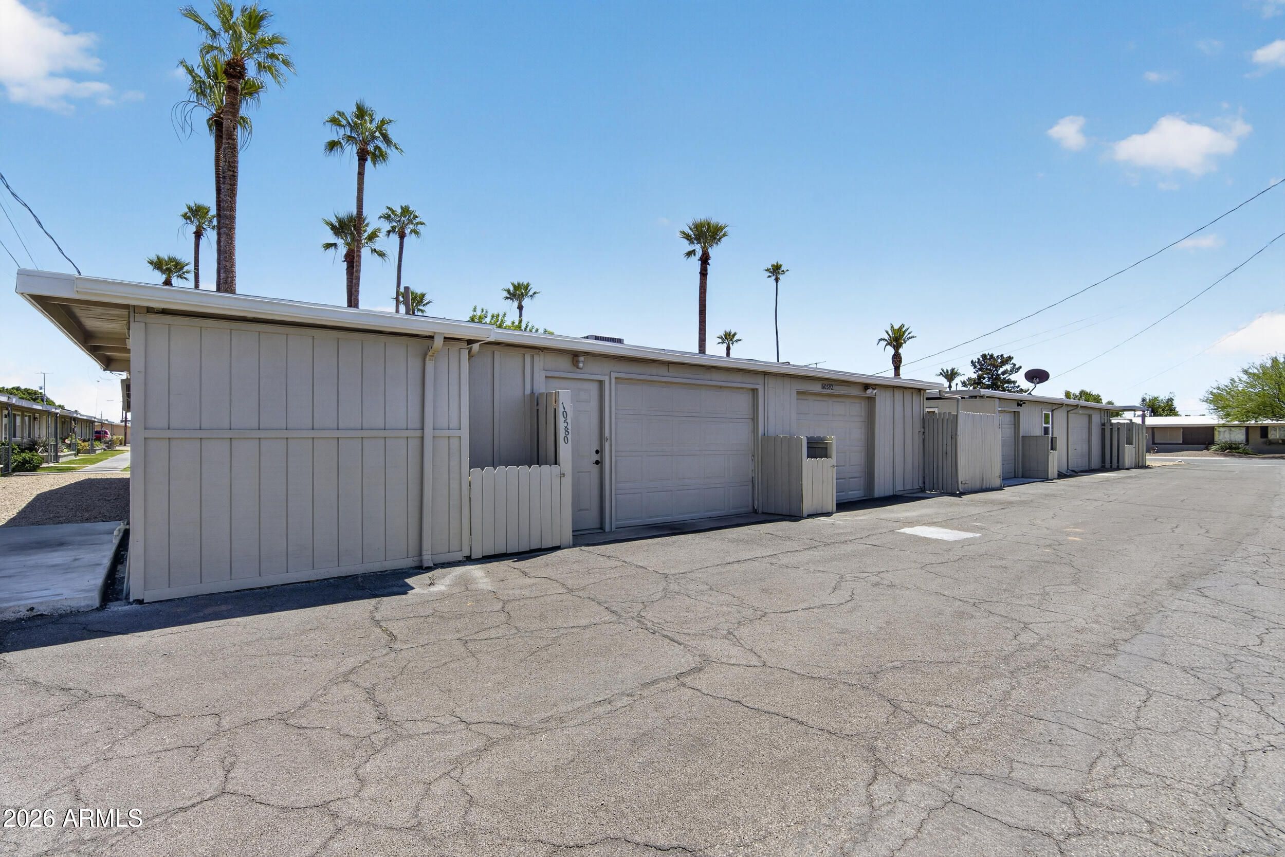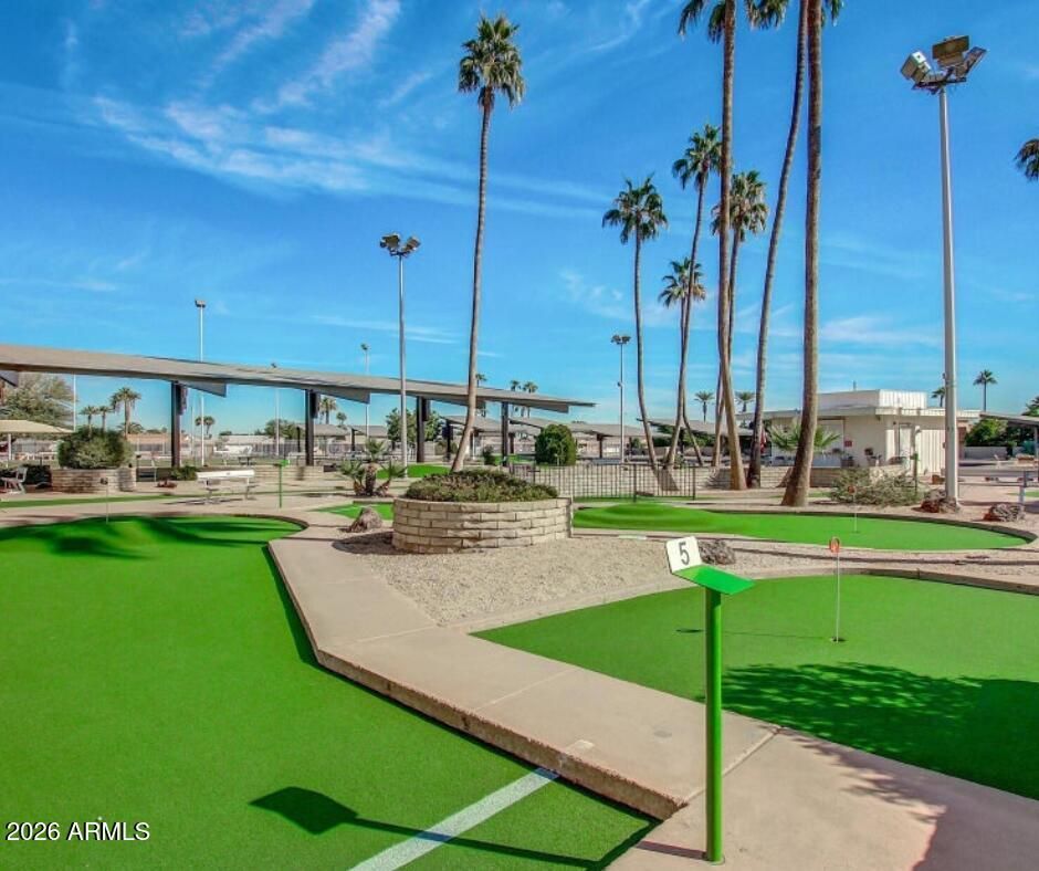 Beautiful1 Bedroom, 1 Bathroom Home with Oversized Garage. Eat-In Kitchen Features White Cabinets, White Appliances, and Cabinet Pullouts. Bathroom Showcases Custom Tile with Grab Bar for Improved Accessibility, Safety and Support. Home Features Vaulted Ceilings, Exposed Brick, Neutral Colors, Wood Plank Tile Flooring, and Freshly Painted Interior/Exterior. Extended 1 Car Plus Garage with Mini Split, Insulated Garage Door, and Storage. Enclosed Patio Double as Golf Cart Garage. Trane AC Installed 2021, Water Heater 2023, and Sewer 2023. Front Courtyard has Natural Grass, Seating, and Shaded Trees. Home is Conveniently Located Near Stores, Restaurants, Shopping, Recreation Centers, Parks, Golf, Lakes, Pickleball, Clubs, Pools, Spas, Hospitals, US 60, Loop 101, and Loop 303. Sun City offers an Extensive Array of Active Adult Amenities, Featuring Eight Recreation Centers, 8+ Golf Courses, and over 120 Chartered Clubs. Residents Enjoy Top-Tier Facilities including Swimming Pools, Bowling, Pickleball, Arts and Crafts Studios, and Fitness Centers. The Community is Designed for Engagement, Featuring Theaters, Lakes, and Social Clubs.