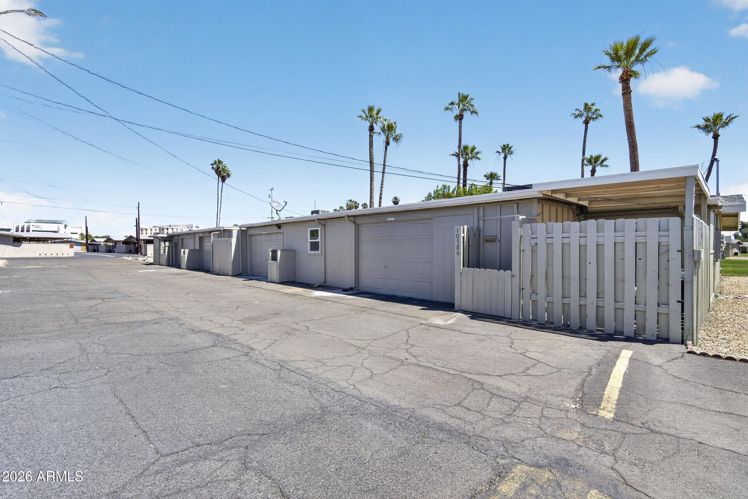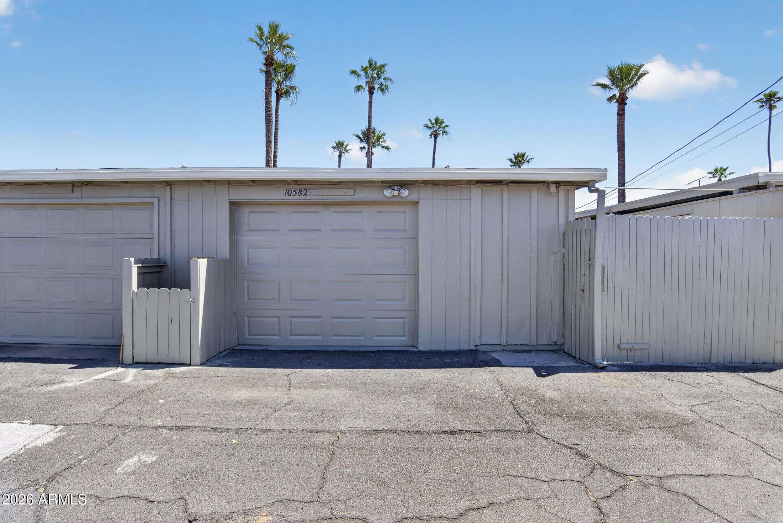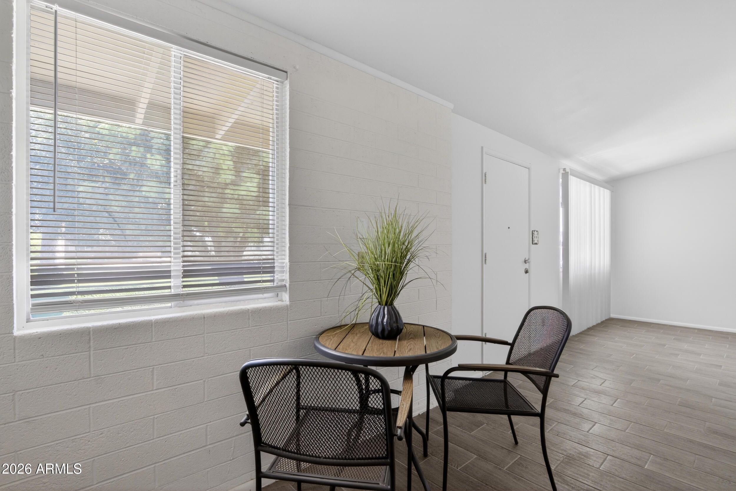 Beautiful1 Bedroom, 1 Bathroom Home with Oversized Garage. Eat-In Kitchen Features White Cabinets, White Appliances, and Cabinet Pullouts. Bathroom Showcases Custom Tile with Grab Bar for Improved Accessibility, Safety and Support. Home Features Vaulted Ceilings, Exposed Brick, Neutral Colors, Wood Plank Tile Flooring, and Freshly Painted Interior/Exterior. Extended 1 Car Plus Garage with Mini Split, Insulated Garage Door, and Storage. Enclosed Patio Double as Golf Cart Garage. Trane AC Installed 2021, Water Heater 2023, and Sewer 2023. Front Courtyard has Natural Grass, Seating, and Shaded Trees. Home is Conveniently Located Near Stores, Restaurants, Shopping, Recreation Centers, Parks, Golf, Lakes, Pickleball, Clubs, Pools, Spas, Hospitals, US 60, Loop 101, and Loop 303. Sun City offers an Extensive Array of Active Adult Amenities, Featuring Eight Recreation Centers, 8+ Golf Courses, and over 120 Chartered Clubs. Residents Enjoy Top-Tier Facilities including Swimming Pools, Bowling, Pickleball, Arts and Crafts Studios, and Fitness Centers. The Community is Designed for Engagement, Featuring Theaters, Lakes, and Social Clubs.