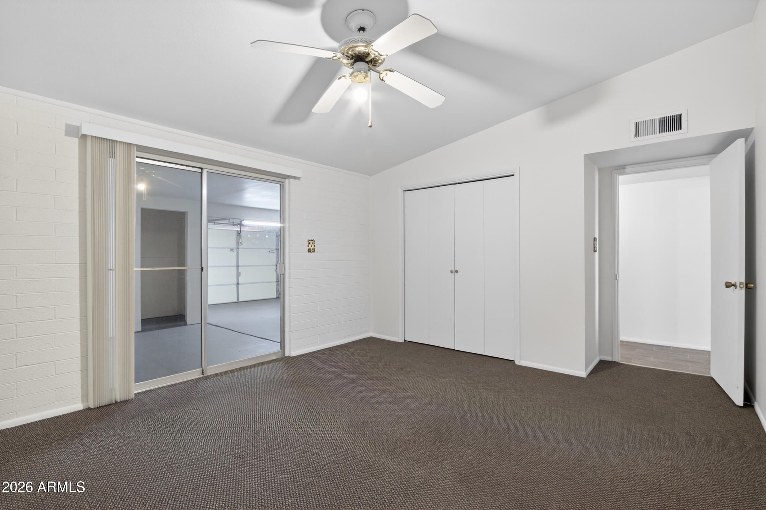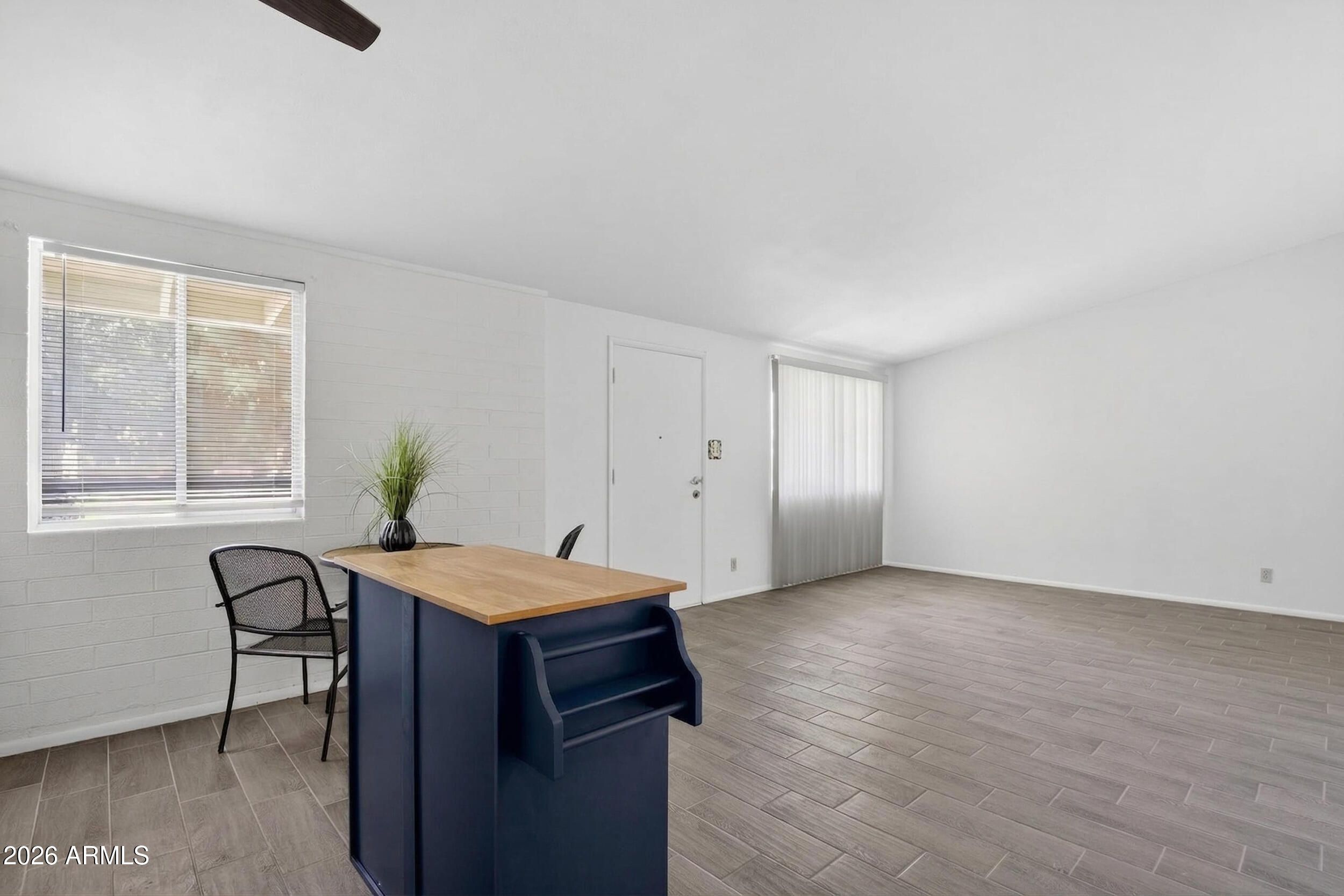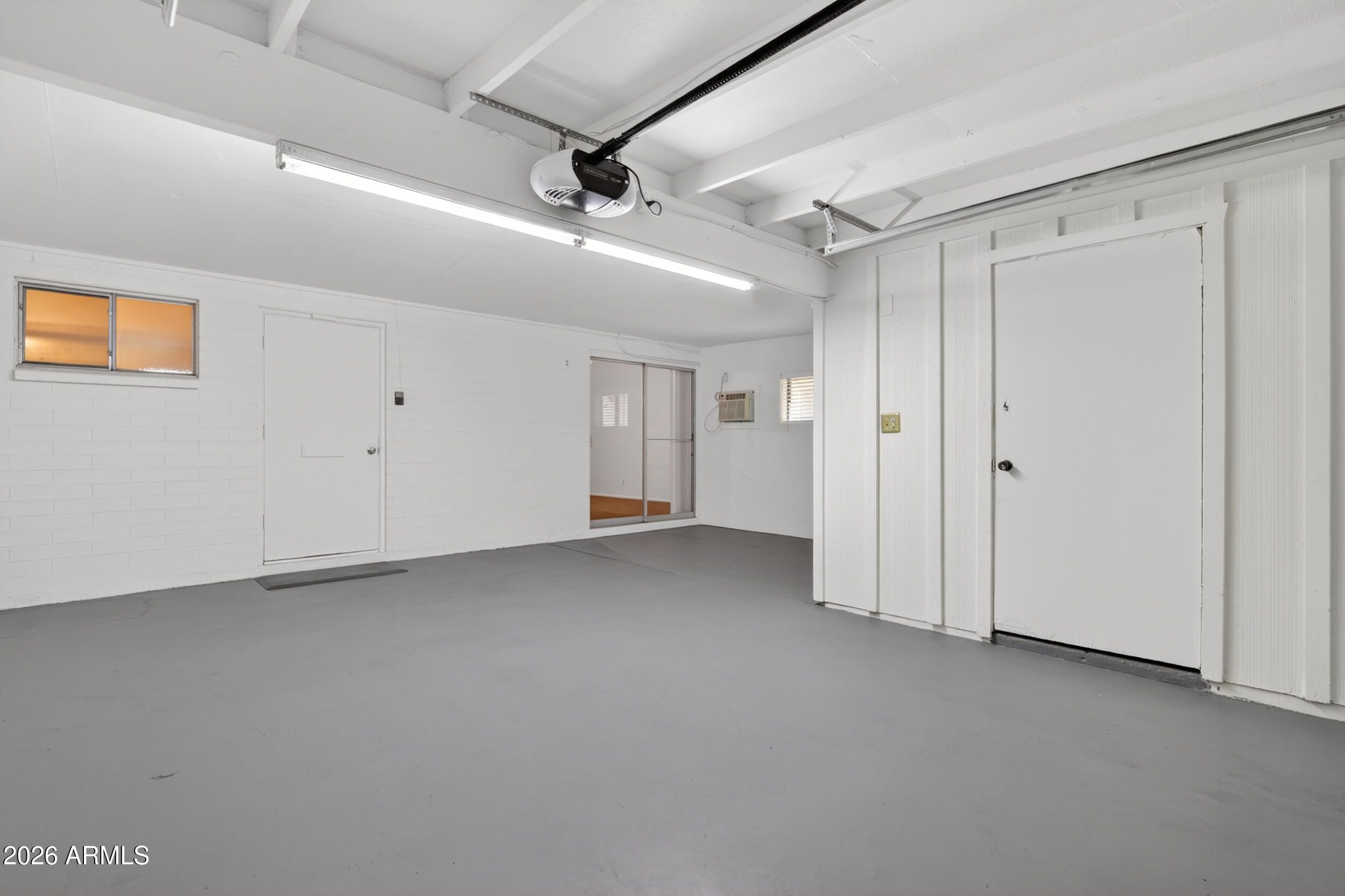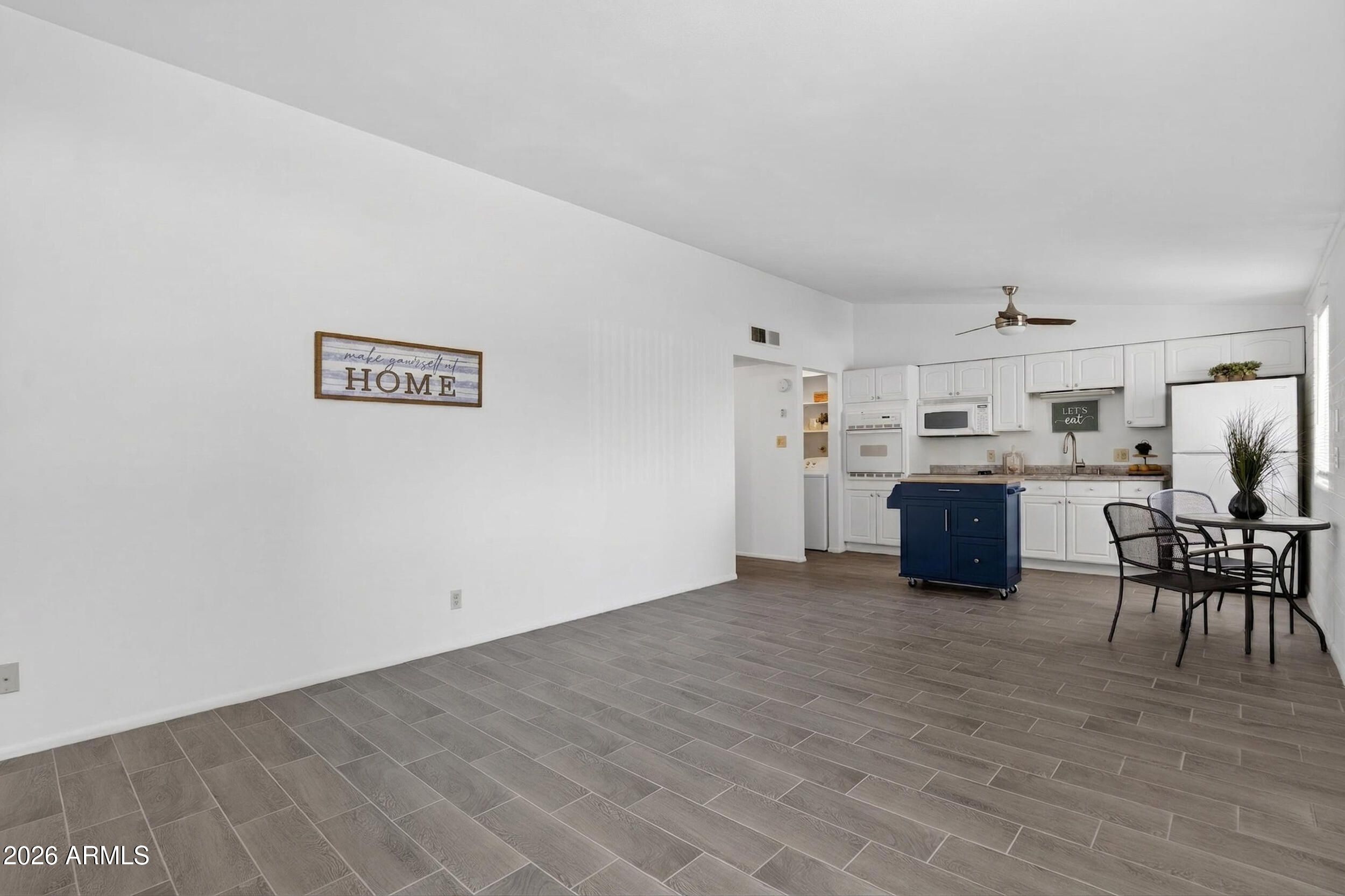 Beautiful1 Bedroom, 1 Bathroom Home with Oversized Garage. Eat-In Kitchen Features White Cabinets, White Appliances, and Cabinet Pullouts. Bathroom Showcases Custom Tile with Grab Bar for Improved Accessibility, Safety and Support. Home Features Vaulted Ceilings, Exposed Brick, Neutral Colors, Wood Plank Tile Flooring, and Freshly Painted Interior/Exterior. Extended 1 Car Plus Garage with Mini Split, Insulated Garage Door, and Storage. Enclosed Patio Double as Golf Cart Garage. Trane AC Installed 2021, Water Heater 2023, and Sewer 2023. Front Courtyard has Natural Grass, Seating, and Shaded Trees. Home is Conveniently Located Near Stores, Restaurants, Shopping, Recreation Centers, Parks, Golf, Lakes, Pickleball, Clubs, Pools, Spas, Hospitals, US 60, Loop 101, and Loop 303. Sun City offers an Extensive Array of Active Adult Amenities, Featuring Eight Recreation Centers, 8+ Golf Courses, and over 120 Chartered Clubs. Residents Enjoy Top-Tier Facilities including Swimming Pools, Bowling, Pickleball, Arts and Crafts Studios, and Fitness Centers. The Community is Designed for Engagement, Featuring Theaters, Lakes, and Social Clubs.