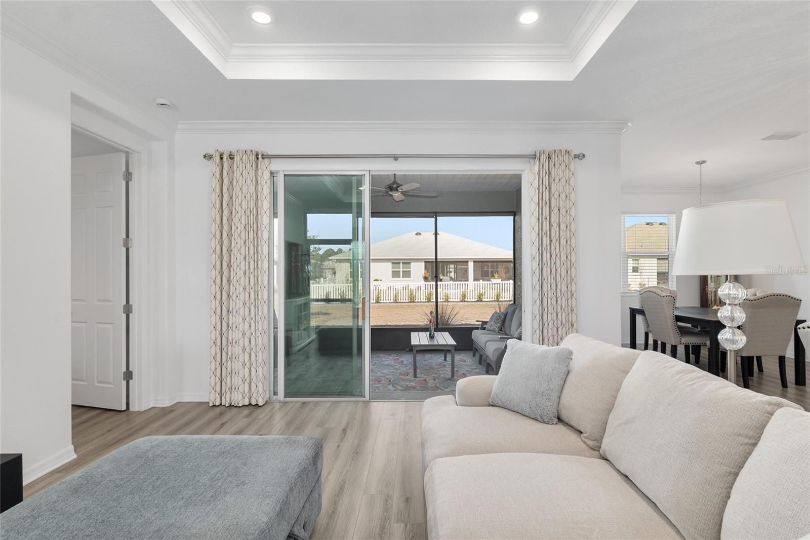 Welcome to your next chapter in On Top of the World in Ocala, where life feels lighter, easier, and truly rewarding. Built in 2023 and packed with over $25,000 in upgrades, this like new (2023) two bedroom, two bath home is ready for its new owners. From the moment you pull up, you notice the extra wide driveway and the clean, polished look of the garage with its durable polymer flooring. Inside, gray luxury plank flooring runs throughout the entire home, giving it a modern, cohesive feel. Natural light pours through the open floor plan, creating a warm and welcoming space you will love coming home to. The kitchen is both beautiful and functional, featuring modern appliances and stunning gray Cambria quartz countertops, speckled with diamond-like specks, provide plenty of space to cook, gather, and entertain. The primary suite feels like your own private retreat with an ensuite bathroom and generous closet space. The second bedroom offers comfort and privacy for guests. There is also a versatile flex room that can easily become your home office, library, or craft space. It is quiet, bright, and designed for focus and creativity. Step outside to your screened lanai and enjoy peaceful views of lush greenery and the beautiful Florida weather. It is the perfect place for morning coffee or an evening glass of wine. This home is ready from day one, and the furnishings can be purchased separately for added convenience. Just move in and start living. The $20,000 golf cart is available for only $10,000, making it easy to explore everything the community, from golf courses and fitness centers to pools and social events. There is even an option to purchase the muscle car for the buyer who wants something extra special. This is more than just a home. It is a fresh start in a vibrant, active community, and it is ready for you right now. This home is better seen in person! Book your showing today!